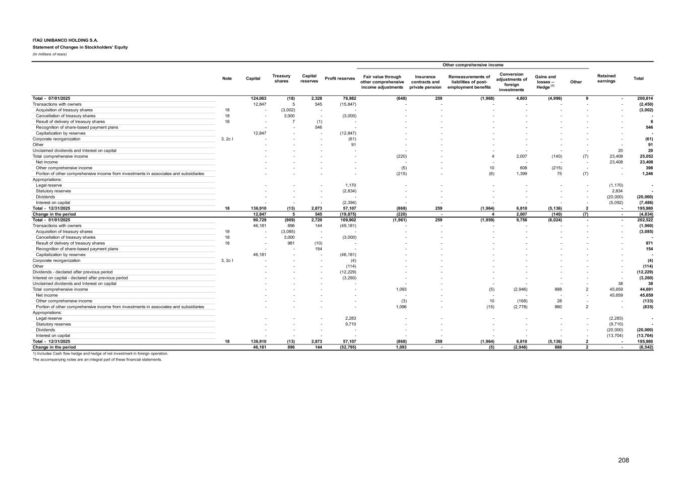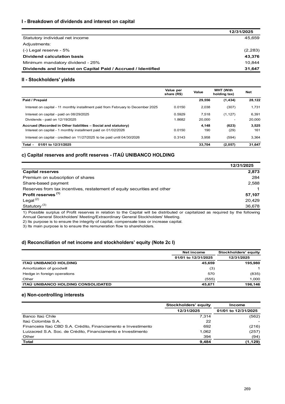 I - Breakdown of dividends and interest on capital 12/31/2025 Statutory individual net income 45,659 Adjustments: (-) Legal reserve - 5% (2,283) Dividend calculation basis 43,376 Minimum mandatory dividend - 25% 10,844 Dividends and Interest on Capital Paid / Accrued / Identified 31,647 II - Stockholders' yields Value per share (R$) Value WHT (With holding tax) Net Paid / Prepaid 29,556 (1,434) 28,122 Interest on capital - 11 monthly installment paid from February to December 2025 0.0150 2,038 (307) 1,731 Interest on capital - paid on 08/29/2025 0.5929 7,518 (1,127) 6,391 Dividends - paid on 12/19/2025 1.8682 20,000 - 20,000 Accrued (Recorded in Other liabilities – Social and statutory) 4,148 (623) 3,525 Interest on capital - 1 monthly installment paid on 01/02/2026 0.0150 190 (29) 161 Interest on capital - credited on 11/27/2025 to be paid until 04/30/2026 0.3143 3,958 (594) 3,364 Total - 01/01 to 12/31/2025 33,704 (2,057) 31,647 c) Capital reserves and profit reserves - ITAÚ UNIBANCO HOLDING 12/31/2025 Capital reserves 2,873 Premium on subscription of shares 284 Share-based payment 2,588 Reserves from tax incentives, restatement of equity securities and other 1 Profit reserves (1) 57,107 Legal (2) 20,429 Statutory (3) 36,678 1) Possible surplus of Profit reserves in relation to the Capital will be distributed or capitalized as required by the following Annual General Stockholders' Meeting/Extraordinary General Stockholders' Meeting. 2) Its purpose is to ensure the integrity of capital, compensate loss or increase capital. 3) Its main purpose is to ensure the remuneration flow to shareholders. d) Reconciliation of net income and stockholders’ equity (Note 2c I) Net income Stockholders’ equity 01/01 to 12/31/2025 12/31/2025 ITAÚ UNIBANCO HOLDING 45,659 195,980 Amortization of goodwill (3) 1 Hedge in foreign operations 570 (835) Other (555) 1,000 ITAÚ UNIBANCO HOLDING CONSOLIDATED 45,671 196,146 e) Non-controlling interests Stockholders’ equity Income 12/31/2025 01/01 to 12/31/2025 Banco Itaú Chile 7,314 (562) Itaú Colombia S.A. 22 - Financeira Itaú CBD S.A. Crédito, Financiamento e Investimento 692 (216) Luizacred S.A. Soc. de Crédito, Financiamento e Investimento 1,062 (257) Other 394 (94) Total 9,484 (1,129) 269