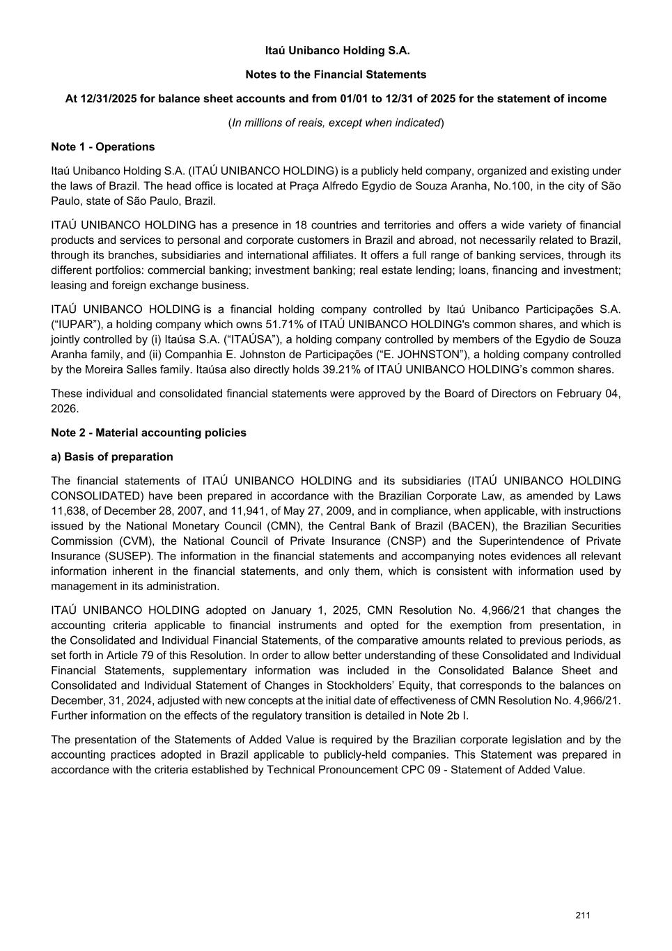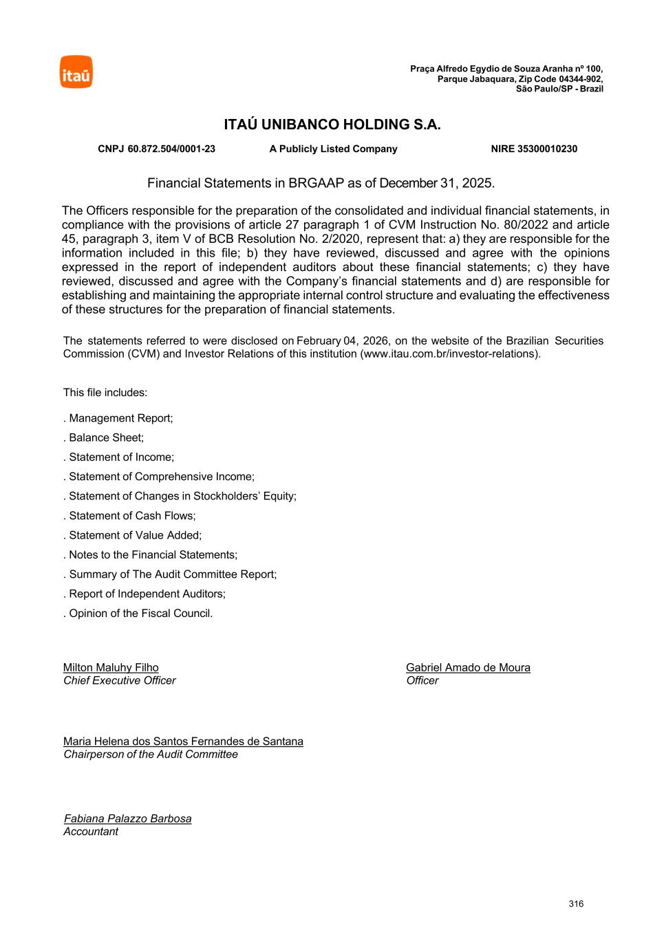 Praça Alfredo Egydio de Souza Aranha nº 100, Parque Jabaquara, Zip Code 04344-902, São Paulo/SP - Brazil ITAÚ UNIBANCO HOLDING S.A. CNPJ 60.872.504/0001-23 A Publicly Listed Company NIRE 35300010230 Financial Statements in BRGAAP as of December 31, 2025. The Officers responsible for the preparation of the consolidated and individual financial statements, in compliance with the provisions of article 27 paragraph 1 of CVM Instruction No. 80/2022 and article 45, paragraph 3, item V of BCB Resolution No. 2/2020, represent that: a) they are responsible for the information included in this file; b) they have reviewed, discussed and agree with the opinions expressed in the report of independent auditors about these financial statements; c) they have reviewed, discussed and agree with the Company’s financial statements and d) are responsible for establishing and maintaining the appropriate internal control structure and evaluating the effectiveness of these structures for the preparation of financial statements. The statements referred to were disclosed on February 04, 2026, on the website of the Brazilian Securities Commission (CVM) and Investor Relations of this institution (www.itau.com.br/investor-relations). This file includes: . Management Report; . Balance Sheet; . Statement of Income; . Statement of Comprehensive Income; . Statement of Changes in Stockholders’ Equity; . Statement of Cash Flows; . Statement of Value Added; . Notes to the Financial Statements; . Summary of The Audit Committee Report; . Report of Independent Auditors; . Opinion of the Fiscal Council. Milton Maluhy Filho Gabriel Amado de Moura Chief Executive Officer Officer Maria Helena dos Santos Fernandes de Santana Chairperson of the Audit Committee Fabiana Palazzo Barbosa Accountant 316