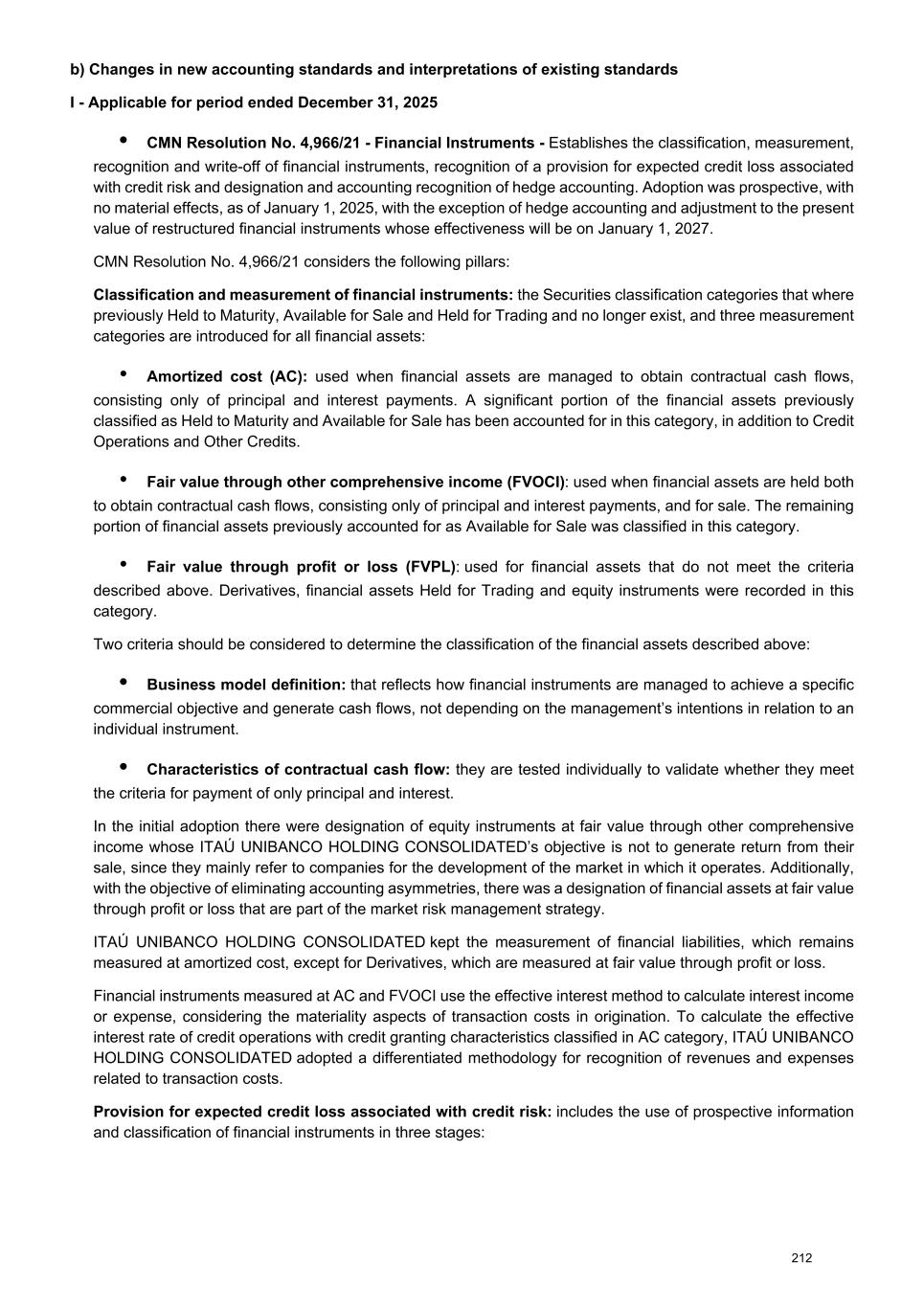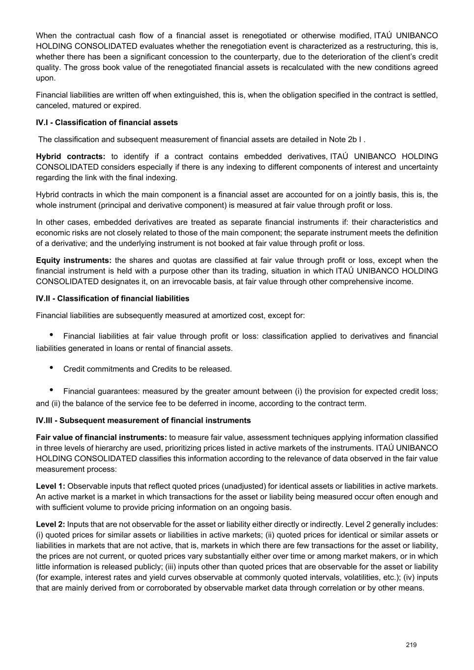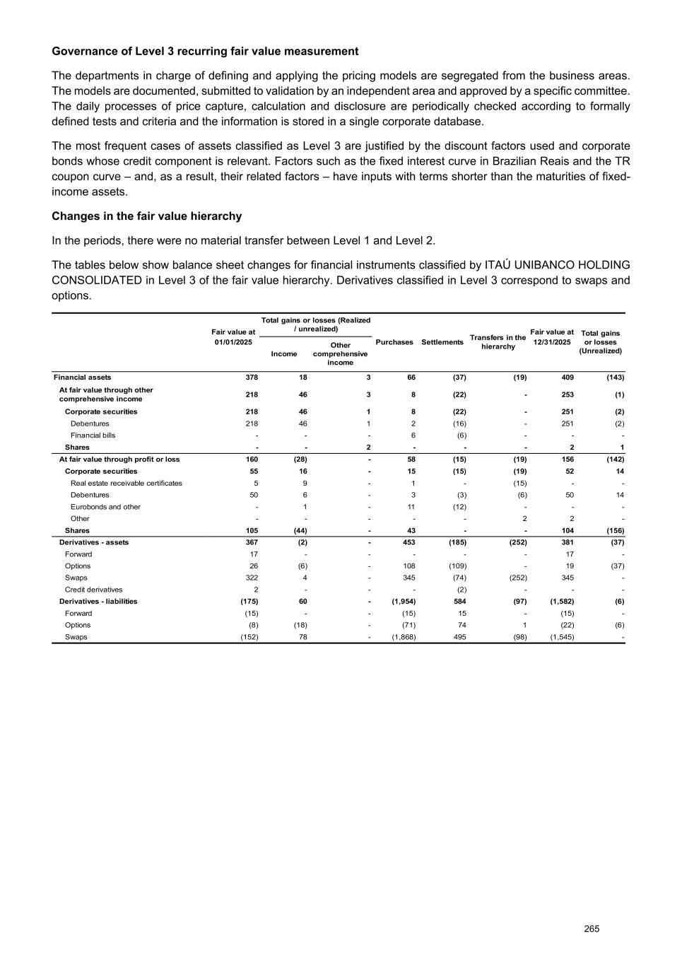 Governance of Level 3 recurring fair value measurement The departments in charge of defining and applying the pricing models are segregated from the business areas. The models are documented, submitted to validation by an independent area and approved by a specific committee. The daily processes of price capture, calculation and disclosure are periodically checked according to formally defined tests and criteria and the information is stored in a single corporate database. The most frequent cases of assets classified as Level 3 are justified by the discount factors used and corporate bonds whose credit component is relevant. Factors such as the fixed interest curve in Brazilian Reais and the TR coupon curve – and, as a result, their related factors – have inputs with terms shorter than the maturities of fixed- income assets. Changes in the fair value hierarchy In the periods, there were no material transfer between Level 1 and Level 2. The tables below show balance sheet changes for financial instruments classified by ITAÚ UNIBANCO HOLDING CONSOLIDATED in Level 3 of the fair value hierarchy. Derivatives classified in Level 3 correspond to swaps and options. Fair value at Total gains or losses (Realized / unrealized) Purchases Settlements Transfers in the hierarchy Fair value at Total gains or losses (Unrealized) 01/01/2025 Income Other comprehensive income 12/31/2025 Financial assets 378 18 3 66 (37) (19) 409 (143) At fair value through other comprehensive income 218 46 3 8 (22) - 253 (1) Corporate securities 218 46 1 8 (22) - 251 (2) Debentures 218 46 1 2 (16) - 251 (2) Financial bills - - - 6 (6) - - - Shares - - 2 - - - 2 1 At fair value through profit or loss 160 (28) - 58 (15) (19) 156 (142) Corporate securities 55 16 - 15 (15) (19) 52 14 Real estate receivable certificates 5 9 - 1 - (15) - - Debentures 50 6 - 3 (3) (6) 50 14 Eurobonds and other - 1 - 11 (12) - - - Other - - - - - 2 2 - Shares 105 (44) - 43 - - 104 (156) Derivatives - assets 367 (2) - 453 (185) (252) 381 (37) Forward 17 - - - - - 17 - Options 26 (6) - 108 (109) - 19 (37) Swaps 322 4 - 345 (74) (252) 345 - Credit derivatives 2 - - - (2) - - - Derivatives - liabilities (175) 60 - (1,954) 584 (97) (1,582) (6) Forward (15) - - (15) 15 - (15) - Options (8) (18) - (71) 74 1 (22) (6) Swaps (152) 78 - (1,868) 495 (98) (1,545) - 265