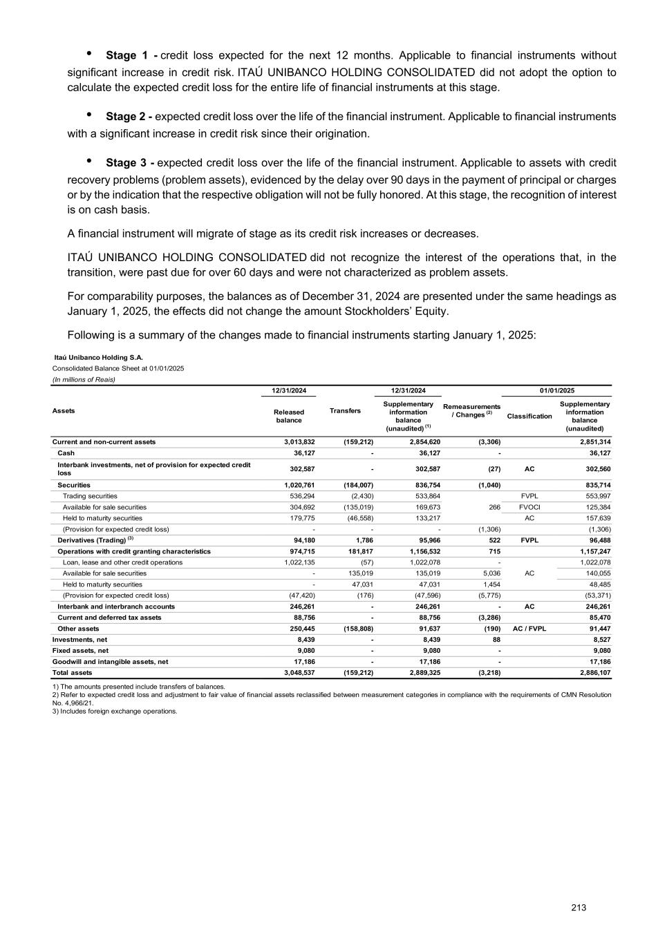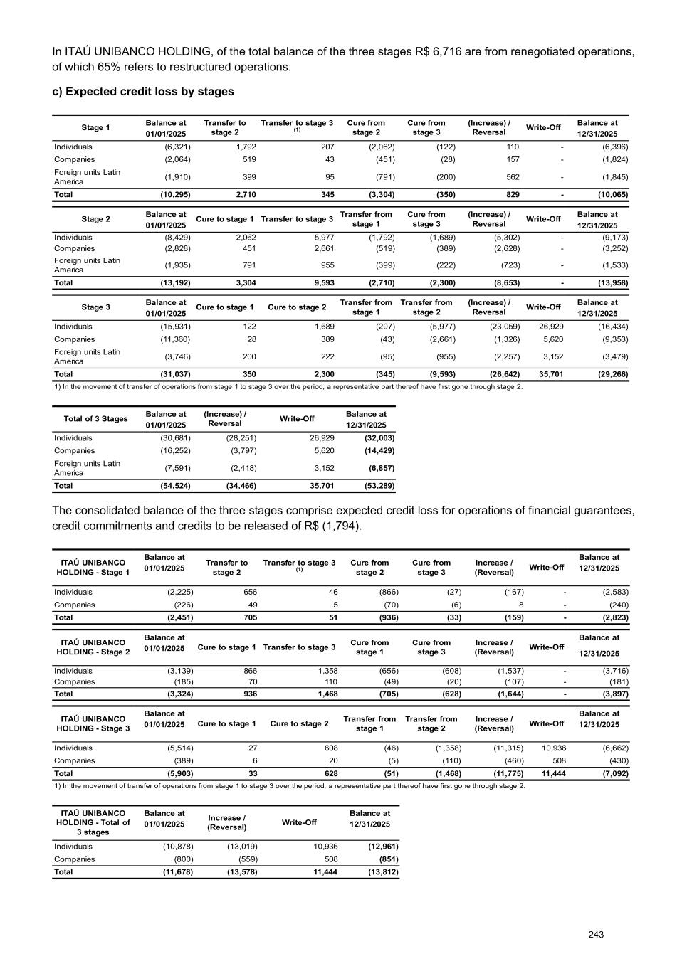 In ITAÚ UNIBANCO HOLDING, of the total balance of the three stages R$ 6,716 are from renegotiated operations, of which 65% refers to restructured operations. c) Expected credit loss by stages Stage 1 Balance at Transfer to stage 2 Transfer to stage 3 (1) Cure from stage 2 Cure from stage 3 (Increase) / Reversal Write-Off Balance at 01/01/2025 12/31/2025 Individuals (6,321) 1,792 207 (2,062) (122) 110 - (6,396) Companies (2,064) 519 43 (451) (28) 157 - (1,824) Foreign units Latin America (1,910) 399 95 (791) (200) 562 - (1,845) Total (10,295) 2,710 345 (3,304) (350) 829 - (10,065) Stage 2 Balance at Cure to stage 1 Transfer to stage 3 Transfer from stage 1 Cure from stage 3 (Increase) / Reversal Write-Off Balance at 01/01/2025 12/31/2025 Individuals (8,429) 2,062 5,977 (1,792) (1,689) (5,302) - (9,173) Companies (2,828) 451 2,661 (519) (389) (2,628) - (3,252) Foreign units Latin America (1,935) 791 955 (399) (222) (723) - (1,533) Total (13,192) 3,304 9,593 (2,710) (2,300) (8,653) - (13,958) Stage 3 Balance at Cure to stage 1 Cure to stage 2 Transfer from stage 1 Transfer from stage 2 (Increase) / Reversal Write-Off Balance at 01/01/2025 12/31/2025 Individuals (15,931) 122 1,689 (207) (5,977) (23,059) 26,929 (16,434) Companies (11,360) 28 389 (43) (2,661) (1,326) 5,620 (9,353) Foreign units Latin America (3,746) 200 222 (95) (955) (2,257) 3,152 (3,479) Total (31,037) 350 2,300 (345) (9,593) (26,642) 35,701 (29,266) 1) In the movement of transfer of operations from stage 1 to stage 3 over the period, a representative part thereof have first gone through stage 2. Total of 3 Stages Balance at (Increase) / Reversal Write-Off Balance at 01/01/2025 12/31/2025 Individuals (30,681) (28,251) 26,929 (32,003) Companies (16,252) (3,797) 5,620 (14,429) Foreign units Latin America (7,591) (2,418) 3,152 (6,857) Total (54,524) (34,466) 35,701 (53,289) The consolidated balance of the three stages comprise expected credit loss for operations of financial guarantees, credit commitments and credits to be released of R$ (1,794). ITAÚ UNIBANCO HOLDING - Stage 1 Balance at Transfer to stage 2 Transfer to stage 3 (1) Cure from stage 2 Cure from stage 3 Increase / (Reversal) Write-Off Balance at 01/01/2025 12/31/2025 Individuals (2,225) 656 46 (866) (27) (167) - (2,583) Companies (226) 49 5 (70) (6) 8 - (240) Total (2,451) 705 51 (936) (33) (159) - (2,823) ITAÚ UNIBANCO HOLDING - Stage 2 Balance at Cure to stage 1 Transfer to stage 3 Cure from stage 1 Cure from stage 3 Increase / (Reversal) Write-Off Balance at 01/01/2025 12/31/2025 Individuals (3,139) 866 1,358 (656) (608) (1,537) - (3,716) Companies (185) 70 110 (49) (20) (107) - (181) Total (3,324) 936 1,468 (705) (628) (1,644) - (3,897) ITAÚ UNIBANCO HOLDING - Stage 3 Balance at Cure to stage 1 Cure to stage 2 Transfer from stage 1 Transfer from stage 2 Increase / (Reversal) Write-Off Balance at 01/01/2025 12/31/2025 Individuals (5,514) 27 608 (46) (1,358) (11,315) 10,936 (6,662) Companies (389) 6 20 (5) (110) (460) 508 (430) Total (5,903) 33 628 (51) (1,468) (11,775) 11,444 (7,092) 1) In the movement of transfer of operations from stage 1 to stage 3 over the period, a representative part thereof have first gone through stage 2. ITAÚ UNIBANCO HOLDING - Total of 3 stages Balance at Increase / (Reversal) Write-Off Balance at 01/01/2025 12/31/2025 Individuals (10,878) (13,019) 10,936 (12,961) Companies (800) (559) 508 (851) Total (11,678) (13,578) 11,444 (13,812) 243