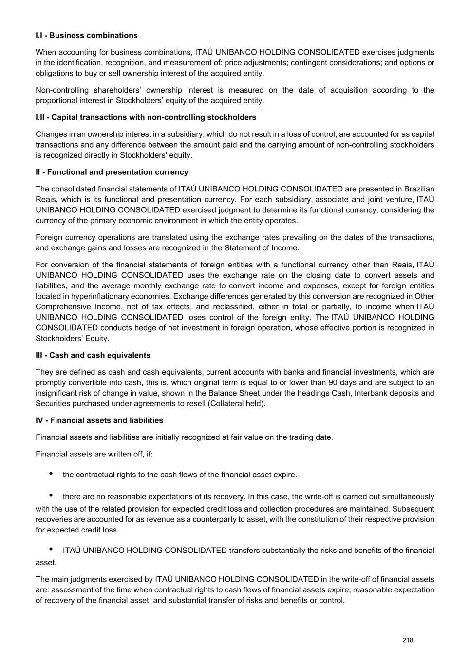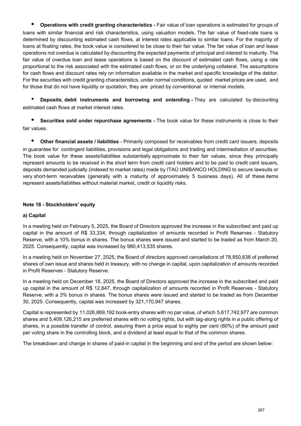 • Operations with credit granting characteristics - Fair value of loan operations is estimated for groups of loans with similar financial and risk characteristics, using valuation models. The fair value of fixed-rate loans is determined by discounting estimated cash flows, at interest rates applicable to similar loans. For the majority of loans at floating rates, the book value is considered to be close to their fair value. The fair value of loan and lease operations not overdue is calculated by discounting the expected payments of principal and interest to maturity. The fair value of overdue loan and lease operations is based on the discount of estimated cash flows, using a rate proportional to the risk associated with the estimated cash flows, or on the underlying collateral. The assumptions for cash flows and discount rates rely on information available in the market and specific knowledge of the debtor. For the securities with credit granting characteristics, under normal conditions, quoted market prices are used, and for those that do not have liquidity or quotation, they are priced by conventional or internal models. • Deposits, debit instruments and borrowing and onlending - They are calculated by discounting estimated cash flows at market interest rates. • Securities sold under repurchase agreements - The book value for these instruments is close to their fair values. • Other financial assets / liabilities - Primarily composed for receivables from credit card issuers, deposits in guarantee for contingent liabilities, provisions and legal obligations and trading and intermediation of securities. The book value for these assets/liabilities substantially approximate to their fair values, since they principally represent amounts to be received in the short term from credit card holders and to be paid to credit card issuers, deposits demanded judicially (indexed to market rates) made by ITAÚ UNIBANCO HOLDING to secure lawsuits or very short-term receivables (generally with a maturity of approximately 5 business days). All of these items represent assets/liabilities without material market, credit or liquidity risks. Note 18 - Stockholders' equity a) Capital In a meeting held on February 5, 2025, the Board of Directors approved the increase in the subscribed and paid up capital in the amount of R$ 33,334, through capitalization of amounts recorded in Profit Reserves - Statutory Reserve, with a 10% bonus in shares. The bonus shares were issued and started to be traded as from March 20, 2025. Consequently, capital was increased by 980,413,535 shares. In a meeting held on November 27, 2025, the Board of directors approved cancellations of 78,850,638 of preferred shares of own issue and shares held in treasury, with no change in capital, upon capitalization of amounts recorded in Profit Reserves - Statutory Reserve. In a meeting held on December 18, 2025, the Board of Directors approved the increase in the subscribed and paid up capital in the amount of R$ 12,847, through capitalization of amounts recorded in Profit Reserves - Statutory Reserve, with a 3% bonus in shares. The bonus shares were issued and started to be traded as from December 30, 2025. Consequently, capital was increased by 321,170,947 shares. Capital is represented by 11,026,869,192 book-entry shares with no par value, of which 5,617,742,977 are common shares and 5,409,126,215 are preferred shares with no voting rights, but with tag-along rights in a public offering of shares, in a possible transfer of control, assuring them a price equal to eighty per cent (80%) of the amount paid per voting share in the controlling block, and a dividend at least equal to that of the common shares. The breakdown and change in shares of paid-in capital in the beginning and end of the period are shown below: 267