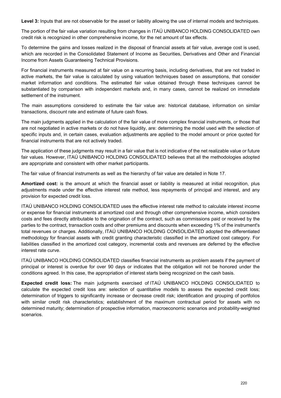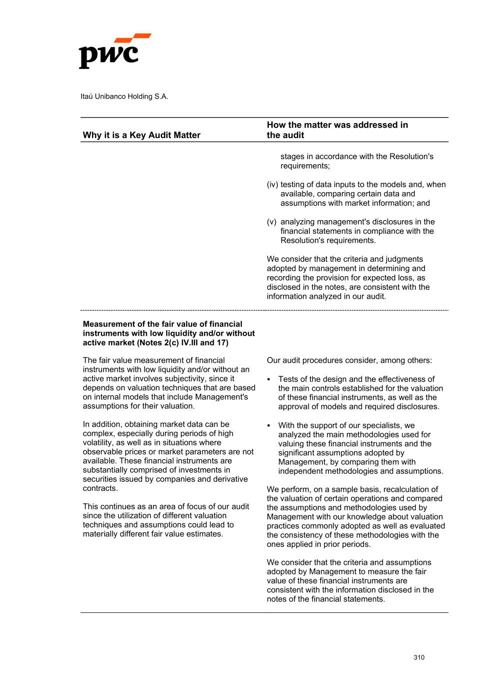 Itaú Unibanco Holding S.A. Why it is a Key Audit Matter How the matter was addressed in the audit stages in accordance with the Resolution's requirements; (iv) testing of data inputs to the models and, when available, comparing certain data and assumptions with market information; and (v) analyzing management's disclosures in the financial statements in compliance with the Resolution's requirements. We consider that the criteria and judgments adopted by management in determining and recording the provision for expected loss, as disclosed in the notes, are consistent with the information analyzed in our audit. Measurement of the fair value of financial instruments with low liquidity and/or without active market (Notes 2(c) IV.III and 17) The fair value measurement of financial instruments with low liquidity and/or without an active market involves subjectivity, since it depends on valuation techniques that are based on internal models that include Management's assumptions for their valuation. In addition, obtaining market data can be complex, especially during periods of high volatility, as well as in situations where observable prices or market parameters are not available. These financial instruments are substantially comprised of investments in securities issued by companies and derivative contracts. This continues as an area of focus of our audit since the utilization of different valuation techniques and assumptions could lead to materially different fair value estimates. Our audit procedures consider, among others: Tests of the design and the effectiveness of the main controls established for the valuation of these financial instruments, as well as the approval of models and required disclosures. With the support of our specialists, we analyzed the main methodologies used for valuing these financial instruments and the significant assumptions adopted by Management, by comparing them with independent methodologies and assumptions. We perform, on a sample basis, recalculation of the valuation of certain operations and compared the assumptions and methodologies used by Management with our knowledge about valuation practices commonly adopted as well as evaluated the consistency of these methodologies with the ones applied in prior periods. We consider that the criteria and assumptions adopted by Management to measure the fair value of these financial instruments are consistent with the information disclosed in the notes of the financial statements. 310