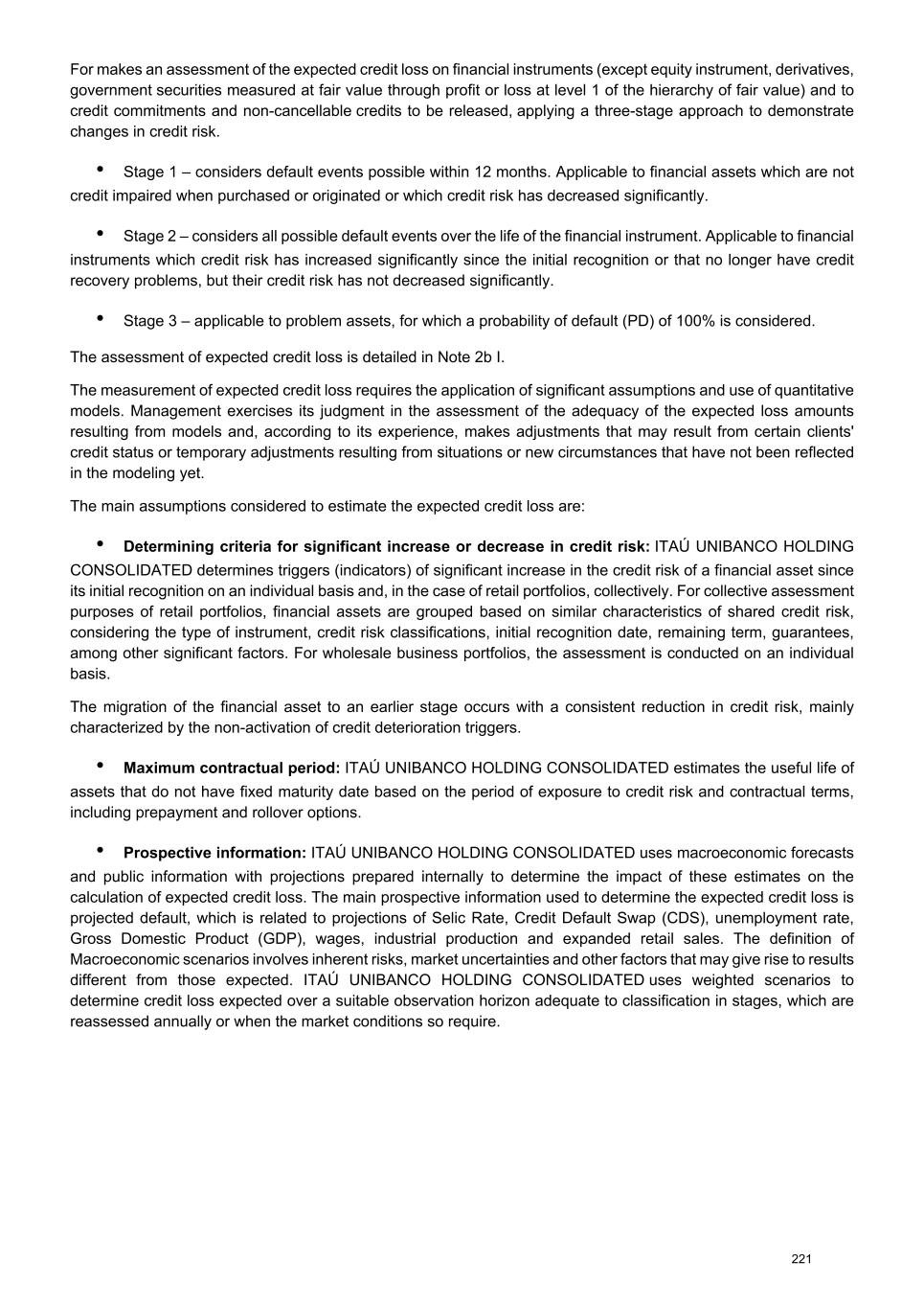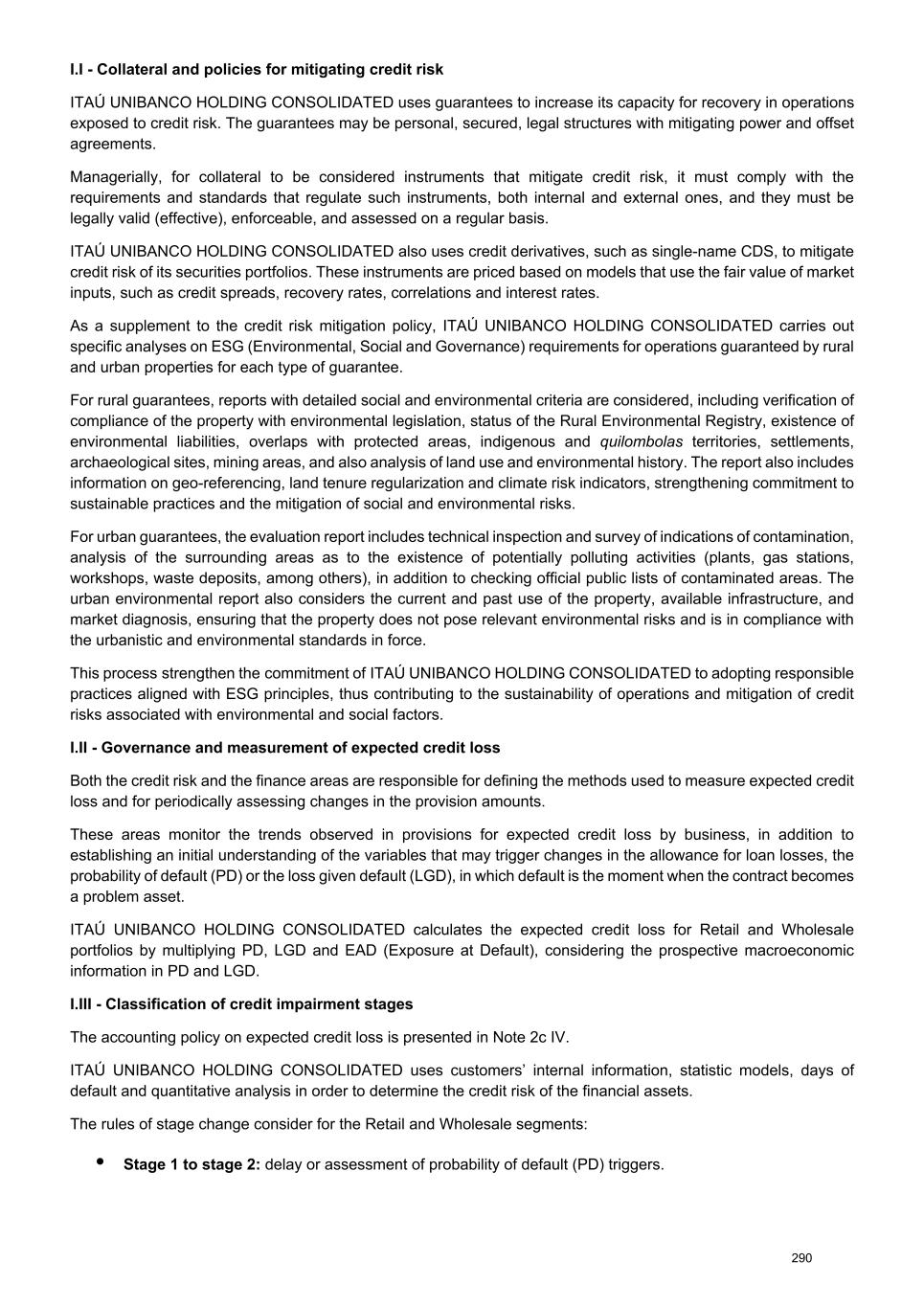 I.I - Collateral and policies for mitigating credit risk ITAÚ UNIBANCO HOLDING CONSOLIDATED uses guarantees to increase its capacity for recovery in operations exposed to credit risk. The guarantees may be personal, secured, legal structures with mitigating power and offset agreements. Managerially, for collateral to be considered instruments that mitigate credit risk, it must comply with the requirements and standards that regulate such instruments, both internal and external ones, and they must be legally valid (effective), enforceable, and assessed on a regular basis. ITAÚ UNIBANCO HOLDING CONSOLIDATED also uses credit derivatives, such as single-name CDS, to mitigate credit risk of its securities portfolios. These instruments are priced based on models that use the fair value of market inputs, such as credit spreads, recovery rates, correlations and interest rates. As a supplement to the credit risk mitigation policy, ITAÚ UNIBANCO HOLDING CONSOLIDATED carries out specific analyses on ESG (Environmental, Social and Governance) requirements for operations guaranteed by rural and urban properties for each type of guarantee. For rural guarantees, reports with detailed social and environmental criteria are considered, including verification of compliance of the property with environmental legislation, status of the Rural Environmental Registry, existence of environmental liabilities, overlaps with protected areas, indigenous and quilombolas territories, settlements, archaeological sites, mining areas, and also analysis of land use and environmental history. The report also includes information on geo-referencing, land tenure regularization and climate risk indicators, strengthening commitment to sustainable practices and the mitigation of social and environmental risks. For urban guarantees, the evaluation report includes technical inspection and survey of indications of contamination, analysis of the surrounding areas as to the existence of potentially polluting activities (plants, gas stations, workshops, waste deposits, among others), in addition to checking official public lists of contaminated areas. The urban environmental report also considers the current and past use of the property, available infrastructure, and market diagnosis, ensuring that the property does not pose relevant environmental risks and is in compliance with the urbanistic and environmental standards in force. This process strengthen the commitment of ITAÚ UNIBANCO HOLDING CONSOLIDATED to adopting responsible practices aligned with ESG principles, thus contributing to the sustainability of operations and mitigation of credit risks associated with environmental and social factors. I.II - Governance and measurement of expected credit loss Both the credit risk and the finance areas are responsible for defining the methods used to measure expected credit loss and for periodically assessing changes in the provision amounts. These areas monitor the trends observed in provisions for expected credit loss by business, in addition to establishing an initial understanding of the variables that may trigger changes in the allowance for loan losses, the probability of default (PD) or the loss given default (LGD), in which default is the moment when the contract becomes a problem asset. ITAÚ UNIBANCO HOLDING CONSOLIDATED calculates the expected credit loss for Retail and Wholesale portfolios by multiplying PD, LGD and EAD (Exposure at Default), considering the prospective macroeconomic information in PD and LGD. I.III - Classification of credit impairment stages The accounting policy on expected credit loss is presented in Note 2c IV. ITAÚ UNIBANCO HOLDING CONSOLIDATED uses customers’ internal information, statistic models, days of default and quantitative analysis in order to determine the credit risk of the financial assets. The rules of stage change consider for the Retail and Wholesale segments: • Stage 1 to stage 2: delay or assessment of probability of default (PD) triggers. 290