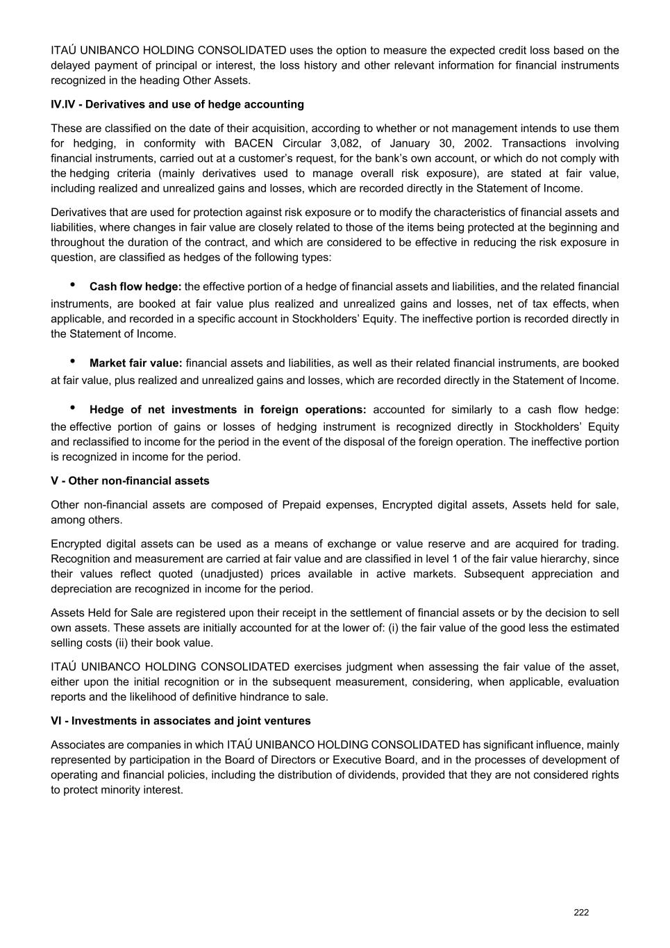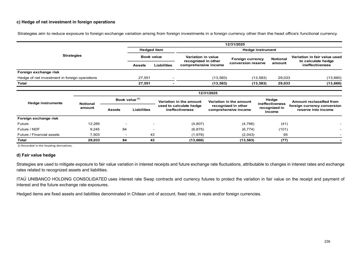 c) Hedge of net investment in foreign operations Strategies aim to reduce exposure to foreign exchange variation arising from foreign investments in a foreign currency other than the head office’s functional currency. Strategies 12/31/2025 Hedged item Hedge instrument Book value Variation in value recognized in other comprehensive income Foreign currency conversion reserve Notional amount Variation in fair value used to calculate hedge ineffectivenessAssets Liabilities Foreign exchange risk Hedge of net investment in foreign operations 27,551 - (13,583) (13,583) 29,033 (13,660) Total 27,551 - (13,583) (13,583) 29,033 (13,660) Hedge instruments 12/31/2025 Notional amount Book value (1) Variation in the amount used to calculate hedge ineffectiveness Variation in the amount recognized in other comprehensive income Hedge ineffectiveness recognized in income Amount reclassified from foreign currency conversion reserve into incomeAssets Liabilities Foreign exchange risk Future 12,285 - - (4,807) (4,766) (41) - Future / NDF 9,245 84 - (6,875) (6,774) (101) - Future / Financial assets 7,503 - 43 (1,978) (2,043) 65 - Total 29,033 84 43 (13,660) (13,583) (77) - 1) Recorded in the heading derivatives. d) Fair value hedge Strategies are used to mitigate exposure to fair value variation in interest receipts and future exchange rate fluctuations, attributable to changes in interest rates and exchange rates related to recognized assets and liabilities. ITAÚ UNIBANCO HOLDING CONSOLIDATED uses interest rate Swap contracts and currency futures to protect the variation in fair value on the receipt and payment of interest and the future exchange rate exposures. Hedged items are fixed assets and liabilities denominated in Chilean unit of account, fixed rate, in reais and/or foreign currencies. 239
