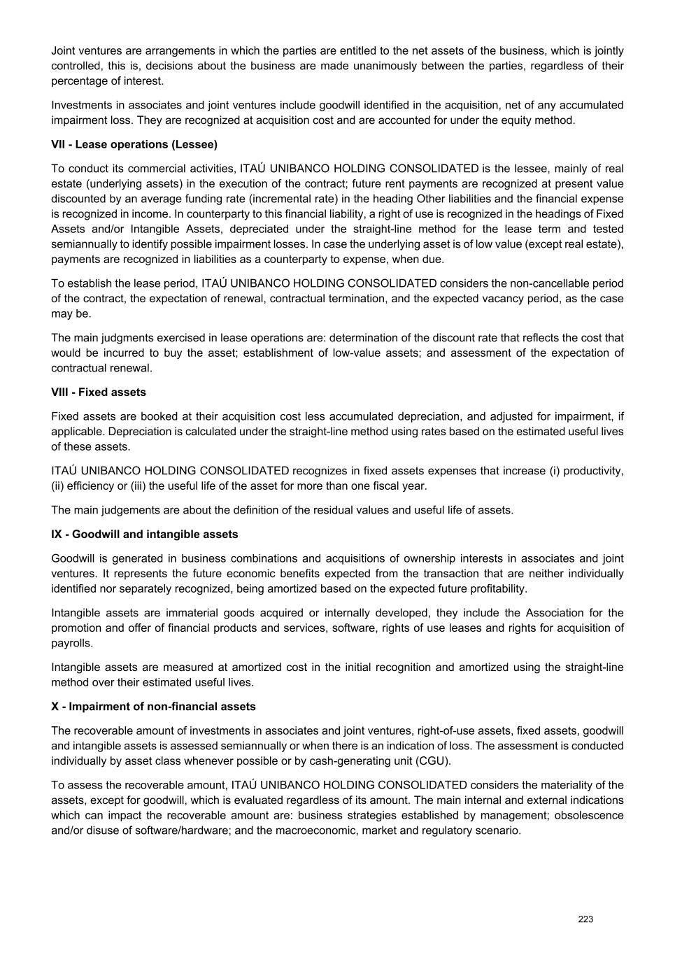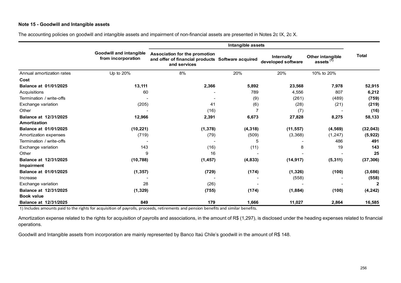 Note 15 - Goodwill and Intangible assets The accounting policies on goodwill and intangible assets and impairment of non-financial assets are presented in Notes 2c IX, 2c X. Goodwill and intangible from incorporation Intangible assets TotalAssociation for the promotion and offer of financial products and services Software acquired Internally developed software Other intangible assets (1) Annual amortization rates Up to 20% 8% 20% 20% 10% to 20% Cost Balance at 01/01/2025 13,111 2,366 5,892 23,568 7,978 52,915 Acquisitions 60 - 789 4,556 807 6,212 Termination / write-offs - - (9) (261) (489) (759) Exchange variation (205) 41 (6) (28) (21) (219) Other - (16) 7 (7) - (16) Balance at 12/31/2025 12,966 2,391 6,673 27,828 8,275 58,133 Amortization Balance at 01/01/2025 (10,221) (1,378) (4,318) (11,557) (4,569) (32,043) Amortization expenses (719) (79) (509) (3,368) (1,247) (5,922) Termination / write-offs - - 5 - 486 491 Exchange variation 143 (16) (11) 8 19 143 Other 9 16 - - - 25 Balance at 12/31/2025 (10,788) (1,457) (4,833) (14,917) (5,311) (37,306) Impairment Balance at 01/01/2025 (1,357) (729) (174) (1,326) (100) (3,686) Increase - - - (558) - (558) Exchange variation 28 (26) - - - 2 Balance at 12/31/2025 (1,329) (755) (174) (1,884) (100) (4,242) Book value Balance at 12/31/2025 849 179 1,666 11,027 2,864 16,585 1) Includes amounts paid to the rights for acquisition of payrolls, proceeds, retirements and pension benefits and similar benefits. Amortization expense related to the rights for acquisition of payrolls and associations, in the amount of R$ (1,297), is disclosed under the heading expenses related to financial operations. Goodwill and Intangible assets from incorporation are mainly represented by Banco Itaú Chile’s goodwill in the amount of R$ 148. 256