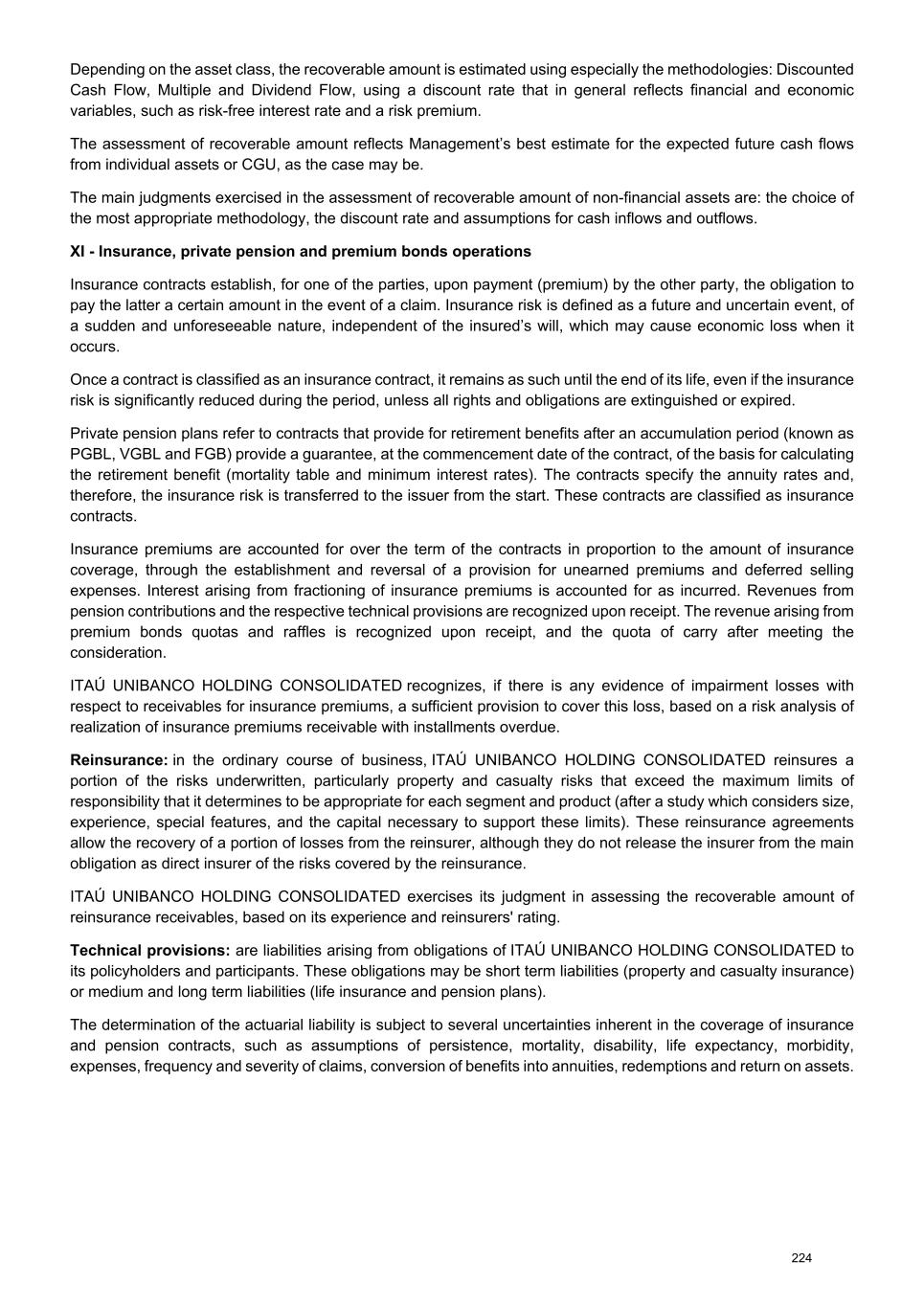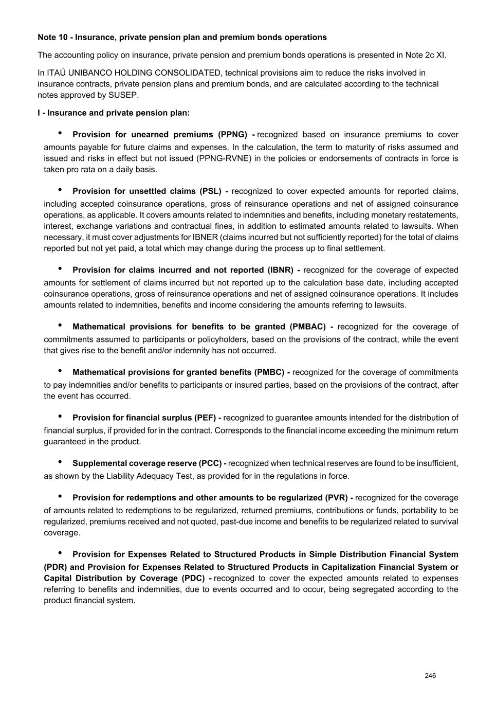Note 10 - Insurance, private pension plan and premium bonds operations The accounting policy on insurance, private pension and premium bonds operations is presented in Note 2c XI. In ITAÚ UNIBANCO HOLDING CONSOLIDATED, technical provisions aim to reduce the risks involved in insurance contracts, private pension plans and premium bonds, and are calculated according to the technical notes approved by SUSEP. I - Insurance and private pension plan: • Provision for unearned premiums (PPNG) - recognized based on insurance premiums to cover amounts payable for future claims and expenses. In the calculation, the term to maturity of risks assumed and issued and risks in effect but not issued (PPNG-RVNE) in the policies or endorsements of contracts in force is taken pro rata on a daily basis. • Provision for unsettled claims (PSL) - recognized to cover expected amounts for reported claims, including accepted coinsurance operations, gross of reinsurance operations and net of assigned coinsurance operations, as applicable. It covers amounts related to indemnities and benefits, including monetary restatements, interest, exchange variations and contractual fines, in addition to estimated amounts related to lawsuits. When necessary, it must cover adjustments for IBNER (claims incurred but not sufficiently reported) for the total of claims reported but not yet paid, a total which may change during the process up to final settlement. • Provision for claims incurred and not reported (IBNR) - recognized for the coverage of expected amounts for settlement of claims incurred but not reported up to the calculation base date, including accepted coinsurance operations, gross of reinsurance operations and net of assigned coinsurance operations. It includes amounts related to indemnities, benefits and income considering the amounts referring to lawsuits. • Mathematical provisions for benefits to be granted (PMBAC) - recognized for the coverage of commitments assumed to participants or policyholders, based on the provisions of the contract, while the event that gives rise to the benefit and/or indemnity has not occurred. • Mathematical provisions for granted benefits (PMBC) - recognized for the coverage of commitments to pay indemnities and/or benefits to participants or insured parties, based on the provisions of the contract, after the event has occurred. • Provision for financial surplus (PEF) - recognized to guarantee amounts intended for the distribution of financial surplus, if provided for in the contract. Corresponds to the financial income exceeding the minimum return guaranteed in the product. • Supplemental coverage reserve (PCC) - recognized when technical reserves are found to be insufficient, as shown by the Liability Adequacy Test, as provided for in the regulations in force. • Provision for redemptions and other amounts to be regularized (PVR) - recognized for the coverage of amounts related to redemptions to be regularized, returned premiums, contributions or funds, portability to be regularized, premiums received and not quoted, past-due income and benefits to be regularized related to survival coverage. • Provision for Expenses Related to Structured Products in Simple Distribution Financial System (PDR) and Provision for Expenses Related to Structured Products in Capitalization Financial System or Capital Distribution by Coverage (PDC) - recognized to cover the expected amounts related to expenses referring to benefits and indemnities, due to events occurred and to occur, being segregated according to the product financial system. 246