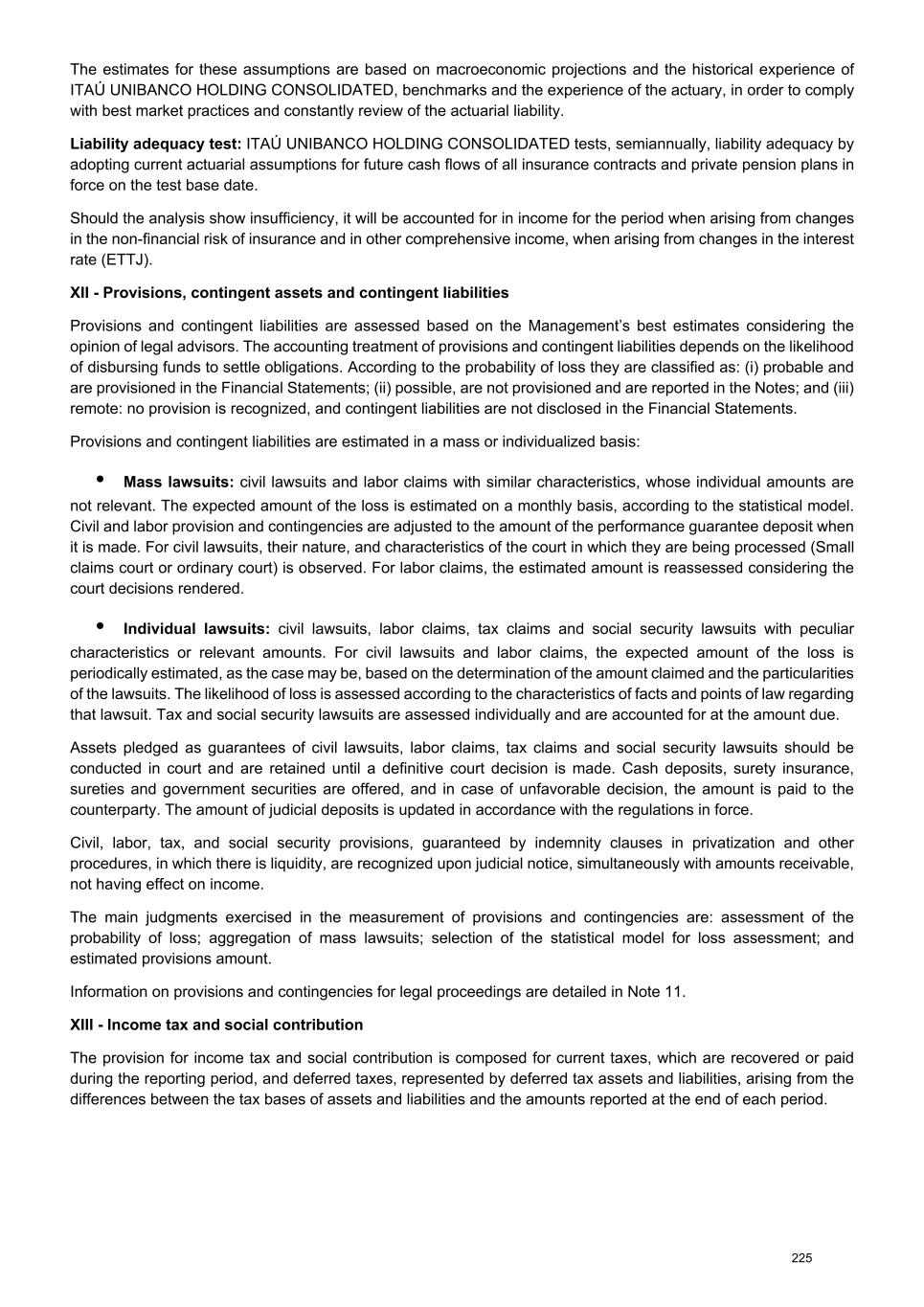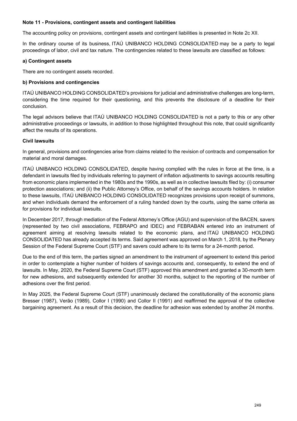 Note 11 - Provisions, contingent assets and contingent liabilities The accounting policy on provisions, contingent assets and contingent liabilities is presented in Note 2c XII. In the ordinary course of its business, ITAÚ UNIBANCO HOLDING CONSOLIDATED may be a party to legal proceedings of labor, civil and tax nature. The contingencies related to these lawsuits are classified as follows: a) Contingent assets There are no contingent assets recorded. b) Provisions and contingencies ITAÚ UNIBANCO HOLDING CONSOLIDATED’s provisions for judicial and administrative challenges are long-term, considering the time required for their questioning, and this prevents the disclosure of a deadline for their conclusion. The legal advisors believe that ITAÚ UNIBANCO HOLDING CONSOLIDATED is not a party to this or any other administrative proceedings or lawsuits, in addition to those highlighted throughout this note, that could significantly affect the results of its operations. Civil lawsuits In general, provisions and contingencies arise from claims related to the revision of contracts and compensation for material and moral damages. ITAÚ UNIBANCO HOLDING CONSOLIDATED, despite having complied with the rules in force at the time, is a defendant in lawsuits filed by individuals referring to payment of inflation adjustments to savings accounts resulting from economic plans implemented in the 1980s and the 1990s, as well as in collective lawsuits filed by: (i) consumer protection associations; and (ii) the Public Attorney’s Office, on behalf of the savings accounts holders. In relation to these lawsuits, ITAÚ UNIBANCO HOLDING CONSOLIDATED recognizes provisions upon receipt of summons, and when individuals demand the enforcement of a ruling handed down by the courts, using the same criteria as for provisions for individual lawsuits. In December 2017, through mediation of the Federal Attorney’s Office (AGU) and supervision of the BACEN, savers (represented by two civil associations, FEBRAPO and IDEC) and FEBRABAN entered into an instrument of agreement aiming at resolving lawsuits related to the economic plans, and ITAÚ UNIBANCO HOLDING CONSOLIDATED has already accepted its terms. Said agreement was approved on March 1, 2018, by the Plenary Session of the Federal Supreme Court (STF) and savers could adhere to its terms for a 24-month period. Due to the end of this term, the parties signed an amendment to the instrument of agreement to extend this period in order to contemplate a higher number of holders of savings accounts and, consequently, to extend the end of lawsuits. In May, 2020, the Federal Supreme Court (STF) approved this amendment and granted a 30-month term for new adhesions, and subsequently extended for another 30 months, subject to the reporting of the number of adhesions over the first period. In May 2025, the Federal Supreme Court (STF) unanimously declared the constitutionality of the economic plans Bresser (1987), Verão (1989), Collor I (1990) and Collor II (1991) and reaffirmed the approval of the collective bargaining agreement. As a result of this decision, the deadline for adhesion was extended by another 24 months. 249