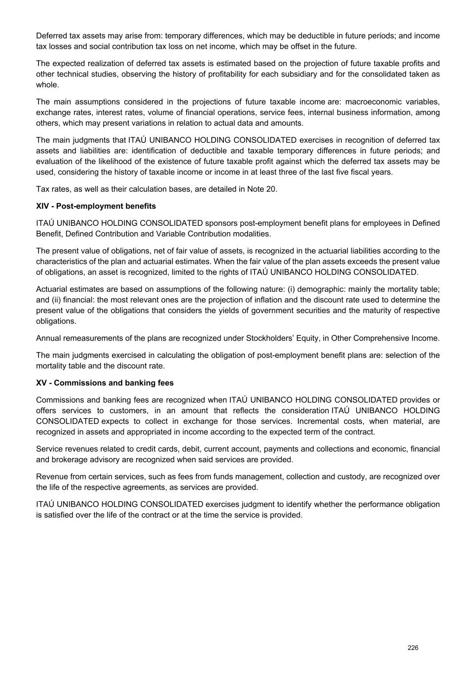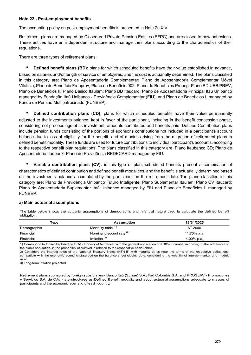 Note 22 - Post-employment benefits The accounting policy on post-employment benefits is presented in Note 2c XIV. Retirement plans are managed by Closed-end Private Pension Entities (EFPC) and are closed to new adhesions. These entities have an independent structure and manage their plans according to the characteristics of their regulations. There are three types of retirement plans: • Defined benefit plans (BD): plans for which scheduled benefits have their value established in advance, based on salaries and/or length of service of employees, and the cost is actuarially determined. The plans classified in this category are: Plano de Aposentadoria Complementar; Plano de Aposentadoria Complementar Móvel Vitalícia; Plano de Benefício Franprev; Plano de Benefício 002; Plano de Benefícios Prebeg; Plano BD UBB PREV; Plano de Benefícios II; Plano Básico Itaulam; Plano BD Itaucard; Plano de Aposentadoria Principal Itaú Unibanco managed by Fundação Itaú Unibanco - Previdência Complementar (FIU); and Plano de Benefícios I, managed by Fundo de Pensão Multipatrocinado (FUNBEP). • Defined contribution plans (CD): plans for which scheduled benefits have their value permanently adjusted to the investments balance, kept in favor of the participant, including in the benefit concession phase, considering net proceedings of its investment, amounts contributed and benefits paid. Defined Contribution plans include pension funds consisting of the portions of sponsor's contributions not included in a participant's account balance due to loss of eligibility for the benefit, and of monies arising from the migration of retirement plans in defined benefit modality. These funds are used for future contributions to individual participant's accounts, according to the respective benefit plan regulations. The plans classified in this category are: Plano Itaubanco CD; Plano de Aposentadoria Itaubank; Plano de Previdência REDECARD managed by FIU. • Variable contribution plans (CV): in this type of plan, scheduled benefits present a combination of characteristics of defined contribution and defined benefit modalities, and the benefit is actuarially determined based on the investments balance accumulated by the participant on the retirement date. The plans classified in this category are: Plano de Previdência Unibanco Futuro Inteligente; Plano Suplementar Itaulam; Plano CV Itaucard; Plano de Aposentadoria Suplementar Itaú Unibanco managed by FIU and Plano de Benefícios II managed by FUNBEP. a) Main actuarial assumptions The table below shows the actuarial assumptions of demographic and financial nature used to calculate the defined benefit obligation: Type Assumption 12/31/2025 Demographic Mortality table (1) AT-2000 Financial Nominal discount rate (2) 11.70% a.a. Financial Inflation (3) 4.00% p.a. 1) Correspond to those disclosed by SOA - Society of Actuaries, with the general application of a 10% increase, according to the adherence to the plan's population, in the probability of survival in relation to the respesctive basic tables. 2) Considers the interest rates of the National Treasury Notes (NTN-B) with maturity dates near the terms of the respective obligations, compatible with the economic scenario observed on the balance sheet closing date, considering the volatility of interest market and models used. 3) Long-term inflation projected. Retirement plans sponsored by foreign subsidiaries - Banco Itaú (Suisse) S.A., Itaú Colombia S.A. and PROSERV - Promociones y Servicios S.A. de C.V. - are structured as Defined Benefit modality and adopt actuarial assumptions adequate to masses of participants and the economic scenario of each country. 279