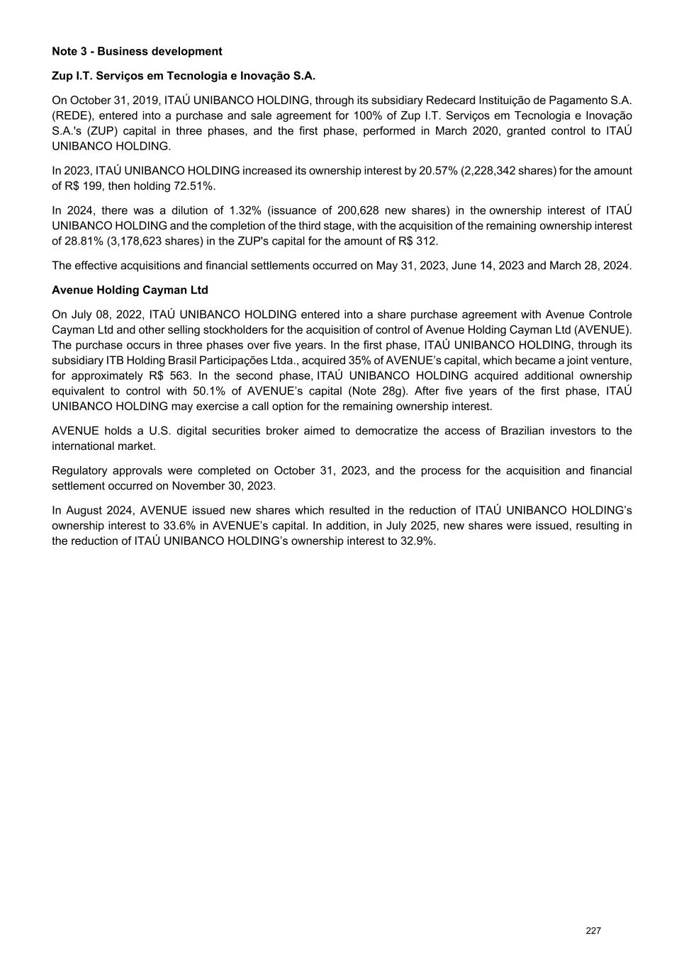Effective acquisitions and financial settlements will occur after the necessary regulatory approvals. g) Subsequent event Avenue Holding Cayman Ltd On January 30, 2026, ITAÚ UNIBANCO HOLDING, through its subsidiary ITB Holding Brasil Participações Ltda., acquired an additional 17.2% ownership interest in Avenue Holding Cayman Ltd and started holding control of the company with a 50.1% ownership in total capital. The acquisition results from the second stage of the agreement for the purchase and sale of shares entered into in July 2022. Effective acquisitions and financial settlements occurred after the required regulatory approvals. 303