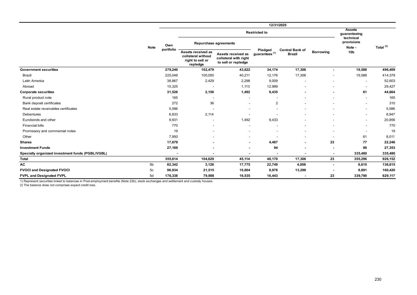 12/31/2025 Note Own portfolio Restricted to Assets guaranteeing technical provisions Total (2) Repurchase agreements Pledged guarantees (1) Central Bank of Brazil Borrowing Note - Assets received as collateral without right to sell or repledge Assets received as collateral with right to sell or repledge 10b Government securities 279,240 102,479 43,622 34,174 17,306 - 19,588 496,409 Brazil 225,048 100,050 40,211 12,176 17,306 - 19,588 414,379 Latin America 38,867 2,429 2,298 9,009 - - - 52,603 Abroad 15,325 - 1,113 12,989 - - - 29,427 Corporate securities 31,526 2,150 1,492 9,435 - - 61 44,664 Rural product note 165 - - - - - - 165 Bank deposit certificates 272 36 - 2 - - - 310 Real estate receivables certificates 5,586 - - - - - - 5,586 Debentures 6,833 2,114 - - - - - 8,947 Eurobonds and other 9,931 - 1,492 9,433 - - - 20,856 Financial bills 770 - - - - - - 770 Promissory and commercial notes 19 - - - - - - 19 Other 7,950 - - - - - 61 8,011 Shares 17,679 - - 4,467 - 23 77 22,246 Investment Funds 27,169 - - 94 - - 90 27,353 Specially organized investment funds (PGBL/VGBL) - - - - - - 335,480 335,480 Total 355,614 104,629 45,114 48,170 17,306 23 355,296 926,152 AC 5b 82,342 3,126 17,775 22,749 4,008 - 6,615 136,615 FVOCI and Designated FVOCI 5c 96,934 21,515 10,804 8,978 13,298 - 8,891 160,420 FVPL and Designated FVPL 5d 176,338 79,988 16,535 16,443 - 23 339,790 629,117 1) Represent securities linked to balances in Post-employment benefits (Note 22b), stock exchanges and settlement and custody houses. 2) The balance does not comprises expect credit loss. 230