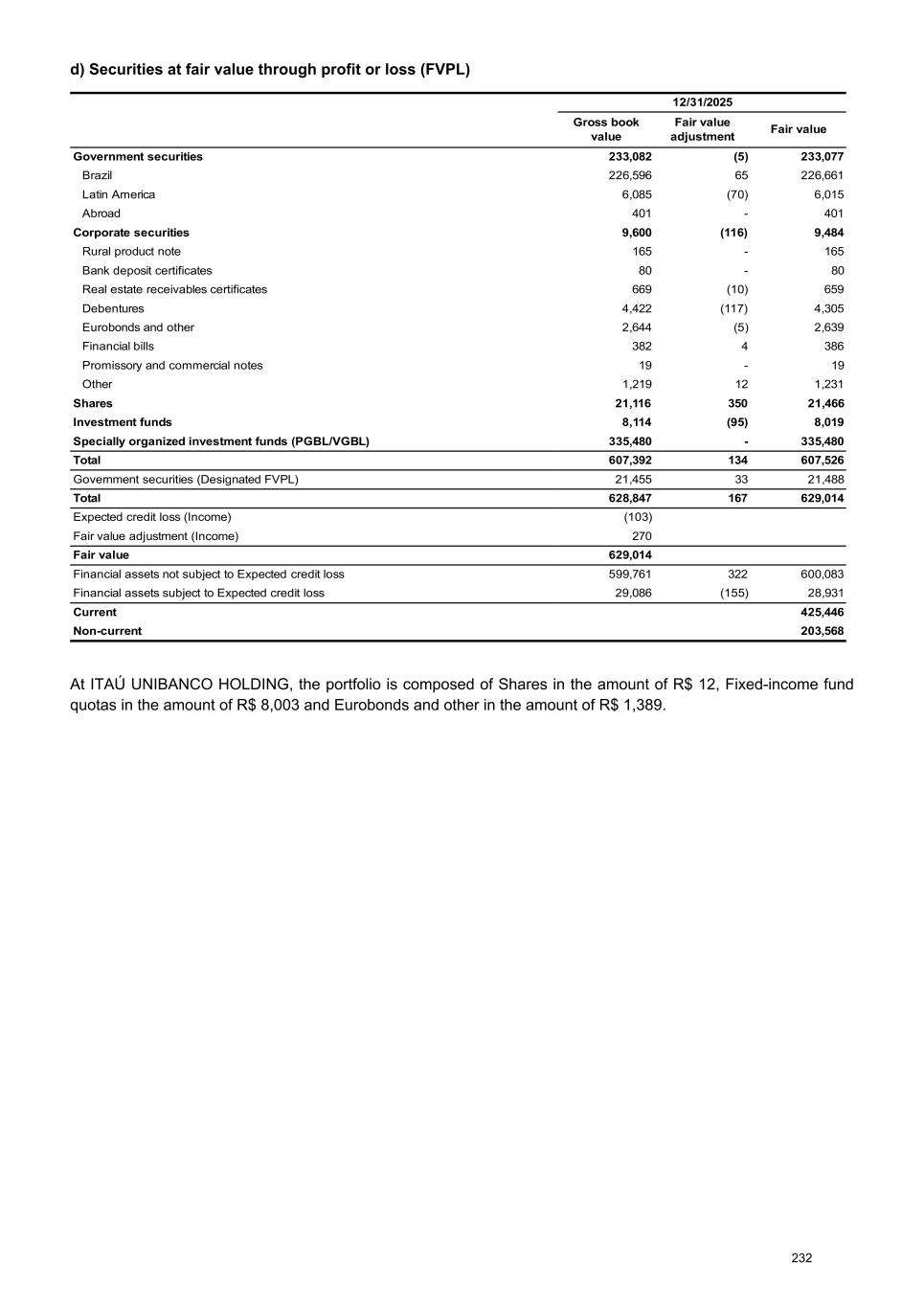 d) Securities at fair value through profit or loss (FVPL) 12/31/2025 Gross book value Fair value adjustment Fair value Government securities 233,082 (5) 233,077 Brazil 226,596 65 226,661 Latin America 6,085 (70) 6,015 Abroad 401 - 401 Corporate securities 9,600 (116) 9,484 Rural product note 165 - 165 Bank deposit certificates 80 - 80 Real estate receivables certificates 669 (10) 659 Debentures 4,422 (117) 4,305 Eurobonds and other 2,644 (5) 2,639 Financial bills 382 4 386 Promissory and commercial notes 19 - 19 Other 1,219 12 1,231 Shares 21,116 350 21,466 Investment funds 8,114 (95) 8,019 Specially organized investment funds (PGBL/VGBL) 335,480 - 335,480 Total 607,392 134 607,526 Government securities (Designated FVPL) 21,455 33 21,488 Total 628,847 167 629,014 Expected credit loss (Income) (103) Fair value adjustment (Income) 270 Fair value 629,014 Financial assets not subject to Expected credit loss 599,761 322 600,083 Financial assets subject to Expected credit loss 29,086 (155) 28,931 Current 425,446 Non-current 203,568 At ITAÚ UNIBANCO HOLDING, the portfolio is composed of Shares in the amount of R$ 12, Fixed-income fund quotas in the amount of R$ 8,003 and Eurobonds and other in the amount of R$ 1,389. 232