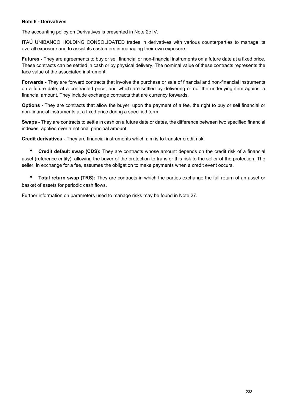 Note 6 - Derivatives The accounting policy on Derivatives is presented in Note 2c IV. ITAÚ UNIBANCO HOLDING CONSOLIDATED trades in derivatives with various counterparties to manage its overall exposure and to assist its customers in managing their own exposure. Futures - They are agreements to buy or sell financial or non-financial instruments on a future date at a fixed price. These contracts can be settled in cash or by physical delivery. The nominal value of these contracts represents the face value of the associated instrument. Forwards - They are forward contracts that involve the purchase or sale of financial and non-financial instruments on a future date, at a contracted price, and which are settled by delivering or not the underlying item against a financial amount. They include exchange contracts that are currency forwards. Options - They are contracts that allow the buyer, upon the payment of a fee, the right to buy or sell financial or non-financial instruments at a fixed price during a specified term. Swaps - They are contracts to settle in cash on a future date or dates, the difference between two specified financial indexes, applied over a notional principal amount. Credit derivatives - They are financial instruments which aim is to transfer credit risk: • Credit default swap (CDS): They are contracts whose amount depends on the credit risk of a financial asset (reference entity), allowing the buyer of the protection to transfer this risk to the seller of the protection. The seller, in exchange for a fee, assumes the obligation to make payments when a credit event occurs. • Total return swap (TRS): They are contracts in which the parties exchange the full return of an asset or basket of assets for periodic cash flows. Further information on parameters used to manage risks may be found in Note 27. 233
