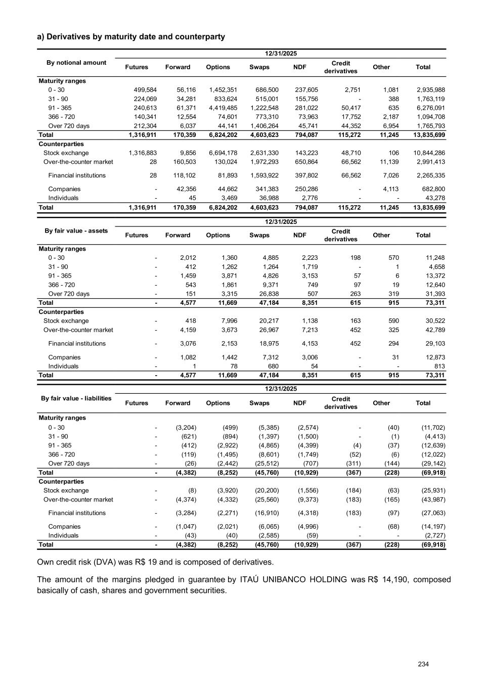 a) Derivatives by maturity date and counterparty By notional amount 12/31/2025 Futures Forward Options Swaps NDF Credit derivatives Other Total Maturity ranges 0 - 30 499,584 56,116 1,452,351 686,500 237,605 2,751 1,081 2,935,988 31 - 90 224,069 34,281 833,624 515,001 155,756 - 388 1,763,119 91 - 365 240,613 61,371 4,419,485 1,222,548 281,022 50,417 635 6,276,091 366 - 720 140,341 12,554 74,601 773,310 73,963 17,752 2,187 1,094,708 Over 720 days 212,304 6,037 44,141 1,406,264 45,741 44,352 6,954 1,765,793 Total 1,316,911 170,359 6,824,202 4,603,623 794,087 115,272 11,245 13,835,699 Counterparties Stock exchange 1,316,883 9,856 6,694,178 2,631,330 143,223 48,710 106 10,844,286 Over-the-counter market 28 160,503 130,024 1,972,293 650,864 66,562 11,139 2,991,413 Financial institutions 28 118,102 81,893 1,593,922 397,802 66,562 7,026 2,265,335 Companies - 42,356 44,662 341,383 250,286 - 4,113 682,800 Individuals - 45 3,469 36,988 2,776 - - 43,278 Total 1,316,911 170,359 6,824,202 4,603,623 794,087 115,272 11,245 13,835,699 By fair value - assets 12/31/2025 Futures Forward Options Swaps NDF Credit derivatives Other Total Maturity ranges 0 - 30 - 2,012 1,360 4,885 2,223 198 570 11,248 31 - 90 - 412 1,262 1,264 1,719 - 1 4,658 91 - 365 - 1,459 3,871 4,826 3,153 57 6 13,372 366 - 720 - 543 1,861 9,371 749 97 19 12,640 Over 720 days - 151 3,315 26,838 507 263 319 31,393 Total - 4,577 11,669 47,184 8,351 615 915 73,311 Counterparties Stock exchange - 418 7,996 20,217 1,138 163 590 30,522 Over-the-counter market - 4,159 3,673 26,967 7,213 452 325 42,789 Financial institutions - 3,076 2,153 18,975 4,153 452 294 29,103 Companies - 1,082 1,442 7,312 3,006 - 31 12,873 Individuals - 1 78 680 54 - - 813 Total - 4,577 11,669 47,184 8,351 615 915 73,311 By fair value - liabilities 12/31/2025 Futures Forward Options Swaps NDF Credit derivatives Other Total Maturity ranges 0 - 30 - (3,204) (499) (5,385) (2,574) - (40) (11,702) 31 - 90 - (621) (894) (1,397) (1,500) - (1) (4,413) 91 - 365 - (412) (2,922) (4,865) (4,399) (4) (37) (12,639) 366 - 720 - (119) (1,495) (8,601) (1,749) (52) (6) (12,022) Over 720 days - (26) (2,442) (25,512) (707) (311) (144) (29,142) Total - (4,382) (8,252) (45,760) (10,929) (367) (228) (69,918) Counterparties Stock exchange - (8) (3,920) (20,200) (1,556) (184) (63) (25,931) Over-the-counter market - (4,374) (4,332) (25,560) (9,373) (183) (165) (43,987) Financial institutions - (3,284) (2,271) (16,910) (4,318) (183) (97) (27,063) Companies - (1,047) (2,021) (6,065) (4,996) - (68) (14,197) Individuals - (43) (40) (2,585) (59) - - (2,727) Total - (4,382) (8,252) (45,760) (10,929) (367) (228) (69,918) Own credit risk (DVA) was R$ 19 and is composed of derivatives. The amount of the margins pledged in guarantee by ITAÚ UNIBANCO HOLDING was R$ 14,190, composed basically of cash, shares and government securities. 234