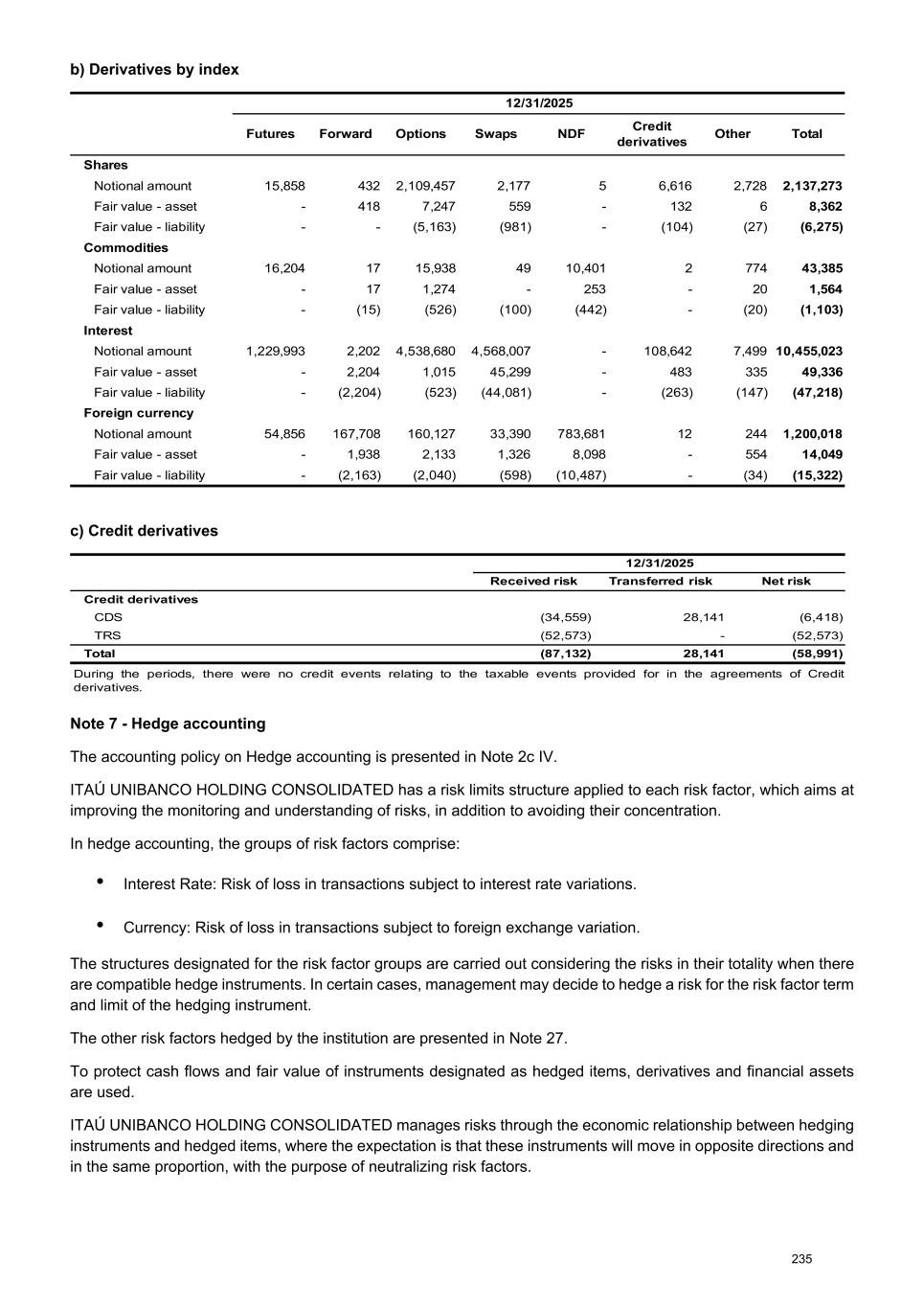b) Derivatives by index 12/31/2025 Futures Forward Options Swaps NDF Credit derivatives Other Total Shares Notional amount 15,858 432 2,109,457 2,177 5 6,616 2,728 2,137,273 Fair value - asset - 418 7,247 559 - 132 6 8,362 Fair value - liability - - (5,163) (981) - (104) (27) (6,275) Commodities Notional amount 16,204 17 15,938 49 10,401 2 774 43,385 Fair value - asset - 17 1,274 - 253 - 20 1,564 Fair value - liability - (15) (526) (100) (442) - (20) (1,103) Interest Notional amount 1,229,993 2,202 4,538,680 4,568,007 - 108,642 7,499 10,455,023 Fair value - asset - 2,204 1,015 45,299 - 483 335 49,336 Fair value - liability - (2,204) (523) (44,081) - (263) (147) (47,218) Foreign currency Notional amount 54,856 167,708 160,127 33,390 783,681 12 244 1,200,018 Fair value - asset - 1,938 2,133 1,326 8,098 - 554 14,049 Fair value - liability - (2,163) (2,040) (598) (10,487) - (34) (15,322) c) Credit derivatives 12/31/2025 Received risk Transferred risk Net risk Credit derivatives CDS (34,559) 28,141 (6,418) TRS (52,573) - (52,573) Total (87,132) 28,141 (58,991) During the periods, there were no credit events relating to the taxable events provided for in the agreements of Credit derivatives. Note 7 - Hedge accounting The accounting policy on Hedge accounting is presented in Note 2c IV. ITAÚ UNIBANCO HOLDING CONSOLIDATED has a risk limits structure applied to each risk factor, which aims at improving the monitoring and understanding of risks, in addition to avoiding their concentration. In hedge accounting, the groups of risk factors comprise: • Interest Rate: Risk of loss in transactions subject to interest rate variations. • Currency: Risk of loss in transactions subject to foreign exchange variation. The structures designated for the risk factor groups are carried out considering the risks in their totality when there are compatible hedge instruments. In certain cases, management may decide to hedge a risk for the risk factor term and limit of the hedging instrument. The other risk factors hedged by the institution are presented in Note 27. To protect cash flows and fair value of instruments designated as hedged items, derivatives and financial assets are used. ITAÚ UNIBANCO HOLDING CONSOLIDATED manages risks through the economic relationship between hedging instruments and hedged items, where the expectation is that these instruments will move in opposite directions and in the same proportion, with the purpose of neutralizing risk factors. 235