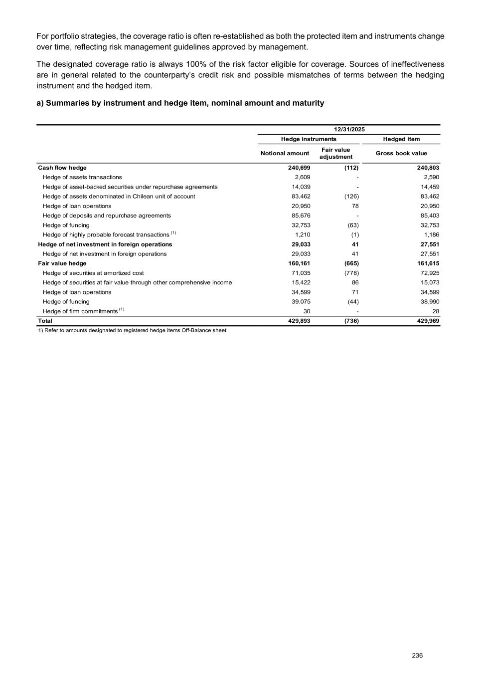 For portfolio strategies, the coverage ratio is often re-established as both the protected item and instruments change over time, reflecting risk management guidelines approved by management. The designated coverage ratio is always 100% of the risk factor eligible for coverage. Sources of ineffectiveness are in general related to the counterparty’s credit risk and possible mismatches of terms between the hedging instrument and the hedged item. a) Summaries by instrument and hedge item, nominal amount and maturity 12/31/2025 Hedge instruments Hedged item Notional amount Fair value adjustment Gross book value Cash flow hedge 240,699 (112) 240,803 Hedge of assets transactions 2,609 - 2,590 Hedge of asset-backed securities under repurchase agreements 14,039 - 14,459 Hedge of assets denominated in Chilean unit of account 83,462 (126) 83,462 Hedge of loan operations 20,950 78 20,950 Hedge of deposits and repurchase agreements 85,676 - 85,403 Hedge of funding 32,753 (63) 32,753 Hedge of highly probable forecast transactions (1) 1,210 (1) 1,186 Hedge of net investment in foreign operations 29,033 41 27,551 Hedge of net investment in foreign operations 29,033 41 27,551 Fair value hedge 160,161 (665) 161,615 Hedge of securities at amortized cost 71,035 (778) 72,925 Hedge of securities at fair value through other comprehensive income 15,422 86 15,073 Hedge of loan operations 34,599 71 34,599 Hedge of funding 39,075 (44) 38,990 Hedge of firm commitments (1) 30 - 28 Total 429,893 (736) 429,969 1) Refer to amounts designated to registered hedge items Off-Balance sheet. 236
