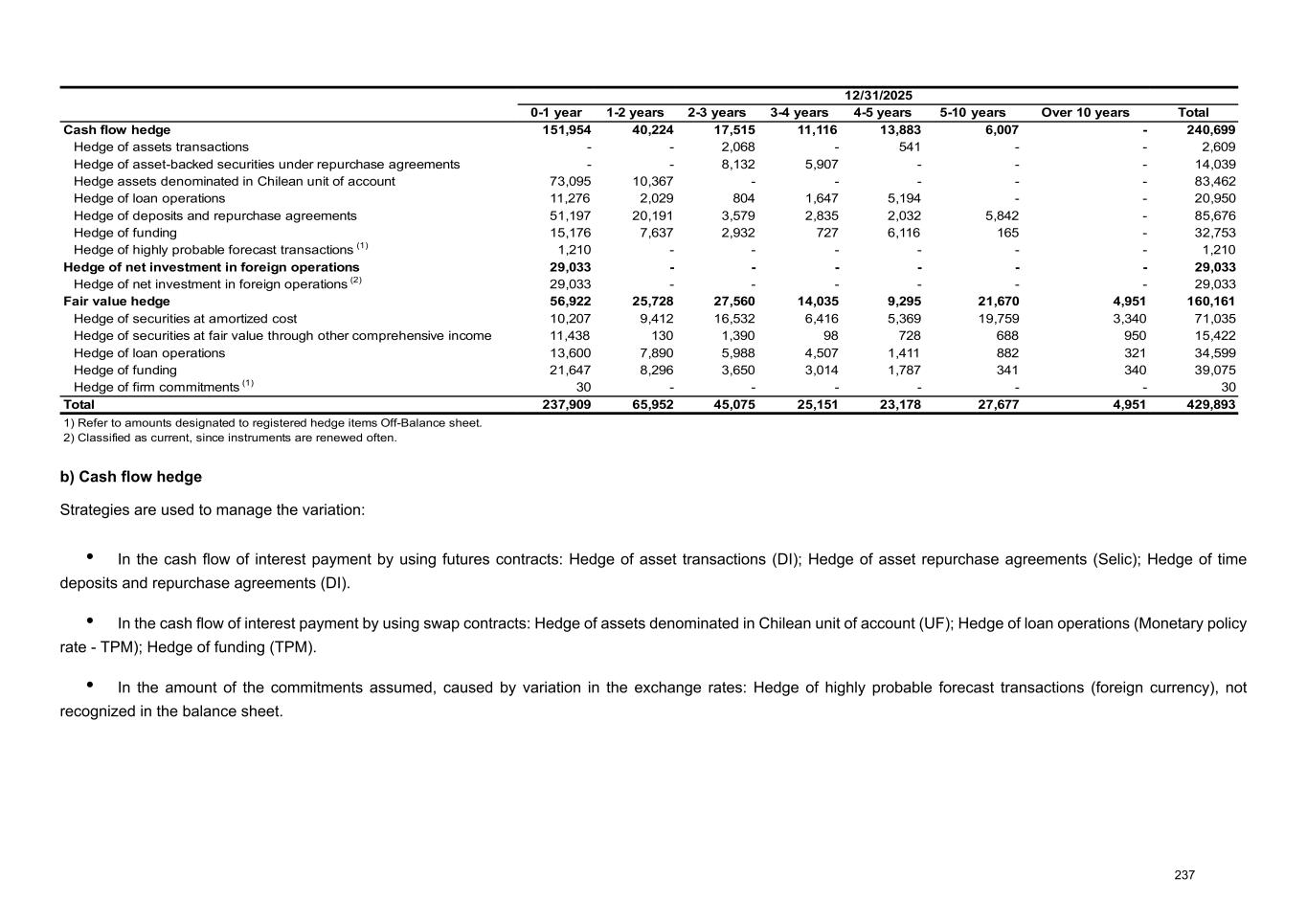 12/31/2025 0-1 year 1-2 years 2-3 years 3-4 years 4-5 years 5-10 years Over 10 years Total Cash flow hedge 151,954 40,224 17,515 11,116 13,883 6,007 - 240,699 Hedge of assets transactions - - 2,068 - 541 - - 2,609 Hedge of asset-backed securities under repurchase agreements - - 8,132 5,907 - - - 14,039 Hedge assets denominated in Chilean unit of account 73,095 10,367 - - - - - 83,462 Hedge of loan operations 11,276 2,029 804 1,647 5,194 - - 20,950 Hedge of deposits and repurchase agreements 51,197 20,191 3,579 2,835 2,032 5,842 - 85,676 Hedge of funding 15,176 7,637 2,932 727 6,116 165 - 32,753 Hedge of highly probable forecast transactions (1) 1,210 - - - - - - 1,210 Hedge of net investment in foreign operations 29,033 - - - - - - 29,033 Hedge of net investment in foreign operations (2) 29,033 - - - - - - 29,033 Fair value hedge 56,922 25,728 27,560 14,035 9,295 21,670 4,951 160,161 Hedge of securities at amortized cost 10,207 9,412 16,532 6,416 5,369 19,759 3,340 71,035 Hedge of securities at fair value through other comprehensive income 11,438 130 1,390 98 728 688 950 15,422 Hedge of loan operations 13,600 7,890 5,988 4,507 1,411 882 321 34,599 Hedge of funding 21,647 8,296 3,650 3,014 1,787 341 340 39,075 Hedge of firm commitments (1) 30 - - - - - - 30 Total 237,909 65,952 45,075 25,151 23,178 27,677 4,951 429,893 1) Refer to amounts designated to registered hedge items Off-Balance sheet. 2) Classified as current, since instruments are renewed often. b) Cash flow hedge Strategies are used to manage the variation: • In the cash flow of interest payment by using futures contracts: Hedge of asset transactions (DI); Hedge of asset repurchase agreements (Selic); Hedge of time deposits and repurchase agreements (DI). • In the cash flow of interest payment by using swap contracts: Hedge of assets denominated in Chilean unit of account (UF); Hedge of loan operations (Monetary policy rate - TPM); Hedge of funding (TPM). • In the amount of the commitments assumed, caused by variation in the exchange rates: Hedge of highly probable forecast transactions (foreign currency), not recognized in the balance sheet. 237