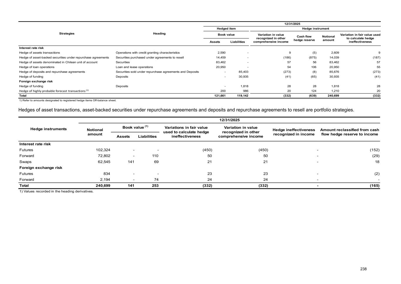 Strategies Heading 12/31/2025 Hedged item Hedge instrument Book value Variation in value recognized in other comprehensive income Cash flow hedge reserve Notional amount Variation in fair value used to calculate hedge ineffectivenessAssets Liabilities Interest rate risk Hedge of assets transactions Operations with credit granting characteristics 2,590 - 9 (5) 2,609 9 Hedge of asset-backed securities under repurchase agreements Securities purchased under agreements to resell 14,459 - (186) (875) 14,039 (187) Hedge of assets denominated in Chilean unit of account Securities 83,462 - 57 56 83,462 57 Hedge of loan operations Loan and lease operations 20,950 - 54 106 20,950 55 Hedge of deposits and repurchase agreements Securities sold under repurchase agreements and Deposits - 85,403 (273) (8) 85,676 (273) Hedge of funding Deposits - 30,935 (41) (65) 30,935 (41) Foreign exchange risk Hedge of funding Deposits - 1,818 28 28 1,818 28 Hedge of highly probable forecast transactions (1) 200 986 20 124 1,210 20 Total 121,661 119,142 (332) (639) 240,699 (332) 1) Refer to amounts designated to registered hedge items Off-balance sheet. Hedges of asset transactions, asset-backed securities under repurchase agreements and deposits and repurchase agreements to resell are portfolio strategies. Hedge instruments 12/31/2025 Notional amount Book value (1) Variations in fair value used to calculate hedge ineffectiveness Variation in value recognized in other comprehensive income Hedge ineffectiveness recognized in income Amount reclassified from cash flow hedge reserve to incomeAssets Liabilities Interest rate risk Futures 102,324 - - (450) (450) - (152) Forward 72,802 - 110 50 50 - (29) Swaps 62,545 141 69 21 21 - 18 Foreign exchange risk Futures 834 - - 23 23 - (2) Forward 2,194 - 74 24 24 - - Total 240,699 141 253 (332) (332) - (165) 1) Values recorded in the heading derivatives. 238