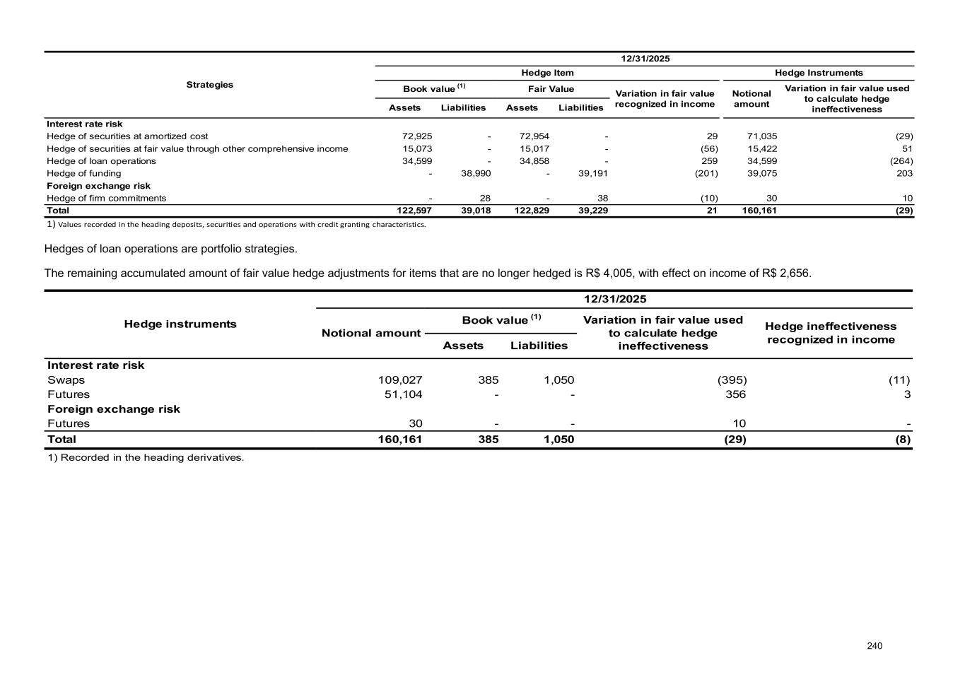 Strategies 12/31/2025 Hedge Item Hedge Instruments Book value (1) Fair Value Variation in fair value recognized in income Notional amount Variation in fair value used to calculate hedge ineffectivenessAssets Liabilities Assets Liabilities Interest rate risk Hedge of securities at amortized cost 72,925 - 72,954 - 29 71,035 (29) Hedge of securities at fair value through other comprehensive income 15,073 - 15,017 - (56) 15,422 51 Hedge of loan operations 34,599 - 34,858 - 259 34,599 (264) Hedge of funding - 38,990 - 39,191 (201) 39,075 203 Foreign exchange risk Hedge of firm commitments - 28 - 38 (10) 30 10 Total 122,597 39,018 122,829 39,229 21 160,161 (29) 1) Values recorded in the heading deposits, securities and operations with credit granting characteristics. Hedges of loan operations are portfolio strategies. The remaining accumulated amount of fair value hedge adjustments for items that are no longer hedged is R$ 4,005, with effect on income of R$ 2,656. Hedge instruments 12/31/2025 Notional amount Book value (1) Variation in fair value used to calculate hedge ineffectiveness Hedge ineffectiveness recognized in incomeAssets Liabilities Interest rate risk Swaps 109,027 385 1,050 (395) (11) Futures 51,104 - - 356 3 Foreign exchange risk Futures 30 - - 10 - Total 160,161 385 1,050 (29) (8) 1) Recorded in the heading derivatives. 240