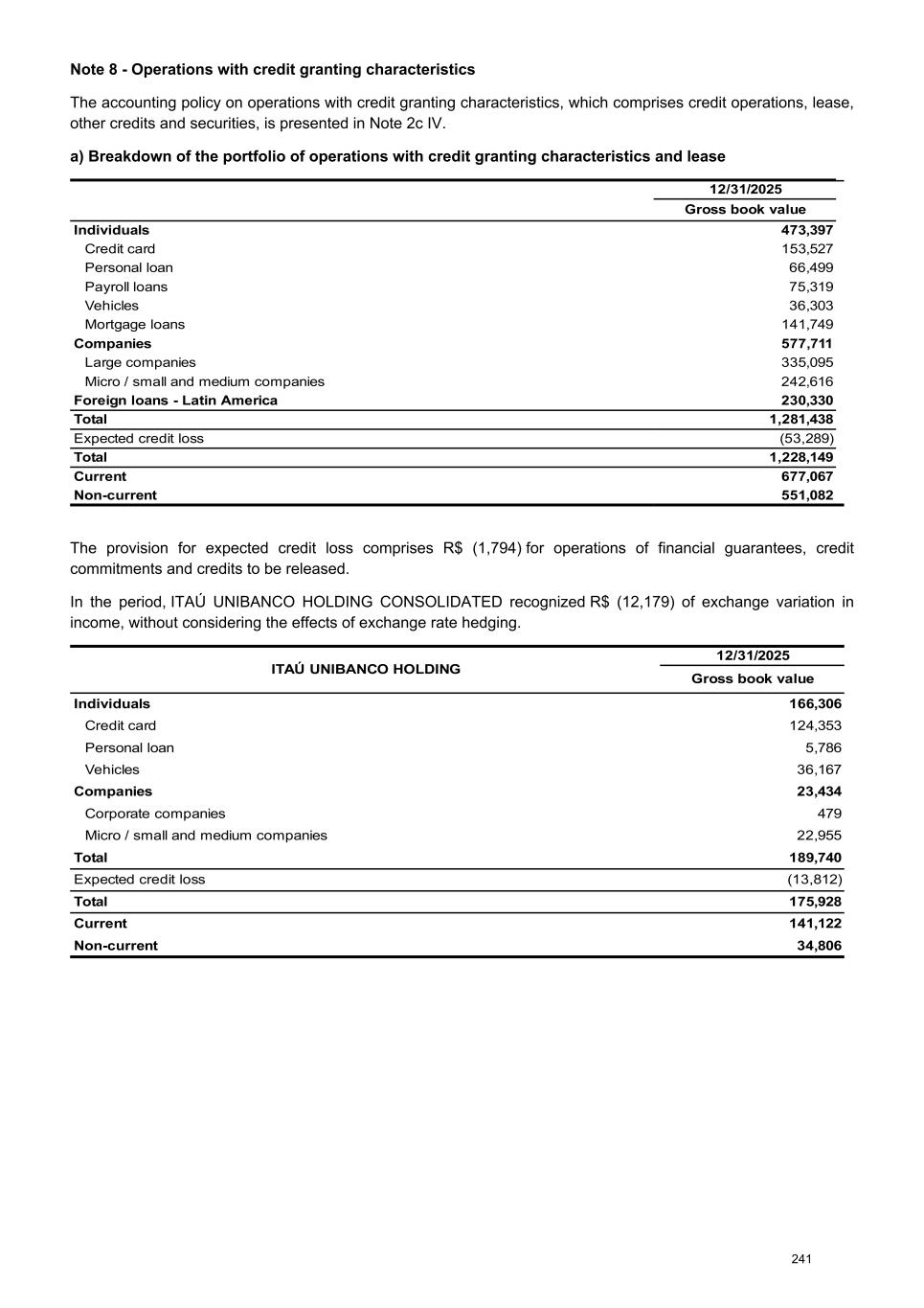 Note 8 - Operations with credit granting characteristics The accounting policy on operations with credit granting characteristics, which comprises credit operations, lease, other credits and securities, is presented in Note 2c IV. a) Breakdown of the portfolio of operations with credit granting characteristics and lease 12/31/2025 Gross book value Individuals 473,397 Credit card 153,527 Personal loan 66,499 Payroll loans 75,319 Vehicles 36,303 Mortgage loans 141,749 Companies 577,711 Large companies 335,095 Micro / small and medium companies 242,616 Foreign loans - Latin America 230,330 Total 1,281,438 Expected credit loss (53,289) Total 1,228,149 Current 677,067 Non-current 551,082 The provision for expected credit loss comprises R$ (1,794) for operations of financial guarantees, credit commitments and credits to be released. In the period, ITAÚ UNIBANCO HOLDING CONSOLIDATED recognized R$ (12,179) of exchange variation in income, without considering the effects of exchange rate hedging. ITAÚ UNIBANCO HOLDING 12/31/2025 Gross book value Individuals 166,306 Credit card 124,353 Personal loan 5,786 Vehicles 36,167 Companies 23,434 Corporate companies 479 Micro / small and medium companies 22,955 Total 189,740 Expected credit loss (13,812) Total 175,928 Current 141,122 Non-current 34,806 241