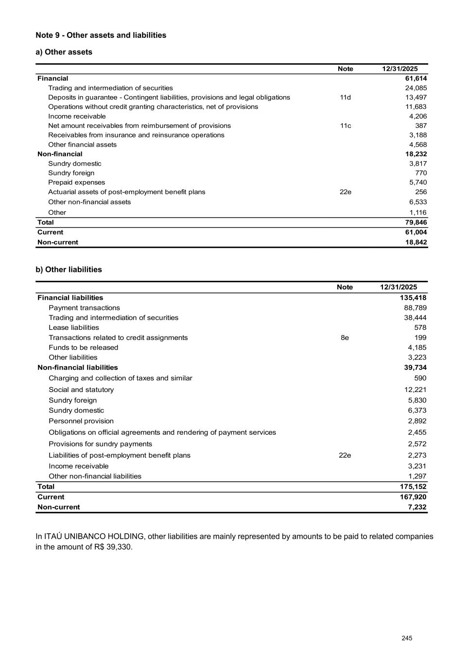 Note 9 - Other assets and liabilities a) Other assets Note 12/31/2025 Financial 61,614 Trading and intermediation of securities 24,085 Deposits in guarantee - Contingent liabilities, provisions and legal obligations 11d 13,497 Operations without credit granting characteristics, net of provisions 11,683 Income receivable 4,206 Net amount receivables from reimbursement of provisions 11c 387 Receivables from insurance and reinsurance operations 3,188 Other financial assets 4,568 Non-financial 18,232 Sundry domestic 3,817 Sundry foreign 770 Prepaid expenses 5,740 Actuarial assets of post-employment benefit plans 22e 256 Other non-financial assets 6,533 Other 1,116 Total 79,846 Current 61,004 Non-current 18,842 b) Other liabilities Note 12/31/2025 Financial liabilities 135,418 Payment transactions 88,789 Trading and intermediation of securities 38,444 Lease liabilities 578 Transactions related to credit assignments 8e 199 Funds to be released 4,185 Other liabilities 3,223 Non-financial liabilities 39,734 Charging and collection of taxes and similar 590 Social and statutory 12,221 Sundry foreign 5,830 Sundry domestic 6,373 Personnel provision 2,892 Obligations on official agreements and rendering of payment services 2,455 Provisions for sundry payments 2,572 Liabilities of post-employment benefit plans 22e 2,273 Income receivable 3,231 Other non-financial liabilities 1,297 Total 175,152 Current 167,920 Non-current 7,232 In ITAÚ UNIBANCO HOLDING, other liabilities are mainly represented by amounts to be paid to related companies in the amount of R$ 39,330. 245