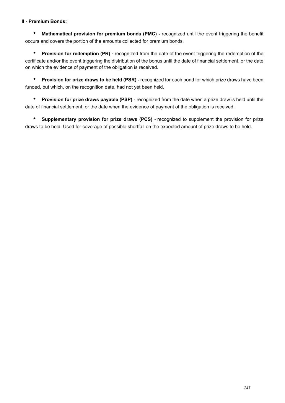 II - Premium Bonds: • Mathematical provision for premium bonds (PMC) - recognized until the event triggering the benefit occurs and covers the portion of the amounts collected for premium bonds. • Provision for redemption (PR) - recognized from the date of the event triggering the redemption of the certificate and/or the event triggering the distribution of the bonus until the date of financial settlement, or the date on which the evidence of payment of the obligation is received. • Provision for prize draws to be held (PSR) - recognized for each bond for which prize draws have been funded, but which, on the recognition date, had not yet been held. • Provision for prize draws payable (PSP) - recognized from the date when a prize draw is held until the date of financial settlement, or the date when the evidence of payment of the obligation is received. • Supplementary provision for prize draws (PCS) - recognized to supplement the provision for prize draws to be held. Used for coverage of possible shortfall on the expected amount of prize draws to be held. 247