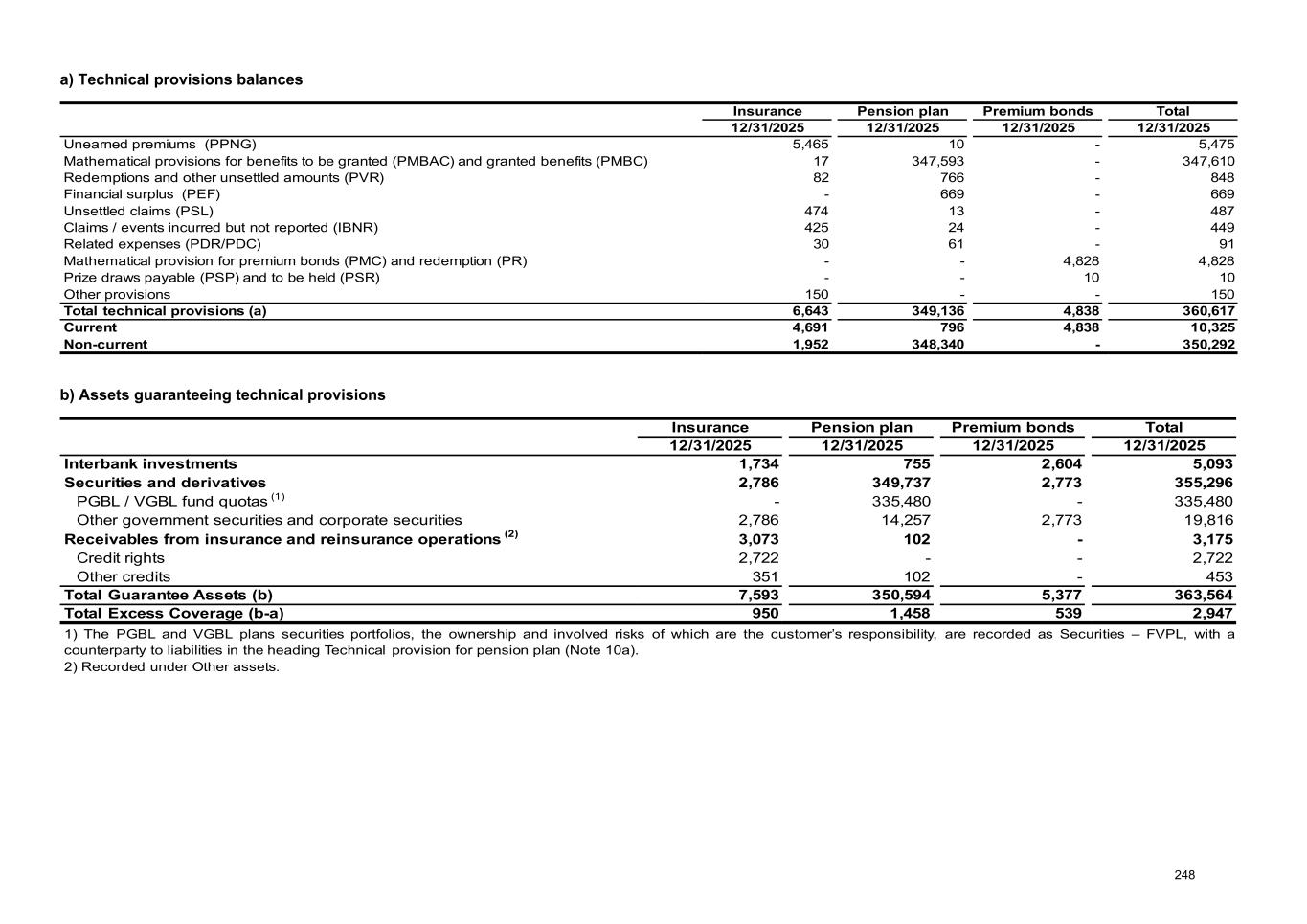 a) Technical provisions balances Insurance Pension plan Premium bonds Total 12/31/2025 12/31/2025 12/31/2025 12/31/2025 Unearned premiums (PPNG) 5,465 10 - 5,475 Mathematical provisions for benefits to be granted (PMBAC) and granted benefits (PMBC) 17 347,593 - 347,610 Redemptions and other unsettled amounts (PVR) 82 766 - 848 Financial surplus (PEF) - 669 - 669 Unsettled claims (PSL) 474 13 - 487 Claims / events incurred but not reported (IBNR) 425 24 - 449 Related expenses (PDR/PDC) 30 61 - 91 Mathematical provision for premium bonds (PMC) and redemption (PR) - - 4,828 4,828 Prize draws payable (PSP) and to be held (PSR) - - 10 10 Other provisions 150 - - 150 Total technical provisions (a) 6,643 349,136 4,838 360,617 Current 4,691 796 4,838 10,325 Non-current 1,952 348,340 - 350,292 b) Assets guaranteeing technical provisions Insurance Pension plan Premium bonds Total 12/31/2025 12/31/2025 12/31/2025 12/31/2025 Interbank investments 1,734 755 2,604 5,093 Securities and derivatives 2,786 349,737 2,773 355,296 PGBL / VGBL fund quotas (1) - 335,480 - 335,480 Other government securities and corporate securities 2,786 14,257 2,773 19,816 Receivables from insurance and reinsurance operations (2) 3,073 102 - 3,175 Credit rights 2,722 - - 2,722 Other credits 351 102 - 453 Total Guarantee Assets (b) 7,593 350,594 5,377 363,564 Total Excess Coverage (b-a) 950 1,458 539 2,947 1) The PGBL and VGBL plans securities portfolios, the ownership and involved risks of which are the customer’s responsibility, are recorded as Securities – FVPL, with a counterparty to liabilities in the heading Technical provision for pension plan (Note 10a). 2) Recorded under Other assets. 248