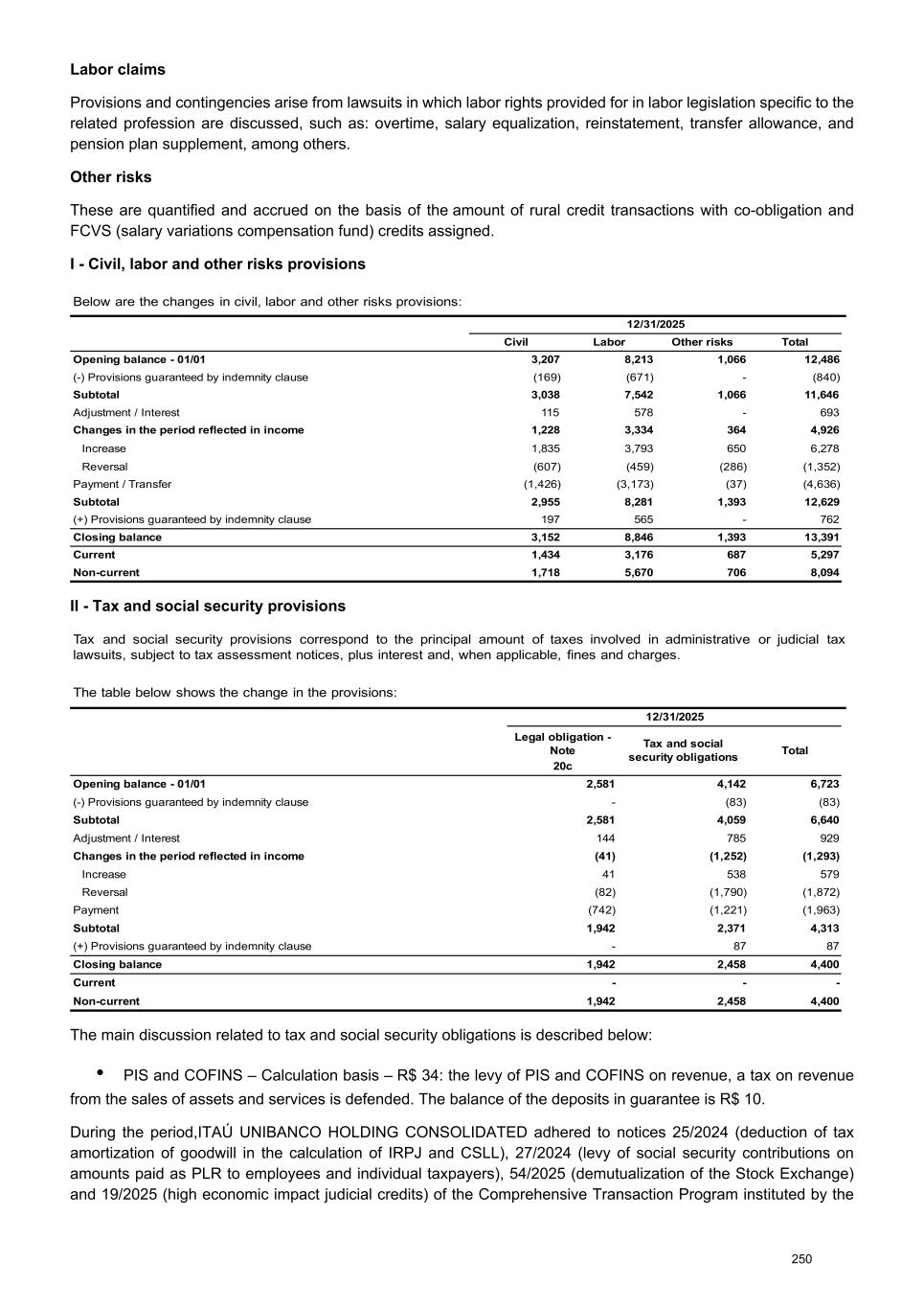 Labor claims Provisions and contingencies arise from lawsuits in which labor rights provided for in labor legislation specific to the related profession are discussed, such as: overtime, salary equalization, reinstatement, transfer allowance, and pension plan supplement, among others. Other risks These are quantified and accrued on the basis of the amount of rural credit transactions with co-obligation and FCVS (salary variations compensation fund) credits assigned. I - Civil, labor and other risks provisions Below are the changes in civil, labor and other risks provisions: 01/01/2025 12/31/2025 01/01/2025 Civil Labor Other risks Total Opening balance - 01/01 3,207 8,213 1,066 12,486 (-) Provisions guaranteed by indemnity clause (169) (671) - (840) Subtotal 3,038 7,542 1,066 11,646 Adjustment / Interest 115 578 - 693 Changes in the period reflected in income 1,228 3,334 364 4,926 Increase 1,835 3,793 650 6,278 Reversal (607) (459) (286) (1,352) Payment / Transfer (1,426) (3,173) (37) (4,636) Subtotal 2,955 8,281 1,393 12,629 (+) Provisions guaranteed by indemnity clause 197 565 - 762 Closing balance 3,152 8,846 1,393 13,391 Current 1,434 3,176 687 5,297 Non-current 1,718 5,670 706 8,094 II - Tax and social security provisions Tax and social security provisions correspond to the principal amount of taxes involved in administrative or judicial tax lawsuits, subject to tax assessment notices, plus interest and, when applicable, fines and charges. The table below shows the change in the provisions: 01/01/2025 12/31/2025 01/01/2025 Legal obligation - Note Tax and social security obligations Total 20c Opening balance - 01/01 2,581 4,142 6,723 (-) Provisions guaranteed by indemnity clause - (83) (83) Subtotal 2,581 4,059 6,640 Adjustment / Interest 144 785 929 Changes in the period reflected in income (41) (1,252) (1,293) Increase 41 538 579 Reversal (82) (1,790) (1,872) Payment (742) (1,221) (1,963) Subtotal 1,942 2,371 4,313 (+) Provisions guaranteed by indemnity clause - 87 87 Closing balance 1,942 2,458 4,400 Current - - - Non-current 1,942 2,458 4,400 The main discussion related to tax and social security obligations is described below: • PIS and COFINS – Calculation basis – R$ 34: the levy of PIS and COFINS on revenue, a tax on revenue from the sales of assets and services is defended. The balance of the deposits in guarantee is R$ 10. During the period,ITAÚ UNIBANCO HOLDING CONSOLIDATED adhered to notices 25/2024 (deduction of tax amortization of goodwill in the calculation of IRPJ and CSLL), 27/2024 (levy of social security contributions on amounts paid as PLR to employees and individual taxpayers), 54/2025 (demutualization of the Stock Exchange) and 19/2025 (high economic impact judicial credits) of the Comprehensive Transaction Program instituted by the 250