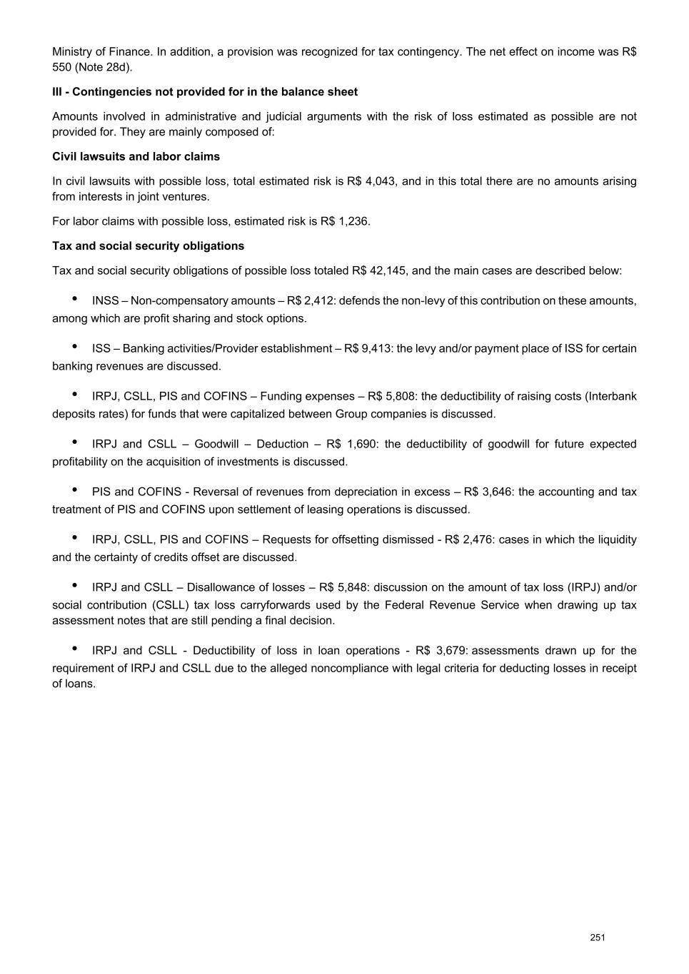 Ministry of Finance. In addition, a provision was recognized for tax contingency. The net effect on income was R$ 550 (Note 28d). III - Contingencies not provided for in the balance sheet Amounts involved in administrative and judicial arguments with the risk of loss estimated as possible are not provided for. They are mainly composed of: Civil lawsuits and labor claims In civil lawsuits with possible loss, total estimated risk is R$ 4,043, and in this total there are no amounts arising from interests in joint ventures. For labor claims with possible loss, estimated risk is R$ 1,236. Tax and social security obligations Tax and social security obligations of possible loss totaled R$ 42,145, and the main cases are described below: • INSS – Non-compensatory amounts – R$ 2,412: defends the non-levy of this contribution on these amounts, among which are profit sharing and stock options. • ISS – Banking activities/Provider establishment – R$ 9,413: the levy and/or payment place of ISS for certain banking revenues are discussed. • IRPJ, CSLL, PIS and COFINS – Funding expenses – R$ 5,808: the deductibility of raising costs (Interbank deposits rates) for funds that were capitalized between Group companies is discussed. • IRPJ and CSLL – Goodwill – Deduction – R$ 1,690: the deductibility of goodwill for future expected profitability on the acquisition of investments is discussed. • PIS and COFINS - Reversal of revenues from depreciation in excess – R$ 3,646: the accounting and tax treatment of PIS and COFINS upon settlement of leasing operations is discussed. • IRPJ, CSLL, PIS and COFINS – Requests for offsetting dismissed - R$ 2,476: cases in which the liquidity and the certainty of credits offset are discussed. • IRPJ and CSLL – Disallowance of losses – R$ 5,848: discussion on the amount of tax loss (IRPJ) and/or social contribution (CSLL) tax loss carryforwards used by the Federal Revenue Service when drawing up tax assessment notes that are still pending a final decision. • IRPJ and CSLL - Deductibility of loss in loan operations - R$ 3,679: assessments drawn up for the requirement of IRPJ and CSLL due to the alleged noncompliance with legal criteria for deducting losses in receipt of loans. 251
