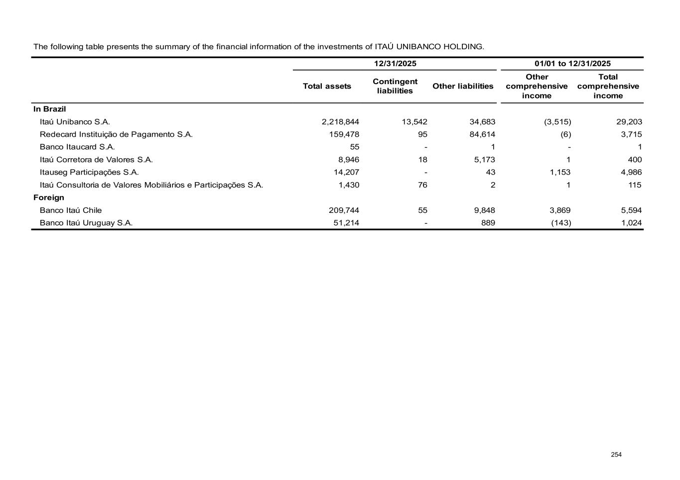 The following table presents the summary of the financial information of the investments of ITAÚ UNIBANCO HOLDING. 12/31/2025 01/01 to 12/31/2025 Total assets Contingent liabilities Other liabilities Other comprehensive income Total comprehensive income In Brazil Itaú Unibanco S.A. 2,218,844 13,542 34,683 (3,515) 29,203 Redecard Instituição de Pagamento S.A. 159,478 95 84,614 (6) 3,715 Banco Itaucard S.A. 55 - 1 - 1 Itaú Corretora de Valores S.A. 8,946 18 5,173 1 400 Itauseg Participações S.A. 14,207 - 43 1,153 4,986 Itaú Consultoria de Valores Mobiliários e Participações S.A. 1,430 76 2 1 115 Foreign Banco Itaú Chile 209,744 55 9,848 3,869 5,594 Banco Itaú Uruguay S.A. 51,214 - 889 (143) 1,024 254
