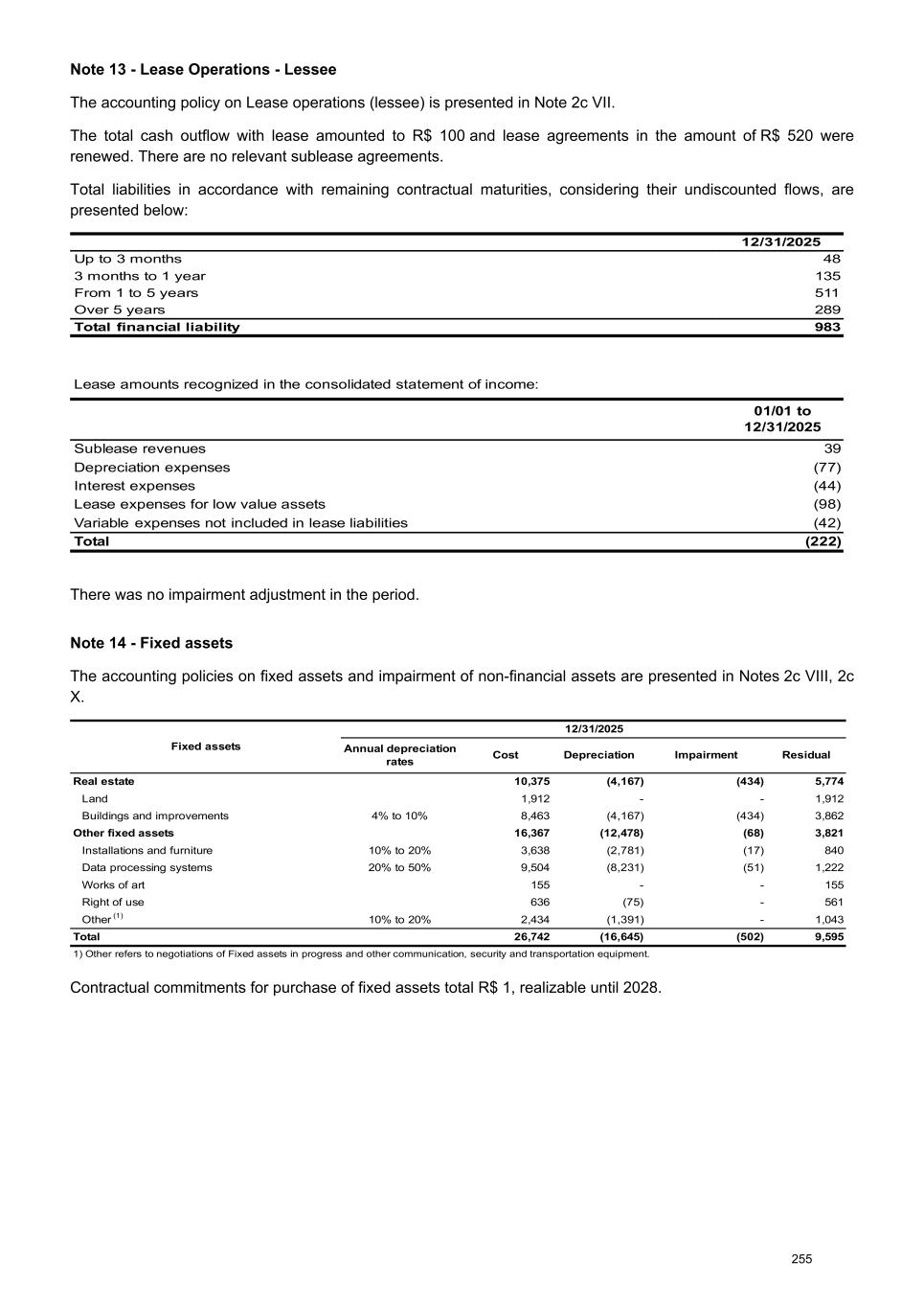 Note 13 - Lease Operations - Lessee The accounting policy on Lease operations (lessee) is presented in Note 2c VII. The total cash outflow with lease amounted to R$ 100 and lease agreements in the amount of R$ 520 were renewed. There are no relevant sublease agreements. Total liabilities in accordance with remaining contractual maturities, considering their undiscounted flows, are presented below: 12/31/2025 Up to 3 months 48 3 months to 1 year 135 From 1 to 5 years 511 Over 5 years 289 Total financial liability 983 Lease amounts recognized in the consolidated statement of income: 01/01 to 12/31/2025 Sublease revenues 39 Depreciation expenses (77) Interest expenses (44) Lease expenses for low value assets (98) Variable expenses not included in lease liabilities (42) Total (222) There was no impairment adjustment in the period. Note 14 - Fixed assets The accounting policies on fixed assets and impairment of non-financial assets are presented in Notes 2c VIII, 2c X. Fixed assets 12/31/2025 Annual depreciation rates Cost Depreciation Impairment Residual Real estate 10,375 (4,167) (434) 5,774 Land 1,912 - - 1,912 Buildings and improvements 4% to 10% 8,463 (4,167) (434) 3,862 Other fixed assets 16,367 (12,478) (68) 3,821 Installations and furniture 10% to 20% 3,638 (2,781) (17) 840 Data processing systems 20% to 50% 9,504 (8,231) (51) 1,222 Works of art 155 - - 155 Right of use 636 (75) - 561 Other (1) 10% to 20% 2,434 (1,391) - 1,043 Total 26,742 (16,645) (502) 9,595 1) Other refers to negotiations of Fixed assets in progress and other communication, security and transportation equipment. Contractual commitments for purchase of fixed assets total R$ 1, realizable until 2028. 255