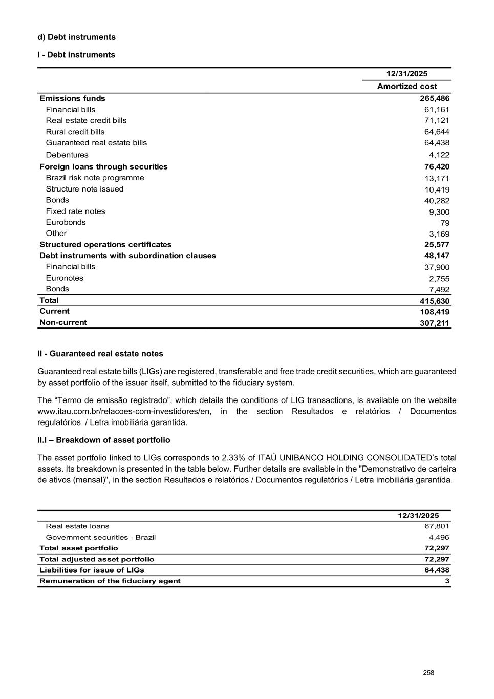 d) Debt instruments I - Debt instruments 12/31/2025 Amortized cost Emissions funds 265,486 Financial bills 61,161 Real estate credit bills 71,121 Rural credit bills 64,644 Guaranteed real estate bills 64,438 Debentures 4,122 Foreign loans through securities 76,420 Brazil risk note programme 13,171 Structure note issued 10,419 Bonds 40,282 Fixed rate notes 9,300 Eurobonds 79 Other 3,169 Structured operations certificates 25,577 Debt instruments with subordination clauses 48,147 Financial bills 37,900 Euronotes 2,755 Bonds 7,492 Total 415,630 Current 108,419 Non-current 307,211 II - Guaranteed real estate notes Guaranteed real estate bills (LIGs) are registered, transferable and free trade credit securities, which are guaranteed by asset portfolio of the issuer itself, submitted to the fiduciary system. The “Termo de emissão registrado”, which details the conditions of LIG transactions, is available on the website www.itau.com.br/relacoes-com-investidores/en, in the section Resultados e relatórios / Documentos regulatórios / Letra imobiliária garantida. Il.l – Breakdown of asset portfolio The asset portfolio linked to LIGs corresponds to 2.33% of ITAÚ UNIBANCO HOLDING CONSOLIDATED’s total assets. Its breakdown is presented in the table below. Further details are available in the "Demonstrativo de carteira de ativos (mensal)", in the section Resultados e relatórios / Documentos regulatórios / Letra imobiliária garantida. 12/31/2025 Real estate loans 67,801 Government securities - Brazil 4,496 Total asset portfolio 72,297 Total adjusted asset portfolio 72,297 Liabilities for issue of LIGs 64,438 Remuneration of the fiduciary agent 3 258