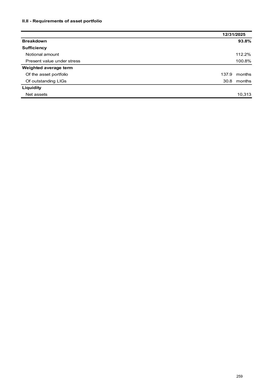 II.II - Requirements of asset portfolio 12/31/2025 Breakdown 93.8% Sufficiency Notional amount 112.2% Present value under stress 100.8% Weighted average term Of the asset portfolio 137.9 months Of outstanding LIGs 30.8 months Liquidity Net assets 10,313 259