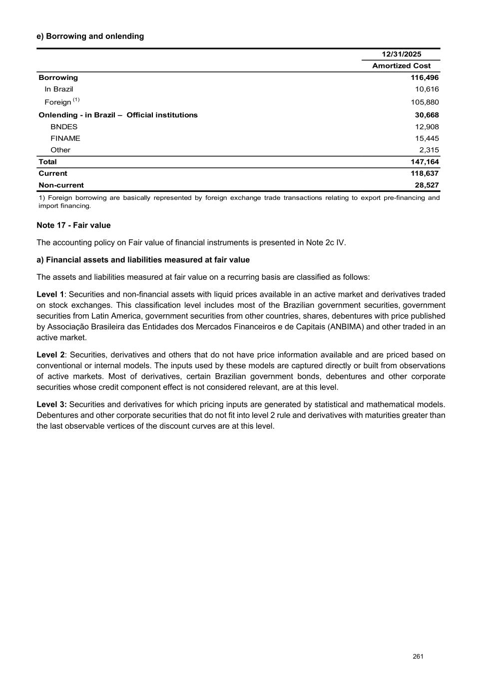 e) Borrowing and onlending 12/31/2025 Amortized Cost Borrowing 116,496 In Brazil 10,616 Foreign (1) 105,880 Onlending - in Brazil – Official institutions 30,668 BNDES 12,908 FINAME 15,445 Other 2,315 Total 147,164 Current 118,637 Non-current 28,527 1) Foreign borrowing are basically represented by foreign exchange trade transactions relating to export pre-financing and import financing. Note 17 - Fair value The accounting policy on Fair value of financial instruments is presented in Note 2c IV. a) Financial assets and liabilities measured at fair value The assets and liabilities measured at fair value on a recurring basis are classified as follows: Level 1: Securities and non-financial assets with liquid prices available in an active market and derivatives traded on stock exchanges. This classification level includes most of the Brazilian government securities, government securities from Latin America, government securities from other countries, shares, debentures with price published by Associação Brasileira das Entidades dos Mercados Financeiros e de Capitais (ANBIMA) and other traded in an active market. Level 2: Securities, derivatives and others that do not have price information available and are priced based on conventional or internal models. The inputs used by these models are captured directly or built from observations of active markets. Most of derivatives, certain Brazilian government bonds, debentures and other corporate securities whose credit component effect is not considered relevant, are at this level. Level 3: Securities and derivatives for which pricing inputs are generated by statistical and mathematical models. Debentures and other corporate securities that do not fit into level 2 rule and derivatives with maturities greater than the last observable vertices of the discount curves are at this level. 261
