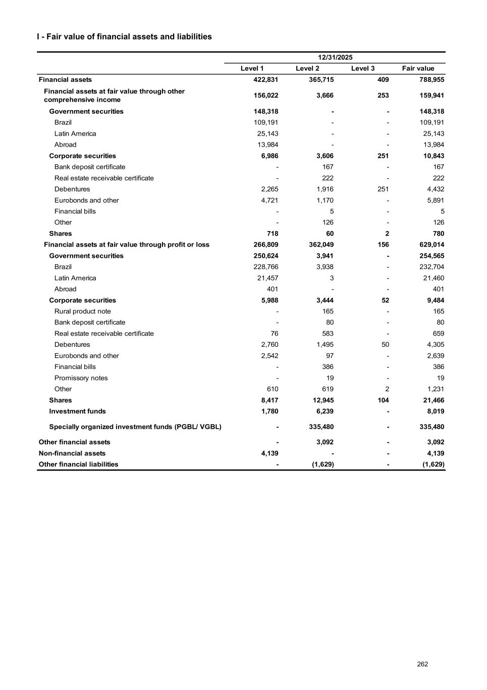 I - Fair value of financial assets and liabilities 12/31/2025 Level 1 Level 2 Level 3 Fair value Financial assets 422,831 365,715 409 788,955 Financial assets at fair value through other comprehensive income 156,022 3,666 253 159,941 Government securities 148,318 - - 148,318 Brazil 109,191 - - 109,191 Latin America 25,143 - - 25,143 Abroad 13,984 - - 13,984 Corporate securities 6,986 3,606 251 10,843 Bank deposit certificate - 167 - 167 Real estate receivable certificate - 222 - 222 Debentures 2,265 1,916 251 4,432 Eurobonds and other 4,721 1,170 - 5,891 Financial bills - 5 - 5 Other - 126 - 126 Shares 718 60 2 780 Financial assets at fair value through profit or loss 266,809 362,049 156 629,014 Government securities 250,624 3,941 - 254,565 Brazil 228,766 3,938 - 232,704 Latin America 21,457 3 - 21,460 Abroad 401 - - 401 Corporate securities 5,988 3,444 52 9,484 Rural product note - 165 - 165 Bank deposit certificate - 80 - 80 Real estate receivable certificate 76 583 - 659 Debentures 2,760 1,495 50 4,305 Eurobonds and other 2,542 97 - 2,639 Financial bills - 386 - 386 Promissory notes - 19 - 19 Other 610 619 2 1,231 Shares 8,417 12,945 104 21,466 Investment funds 1,780 6,239 - 8,019 Specially organized investment funds (PGBL/ VGBL) - 335,480 - 335,480 Other financial assets - 3,092 - 3,092 Non-financial assets 4,139 - - 4,139 Other financial liabilities - (1,629) - (1,629) 262