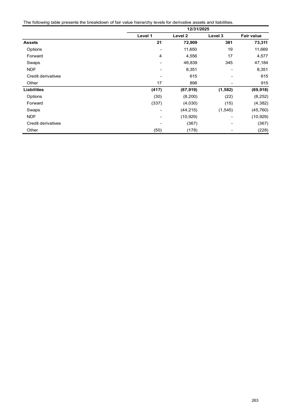 The following table presents the breakdown of fair value hierarchy levels for derivative assets and liabilities. 12/31/2025 Level 1 Level 2 Level 3 Fair value Assets 21 72,909 381 73,311 Options - 11,650 19 11,669 Forward 4 4,556 17 4,577 Swaps - 46,839 345 47,184 NDF - 8,351 - 8,351 Credit derivatives - 615 - 615 Other 17 898 - 915 Liabilities (417) (67,919) (1,582) (69,918) Options (30) (8,200) (22) (8,252) Forward (337) (4,030) (15) (4,382) Swaps - (44,215) (1,545) (45,760) NDF - (10,929) - (10,929) Credit derivatives - (367) - (367) Other (50) (178) - (228) 263
