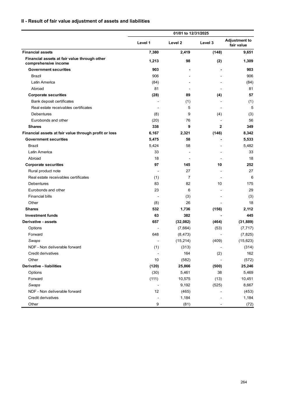 II - Result of fair value adjustment of assets and liabilities 01/01 to 12/31/2025 Level 1 Level 2 Level 3 Adjustment to fair value Financial assets 7,380 2,419 (148) 9,651 Financial assets at fair value through other comprehensive income 1,213 98 (2) 1,309 Government securities 903 - - 903 Brazil 906 - - 906 Latin America (84) - - (84) Abroad 81 - - 81 Corporate securities (28) 89 (4) 57 Bank deposit certificates - (1) - (1) Real estate receivables certificates - 5 - 5 Debentures (8) 9 (4) (3) Eurobonds and other (20) 76 - 56 Shares 338 9 2 349 Financial assets at fair value through profit or loss 6,167 2,321 (146) 8,342 Government securities 5,475 58 - 5,533 Brazil 5,424 58 - 5,482 Latin America 33 - - 33 Abroad 18 - - 18 Corporate securities 97 145 10 252 Rural product note - 27 - 27 Real estate receivables certificates (1) 7 - 6 Debentures 83 82 10 175 Eurobonds and other 23 6 - 29 Financial bills - (3) - (3) Other (8) 26 - 18 Shares 532 1,736 (156) 2,112 Investment funds 63 382 - 445 Derivative - assets 657 (32,082) (464) (31,889) Options - (7,664) (53) (7,717) Forward 648 (8,473) - (7,825) Swaps - (15,214) (409) (15,623) NDF - Non deliverable forward (1) (313) - (314) Credit derivatives - 164 (2) 162 Other 10 (582) - (572) Derivative - liabilities (120) 25,866 (500) 25,246 Options (30) 5,461 38 5,469 Forward (111) 10,575 (13) 10,451 Swaps - 9,192 (525) 8,667 NDF - Non deliverable forward 12 (465) - (453) Credit derivatives - 1,184 - 1,184 Other 9 (81) - (72) 264
