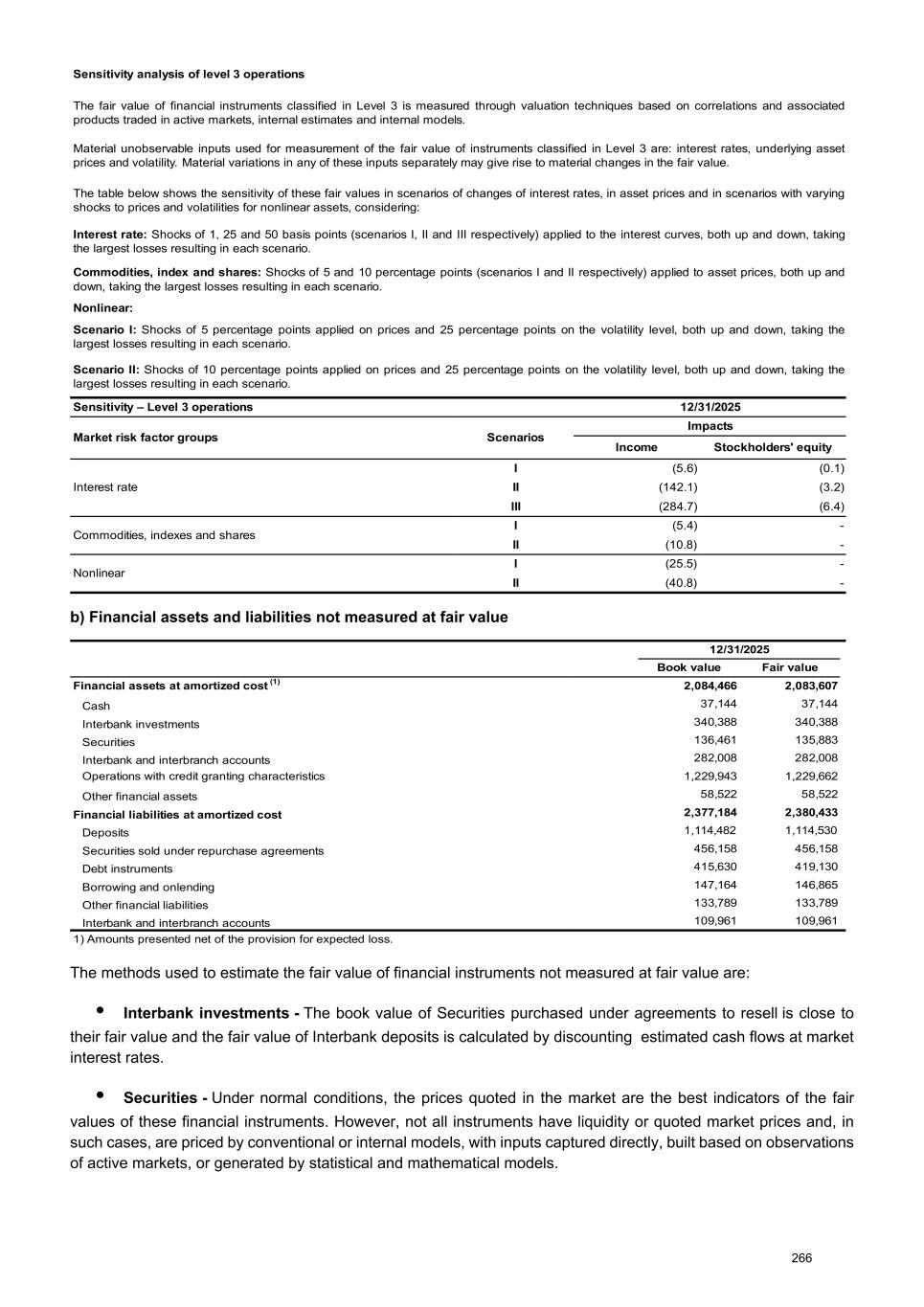 Sensitivity analysis of level 3 operations The fair value of financial instruments classified in Level 3 is measured through valuation techniques based on correlations and associated products traded in active markets, internal estimates and internal models. Material unobservable inputs used for measurement of the fair value of instruments classified in Level 3 are: interest rates, underlying asset prices and volatility. Material variations in any of these inputs separately may give rise to material changes in the fair value. The table below shows the sensitivity of these fair values in scenarios of changes of interest rates, in asset prices and in scenarios with varying shocks to prices and volatilities for nonlinear assets, considering: Interest rate: Shocks of 1, 25 and 50 basis points (scenarios I, II and III respectively) applied to the interest curves, both up and down, taking the largest losses resulting in each scenario. Commodities, index and shares: Shocks of 5 and 10 percentage points (scenarios I and II respectively) applied to asset prices, both up and down, taking the largest losses resulting in each scenario. Nonlinear: Scenario I: Shocks of 5 percentage points applied on prices and 25 percentage points on the volatility level, both up and down, taking the largest losses resulting in each scenario. Scenario II: Shocks of 10 percentage points applied on prices and 25 percentage points on the volatility level, both up and down, taking the largest losses resulting in each scenario. Sensitivity – Level 3 operations 12/31/2025 Market risk factor groups Scenarios Impacts Income Stockholders' equity Interest rate I (5.6) (0.1) II (142.1) (3.2) III (284.7) (6.4) Commodities, indexes and shares I (5.4) - II (10.8) - Nonlinear I (25.5) - II (40.8) - b) Financial assets and liabilities not measured at fair value 12/31/2025 Book value Fair value Financial assets at amortized cost (1) 2,084,466 2,083,607 Cash 37,144 37,144 Interbank investments 340,388 340,388 Securities 136,461 135,883 Interbank and interbranch accounts 282,008 282,008 Operations with credit granting characteristics 1,229,943 1,229,662 Other financial assets 58,522 58,522 Financial liabilities at amortized cost 2,377,184 2,380,433 Deposits 1,114,482 1,114,530 Securities sold under repurchase agreements 456,158 456,158 Debt instruments 415,630 419,130 Borrowing and onlending 147,164 146,865 Other financial liabilities 133,789 133,789 Interbank and interbranch accounts 109,961 109,961 1) Amounts presented net of the provision for expected loss. The methods used to estimate the fair value of financial instruments not measured at fair value are: • Interbank investments - The book value of Securities purchased under agreements to resell is close to their fair value and the fair value of Interbank deposits is calculated by discounting estimated cash flows at market interest rates. • Securities - Under normal conditions, the prices quoted in the market are the best indicators of the fair values of these financial instruments. However, not all instruments have liquidity or quoted market prices and, in such cases, are priced by conventional or internal models, with inputs captured directly, built based on observations of active markets, or generated by statistical and mathematical models. 266