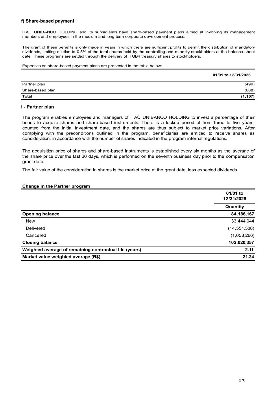 f) Share-based payment ITAÚ UNIBANCO HOLDING and its subsidiaries have share-based payment plans aimed at involving its management members and employees in the medium and long term corporate development process. The grant of these benefits is only made in years in which there are sufficient profits to permit the distribution of mandatory dividends, limiting dilution to 0.5% of the total shares held by the controlling and minority stockholders at the balance sheet date. These programs are settled through the delivery of ITUB4 treasury shares to stockholders. Expenses on share-based payment plans are presented in the table below: 01/01 to 12/31/2025 Partner plan (499) Share-based plan (608) Total (1,107) I - Partner plan The program enables employees and managers of ITAÚ UNIBANCO HOLDING to invest a percentage of their bonus to acquire shares and share-based instruments. There is a lockup period of from three to five years, counted from the initial investment date, and the shares are thus subject to market price variations. After complying with the preconditions outlined in the program, beneficiaries are entitled to receive shares as consideration, in accordance with the number of shares indicated in the program internal regulations. The acquisition price of shares and share-based instruments is established every six months as the average of the share price over the last 30 days, which is performed on the seventh business day prior to the compensation grant date. The fair value of the consideration in shares is the market price at the grant date, less expected dividends. Change in the Partner program 01/01 to 12/31/2025 Quantity Opening balance 84,186,167 New 33,444,044 Delivered (14,551,588) Cancelled (1,058,266) Closing balance 102,020,357 Weighted average of remaining contractual life (years) 2.11 Market value weighted average (R$) 21.24 270
