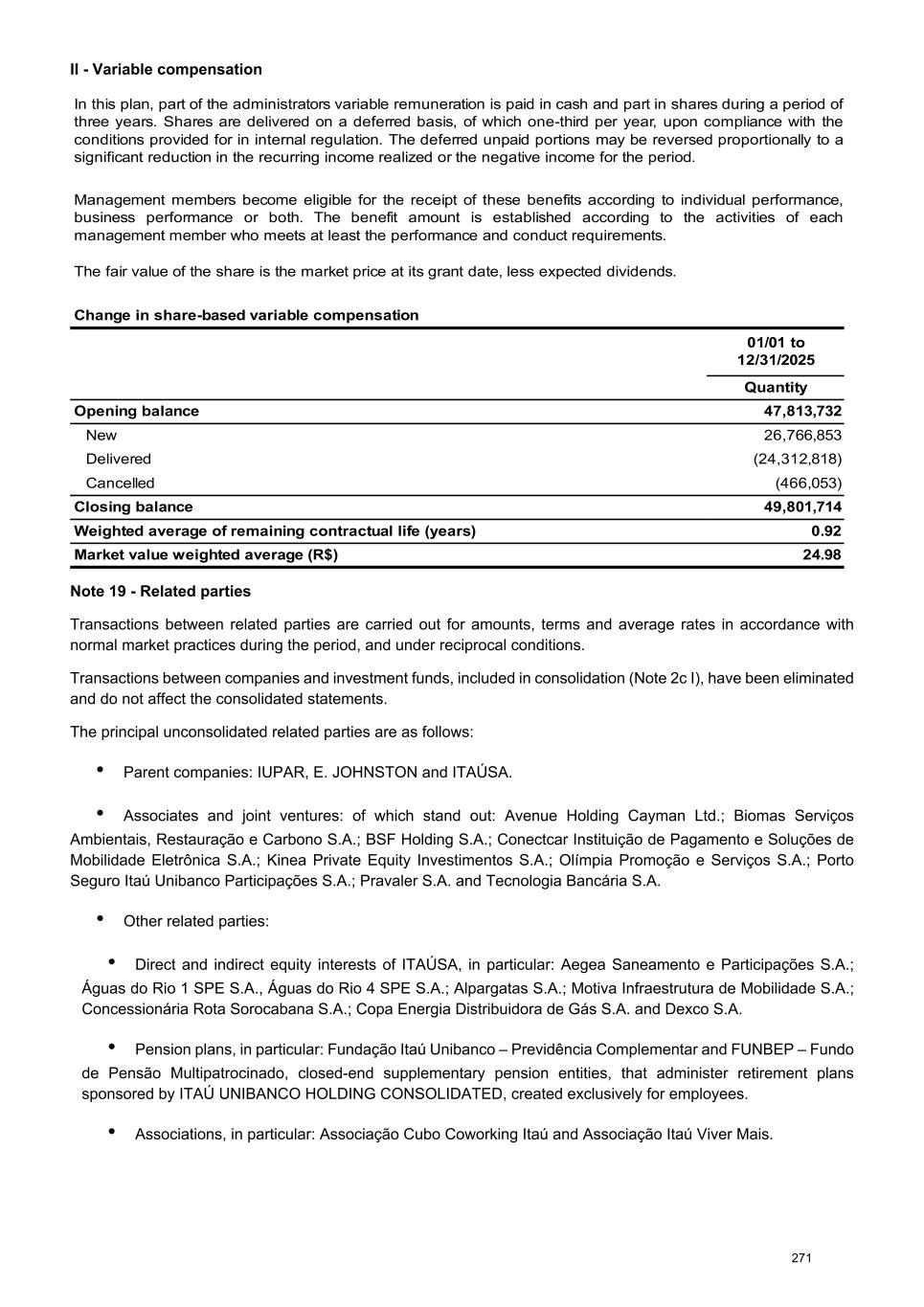 II - Variable compensation In this plan, part of the administrators variable remuneration is paid in cash and part in shares during a period of three years. Shares are delivered on a deferred basis, of which one-third per year, upon compliance with the conditions provided for in internal regulation. The deferred unpaid portions may be reversed proportionally to a significant reduction in the recurring income realized or the negative income for the period. Management members become eligible for the receipt of these benefits according to individual performance, business performance or both. The benefit amount is established according to the activities of each management member who meets at least the performance and conduct requirements. The fair value of the share is the market price at its grant date, less expected dividends. Change in share-based variable compensation 01/01 to 12/31/2025 Quantity Opening balance 47,813,732 New 26,766,853 Delivered (24,312,818) Cancelled (466,053) Closing balance 49,801,714 Weighted average of remaining contractual life (years) 0.92 Market value weighted average (R$) 24.98 Note 19 - Related parties Transactions between related parties are carried out for amounts, terms and average rates in accordance with normal market practices during the period, and under reciprocal conditions. Transactions between companies and investment funds, included in consolidation (Note 2c I), have been eliminated and do not affect the consolidated statements. The principal unconsolidated related parties are as follows: • Parent companies: IUPAR, E. JOHNSTON and ITAÚSA. • Associates and joint ventures: of which stand out: Avenue Holding Cayman Ltd.; Biomas Serviços Ambientais, Restauração e Carbono S.A.; BSF Holding S.A.; Conectcar Instituição de Pagamento e Soluções de Mobilidade Eletrônica S.A.; Kinea Private Equity Investimentos S.A.; Olímpia Promoção e Serviços S.A.; Porto Seguro Itaú Unibanco Participações S.A.; Pravaler S.A. and Tecnologia Bancária S.A. • Other related parties: • Direct and indirect equity interests of ITAÚSA, in particular: Aegea Saneamento e Participações S.A.; Águas do Rio 1 SPE S.A., Águas do Rio 4 SPE S.A.; Alpargatas S.A.; Motiva Infraestrutura de Mobilidade S.A.; Concessionária Rota Sorocabana S.A.; Copa Energia Distribuidora de Gás S.A. and Dexco S.A. • Pension plans, in particular: Fundação Itaú Unibanco – Previdência Complementar and FUNBEP – Fundo de Pensão Multipatrocinado, closed-end supplementary pension entities, that administer retirement plans sponsored by ITAÚ UNIBANCO HOLDING CONSOLIDATED, created exclusively for employees. • Associations, in particular: Associação Cubo Coworking Itaú and Associação Itaú Viver Mais. 271