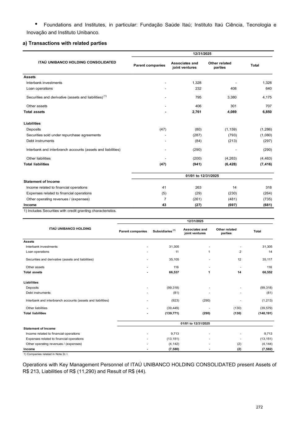 • Foundations and Institutes, in particular: Fundação Saúde Itaú; Instituto Itaú Ciência, Tecnologia e Inovação and Instituto Unibanco. a) Transactions with related parties ITAÚ UNIBANCO HOLDING CONSOLIDATED 12/31/2025 Parent companies Associates and joint ventures Other related parties Total Assets lnterbank investments - 1,328 - 1,328 Loan operations - 232 408 640 Securities and derivative (assets and liabilities) (1) - 795 3,380 4,175 Other assets - 406 301 707 Total assets - 2,761 4,089 6,850 Liabilities Deposits (47) (80) (1,159) (1,286) Securities sold under repurchase agreements - (287) (793) (1,080) Debt instruments - (84) (213) (297) lnterbank and interbranch accounts (assets and liabilities) - (290) - (290) Other liabilities - (200) (4,263) (4,463) Total liabilities (47) (941) (6,428) (7,416) 01/01 to 12/31/2025 Statement of lncome lncome related to financial operations 41 263 14 318 Expenses related to financial operations (5) (29) (230) (264) Other operating revenues / (expenses) 7 (261) (481) (735) lncome 43 (27) (697) (681) 1) Includes Securities with credit granting characteristics. ITAÚ UNIBANCO HOLDING 12/31/2025 Parent companies Subsidiaries (1) Associates and joint ventures Other related parties Total Assets lnterbank investments - 31,305 - - 31,305 Loan operations - 11 1 2 14 Securities and derivative (assets and liabilities) - 35,105 - 12 35,117 Other assets - 116 - - 116 Total assets - 66,537 1 14 66,552 Liabilities Deposits - (99,318) - - (99,318) Debt instruments - (81) - - (81) lnterbank and interbranch accounts (assets and liabilities) - (923) (290) - (1,213) Other liabilities - (39,449) - (130) (39,579) Total liabilities - (139,771) (290) (130) (140,191) 01/01 to 12/31/2025 Statement of lncome lncome related to financial operations - 9,713 - - 9,713 Expenses related to financial operations - (13,151) - - (13,151) Other operating revenues / (expenses) - (4,142) - (2) (4,144) lncome - (7,580) - (2) (7,582) 1) Companies related in Note 2c I. Operations with Key Management Personnel of ITAÚ UNIBANCO HOLDING CONSOLIDATED present Assets of R$ 213, Liabilities of R$ (11,290) and Result of R$ (44). 272