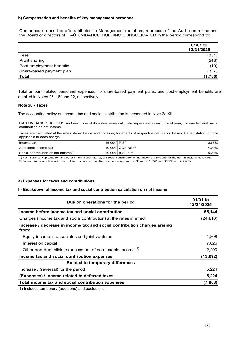 b) Compensation and benefits of key management personnel Compensation and benefits attributed to Management members, members of the Audit committee and the Board of directors of ITAÚ UNIBANCO HOLDING CONSOLIDATED in the period correspond to: 01/01 to 12/31/2025 Fees (851) Profit sharing (548) Post-employment benefits (10) Share-based payment plan (357) Total (1,766) Total amount related personnel expenses, to share-based payment plans, and post-employment benefits are detailed in Notes 26, 18f and 22, respectively. Note 20 - Taxes The accounting policy on income tax and social contribution is presented in Note 2c XIII. ITAÚ UNIBANCO HOLDING and each one of its subsidiaries calculate separately, in each fiscal year, Income tax and social contribution on net income. Taxes are calculated at the rates shown below and consider, for effects of respective calculation bases, the legislation in force applicable to each charge. Income tax 15.00% PIS (2) 0.65% Additional income tax 10.00% COFINS (2) 4.00% Social contribution on net income (1) 20.00% ISS up to 5.00% 1) For insurance, capitalization and other financial subsidiaries, the Social contribution on net income is 15% and for the non-financial ones it is 9%. 2) For non-financial subsidiaries that fall into the non-cumulative calculation system, the PIS rate is 1.65% and COFINS rate is 7.60%. a) Expenses for taxes and contributions I - Breakdown of income tax and social contribution calculation on net income Due on operations for the period 01/01 to 12/31/2025 Income before income tax and social contribution 55,144 Charges (income tax and social contribution) at the rates in effect (24,816) Increase / decrease in income tax and social contribution charges arising from: Equity income in associates and joint ventures 1,808 Interest on capital 7,626 Other non-deductible expenses net of non taxable income (1) 2,290 Income tax and social contribution expenses (13,092) Related to temporary differences Increase / (reversal) for the period 5,224 (Expenses) / income related to deferred taxes 5,224 Total income tax and social contribution expenses (7,868) 1) Includes temporary (additions) and exclusions. 273