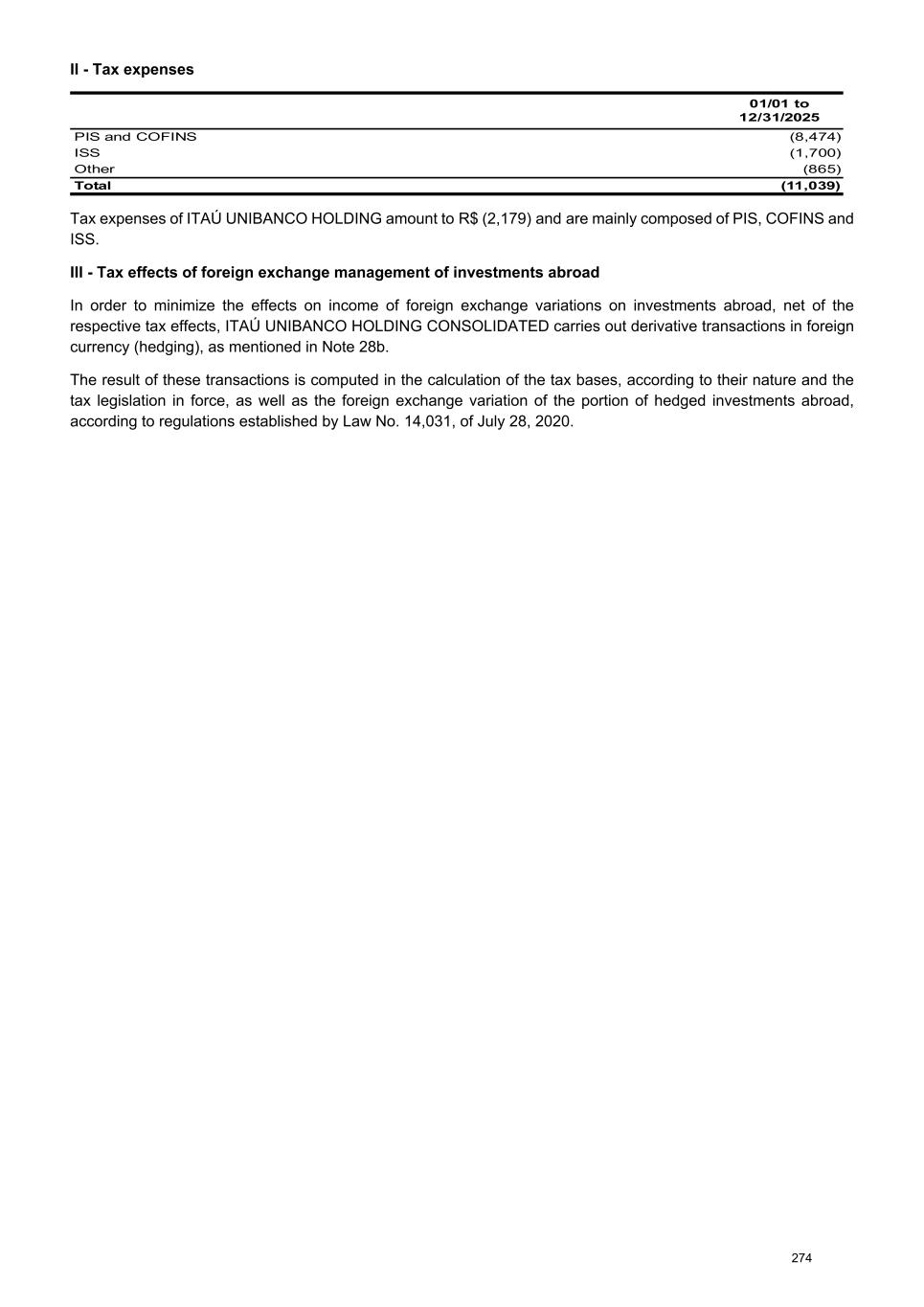 II - Tax expenses 01/01 to 12/31/2025 PIS and COFINS (8,474) ISS (1,700) Other (865) Total (11,039) Tax expenses of ITAÚ UNIBANCO HOLDING amount to R$ (2,179) and are mainly composed of PIS, COFINS and ISS. III - Tax effects of foreign exchange management of investments abroad In order to minimize the effects on income of foreign exchange variations on investments abroad, net of the respective tax effects, ITAÚ UNIBANCO HOLDING CONSOLIDATED carries out derivative transactions in foreign currency (hedging), as mentioned in Note 28b. The result of these transactions is computed in the calculation of the tax bases, according to their nature and the tax legislation in force, as well as the foreign exchange variation of the portion of hedged investments abroad, according to regulations established by Law No. 14,031, of July 28, 2020. 274