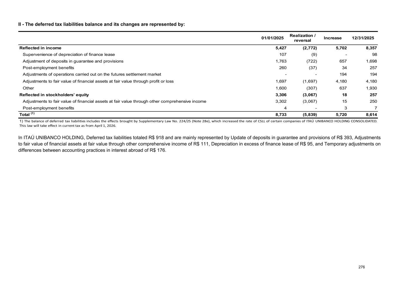 II - The deferred tax liabilities balance and its changes are represented by: [@d9] 01/01/2025 Realization / reversal Increase 12/31/2025 Reflected in income 5,427 (2,772) 5,702 8,357 Supervenience of depreciation of finance lease 107 (9) - 98 Adjustment of deposits in guarantee and provisions 1,763 (722) 657 1,698 Post-employment benefits 260 (37) 34 257 Adjustments of operations carried out on the futures settlement market - - 194 194 Adjustments to fair value of financial assets at fair value through profit or loss 1,697 (1,697) 4,180 4,180 Other 1,600 (307) 637 1,930 Reflected in stockholders’ equity 3,306 (3,067) 18 257 Adjustments to fair value of financial assets at fair value through other comprehensive income 3,302 (3,067) 15 250 Post-employment benefits 4 - 3 7 Total (1) 8,733 (5,839) 5,720 8,614 1) The balance of deferred tax liabilities includes the effects brought by Supplementary Law No. 224/25 (Note 28e), which increased the rate of CSLL of certain companies of ITAÚ UNIBANCO HOLDING CONSOLIDATED. This law will take effect in current tax as from April 1, 2026. In ITAÚ UNIBANCO HOLDING, Deferred tax liabilities totaled R$ 918 and are mainly represented by Update of deposits in guarantee and provisions of R$ 393, Adjustments to fair value of financial assets at fair value through other comprehensive income of R$ 111, Depreciation in excess of finance lease of R$ 95, and Temporary adjustments on differences between accounting practices in interest abroad of R$ 176. 276