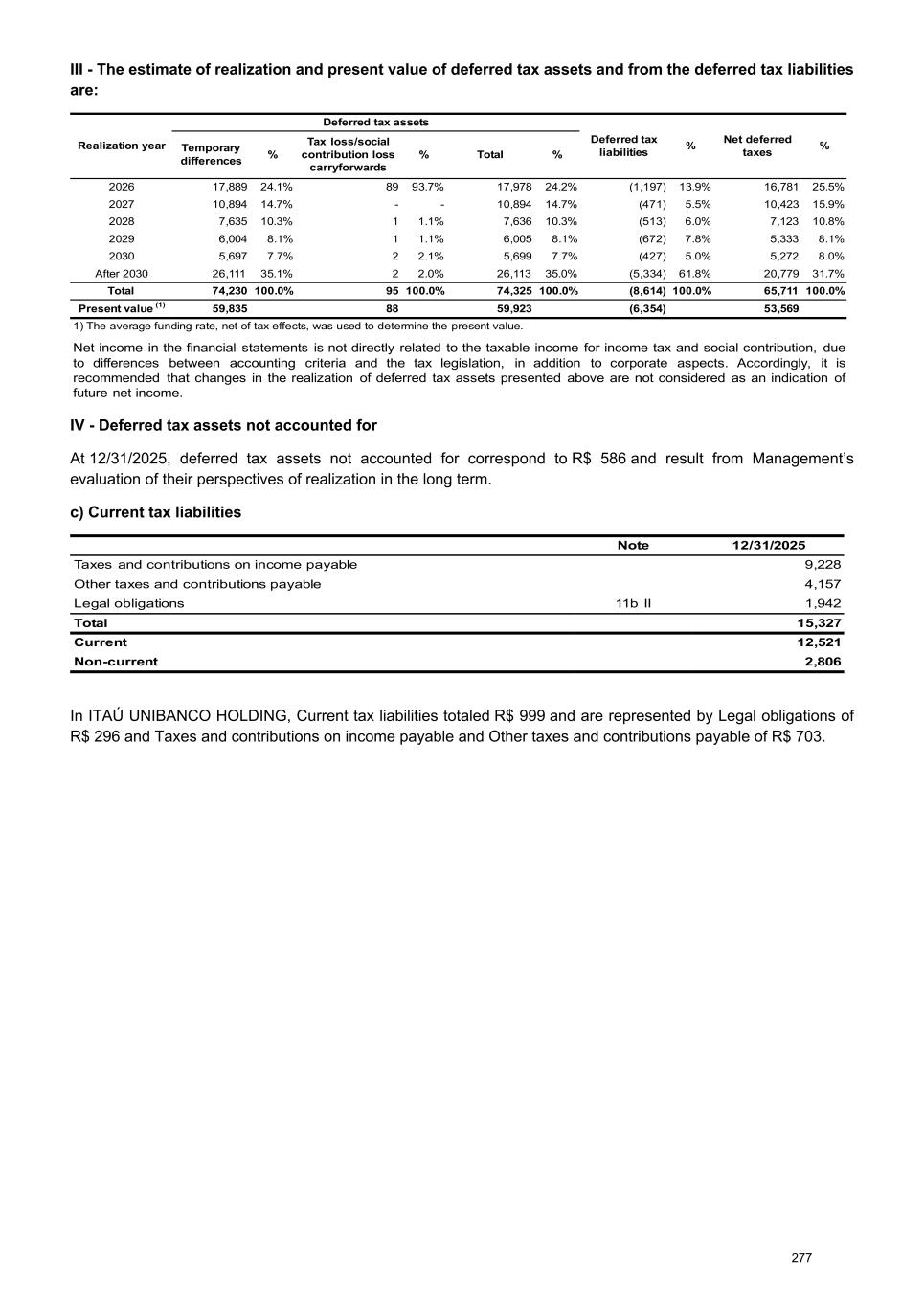 III - The estimate of realization and present value of deferred tax assets and from the deferred tax liabilities are: Realization year Deferred tax assets Deferred tax liabilities % Net deferred taxes %Temporary differences % Tax loss/social contribution loss carryforwards % Total % 2026 17,889 24.1% 89 93.7% 17,978 24.2% (1,197) 13.9% 16,781 25.5% 2027 10,894 14.7% - - 10,894 14.7% (471) 5.5% 10,423 15.9% 2028 7,635 10.3% 1 1.1% 7,636 10.3% (513) 6.0% 7,123 10.8% 2029 6,004 8.1% 1 1.1% 6,005 8.1% (672) 7.8% 5,333 8.1% 2030 5,697 7.7% 2 2.1% 5,699 7.7% (427) 5.0% 5,272 8.0% After 2030 26,111 35.1% 2 2.0% 26,113 35.0% (5,334) 61.8% 20,779 31.7% Total 74,230 100.0% 95 100.0% 74,325 100.0% (8,614) 100.0% 65,711 100.0% Present value (1) 59,835 88 59,923 (6,354) 53,569 1) The average funding rate, net of tax effects, was used to determine the present value. Net income in the financial statements is not directly related to the taxable income for income tax and social contribution, due to differences between accounting criteria and the tax legislation, in addition to corporate aspects. Accordingly, it is recommended that changes in the realization of deferred tax assets presented above are not considered as an indication of future net income. IV - Deferred tax assets not accounted for At 12/31/2025, deferred tax assets not accounted for correspond to R$ 586 and result from Management’s evaluation of their perspectives of realization in the long term. c) Current tax liabilities Note 12/31/2025 Taxes and contributions on income payable 9,228 Other taxes and contributions payable 4,157 Legal obligations 11b II 1,942 Total 15,327 Current 12,521 Non-current 2,806 In ITAÚ UNIBANCO HOLDING, Current tax liabilities totaled R$ 999 and are represented by Legal obligations of R$ 296 and Taxes and contributions on income payable and Other taxes and contributions payable of R$ 703. 277
