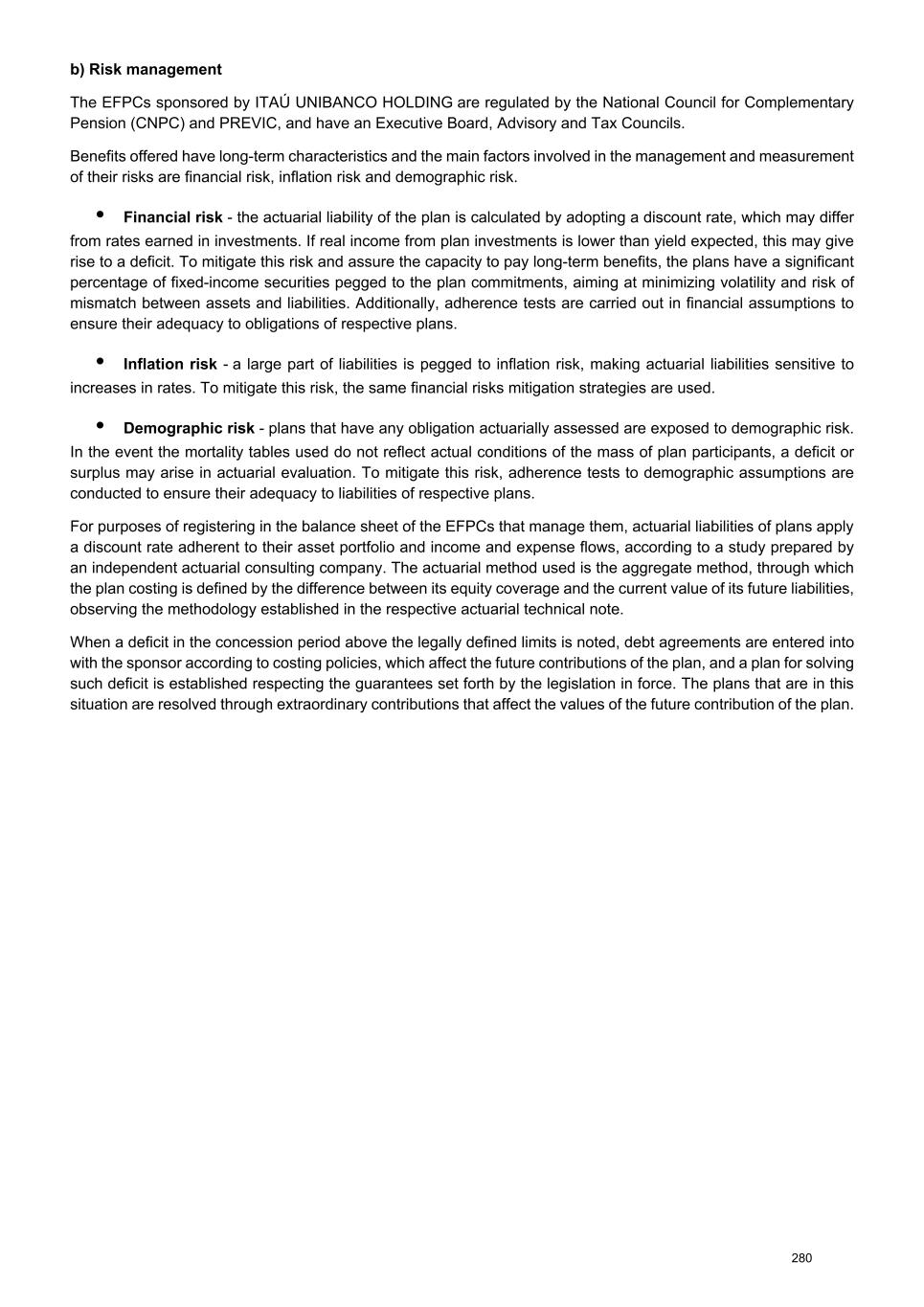 b) Risk management The EFPCs sponsored by ITAÚ UNIBANCO HOLDING are regulated by the National Council for Complementary Pension (CNPC) and PREVIC, and have an Executive Board, Advisory and Tax Councils. Benefits offered have long-term characteristics and the main factors involved in the management and measurement of their risks are financial risk, inflation risk and demographic risk. • Financial risk - the actuarial liability of the plan is calculated by adopting a discount rate, which may differ from rates earned in investments. If real income from plan investments is lower than yield expected, this may give rise to a deficit. To mitigate this risk and assure the capacity to pay long-term benefits, the plans have a significant percentage of fixed-income securities pegged to the plan commitments, aiming at minimizing volatility and risk of mismatch between assets and liabilities. Additionally, adherence tests are carried out in financial assumptions to ensure their adequacy to obligations of respective plans. • Inflation risk - a large part of liabilities is pegged to inflation risk, making actuarial liabilities sensitive to increases in rates. To mitigate this risk, the same financial risks mitigation strategies are used. • Demographic risk - plans that have any obligation actuarially assessed are exposed to demographic risk. In the event the mortality tables used do not reflect actual conditions of the mass of plan participants, a deficit or surplus may arise in actuarial evaluation. To mitigate this risk, adherence tests to demographic assumptions are conducted to ensure their adequacy to liabilities of respective plans. For purposes of registering in the balance sheet of the EFPCs that manage them, actuarial liabilities of plans apply a discount rate adherent to their asset portfolio and income and expense flows, according to a study prepared by an independent actuarial consulting company. The actuarial method used is the aggregate method, through which the plan costing is defined by the difference between its equity coverage and the current value of its future liabilities, observing the methodology established in the respective actuarial technical note. When a deficit in the concession period above the legally defined limits is noted, debt agreements are entered into with the sponsor according to costing policies, which affect the future contributions of the plan, and a plan for solving such deficit is established respecting the guarantees set forth by the legislation in force. The plans that are in this situation are resolved through extraordinary contributions that affect the values of the future contribution of the plan. 280
