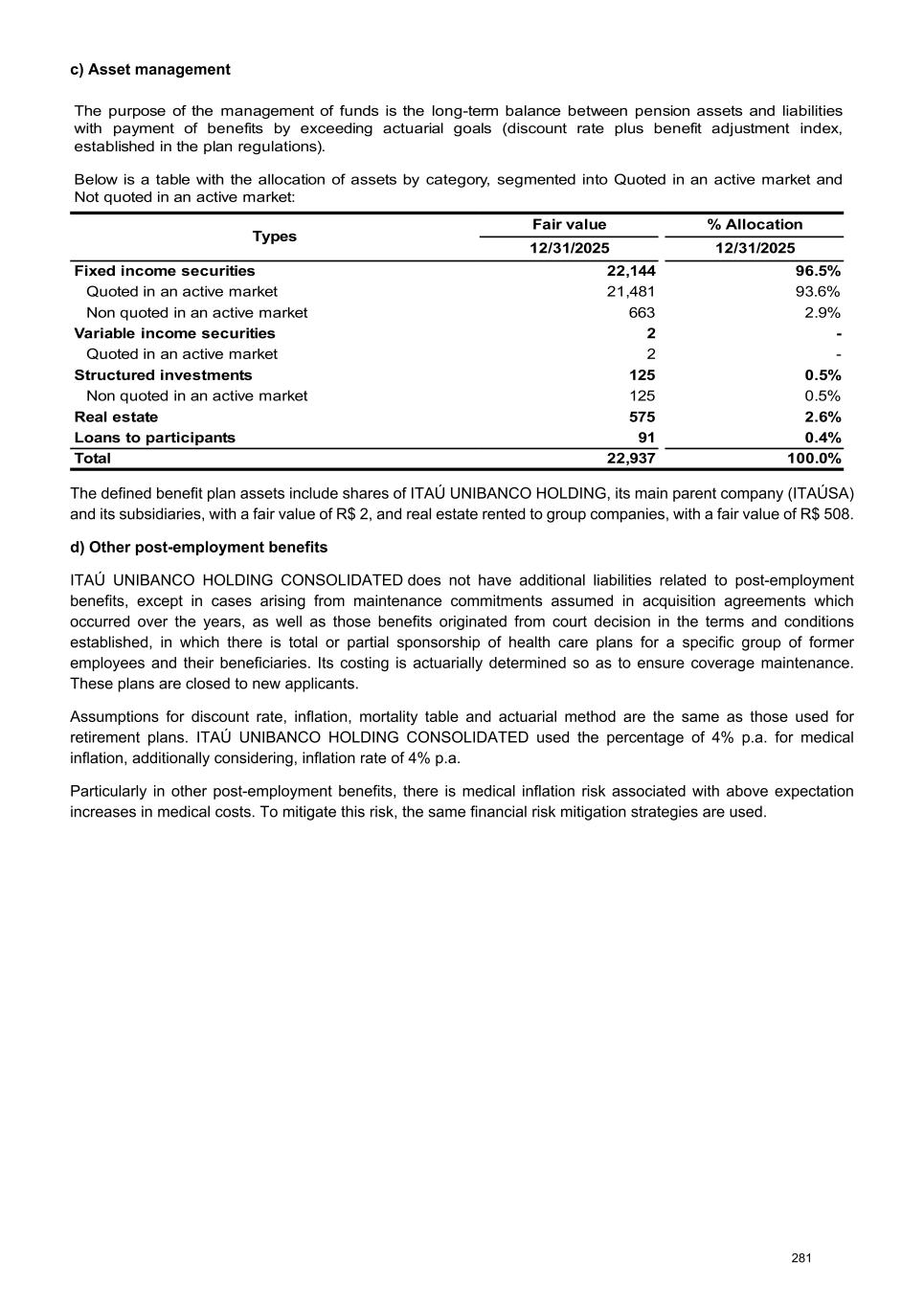 c) Asset management The purpose of the management of funds is the long-term balance between pension assets and liabilities with payment of benefits by exceeding actuarial goals (discount rate plus benefit adjustment index, established in the plan regulations). Below is a table with the allocation of assets by category, segmented into Quoted in an active market and Not quoted in an active market: Types Fair value % Allocation 12/31/2025 12/31/2025 Fixed income securities 22,144 96.5% Quoted in an active market 21,481 93.6% Non quoted in an active market 663 2.9% Variable income securities 2 - Quoted in an active market 2 - Structured investments 125 0.5% Non quoted in an active market 125 0.5% Real estate 575 2.6% Loans to participants 91 0.4% Total 22,937 100.0% The defined benefit plan assets include shares of ITAÚ UNIBANCO HOLDING, its main parent company (ITAÚSA) and its subsidiaries, with a fair value of R$ 2, and real estate rented to group companies, with a fair value of R$ 508. d) Other post-employment benefits ITAÚ UNIBANCO HOLDING CONSOLIDATED does not have additional liabilities related to post-employment benefits, except in cases arising from maintenance commitments assumed in acquisition agreements which occurred over the years, as well as those benefits originated from court decision in the terms and conditions established, in which there is total or partial sponsorship of health care plans for a specific group of former employees and their beneficiaries. Its costing is actuarially determined so as to ensure coverage maintenance. These plans are closed to new applicants. Assumptions for discount rate, inflation, mortality table and actuarial method are the same as those used for retirement plans. ITAÚ UNIBANCO HOLDING CONSOLIDATED used the percentage of 4% p.a. for medical inflation, additionally considering, inflation rate of 4% p.a. Particularly in other post-employment benefits, there is medical inflation risk associated with above expectation increases in medical costs. To mitigate this risk, the same financial risk mitigation strategies are used. 281