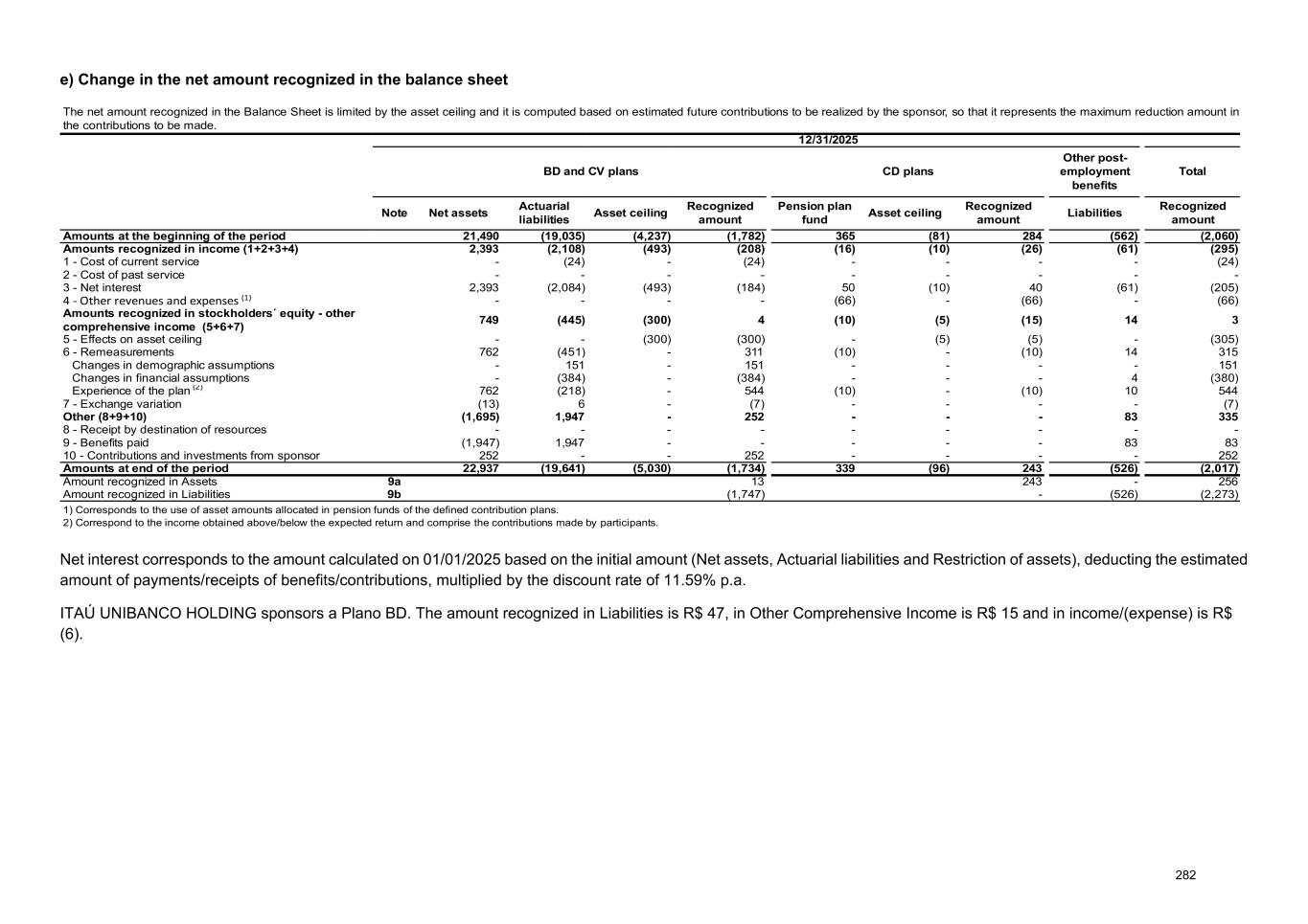 e) Change in the net amount recognized in the balance sheet The net amount recognized in the Balance Sheet is limited by the asset ceiling and it is computed based on estimated future contributions to be realized by the sponsor, so that it represents the maximum reduction amount in the contributions to be made. 12/31/2025 BD and CV plans CD plans Other post- employment benefits Total Note Net assets Actuarial liabilities Asset ceiling Recognized amount Pension plan fund Asset ceiling Recognized amount Liabilities Recognized amount Amounts at the beginning of the period 21,490 (19,035) (4,237) (1,782) 365 (81) 284 (562) (2,060) Amounts recognized in income (1+2+3+4) 2,393 (2,108) (493) (208) (16) (10) (26) (61) (295) 1 - Cost of current service - (24) - (24) - - - - (24) 2 - Cost of past service - - - - - - - - - 3 - Net interest 2,393 (2,084) (493) (184) 50 (10) 40 (61) (205) 4 - Other revenues and expenses (1) - - - - (66) - (66) - (66) Amounts recognized in stockholders´ equity - other comprehensive income (5+6+7) 749 (445) (300) 4 (10) (5) (15) 14 3 5 - Effects on asset ceiling - - (300) (300) - (5) (5) - (305) 6 - Remeasurements 762 (451) - 311 (10) - (10) 14 315 Changes in demographic assumptions - 151 - 151 - - - - 151 Changes in financial assumptions - (384) - (384) - - - 4 (380) Experience of the plan (2) 762 (218) - 544 (10) - (10) 10 544 7 - Exchange variation (13) 6 - (7) - - - - (7) Other (8+9+10) (1,695) 1,947 - 252 - - - 83 335 8 - Receipt by destination of resources - - - - - - - - - 9 - Benefits paid (1,947) 1,947 - - - - - 83 83 10 - Contributions and investments from sponsor 252 - - 252 - - - - 252 Amounts at end of the period 22,937 (19,641) (5,030) (1,734) 339 (96) 243 (526) (2,017) Amount recognized in Assets 9a 13 243 - 256 Amount recognized in Liabilities 9b (1,747) - (526) (2,273) 1) Corresponds to the use of asset amounts allocated in pension funds of the defined contribution plans. 2) Correspond to the income obtained above/below the expected return and comprise the contributions made by participants. Net interest corresponds to the amount calculated on 01/01/2025 based on the initial amount (Net assets, Actuarial liabilities and Restriction of assets), deducting the estimated amount of payments/receipts of benefits/contributions, multiplied by the discount rate of 11.59% p.a. ITAÚ UNIBANCO HOLDING sponsors a Plano BD. The amount recognized in Liabilities is R$ 47, in Other Comprehensive Income is R$ 15 and in income/(expense) is R$ (6). 282