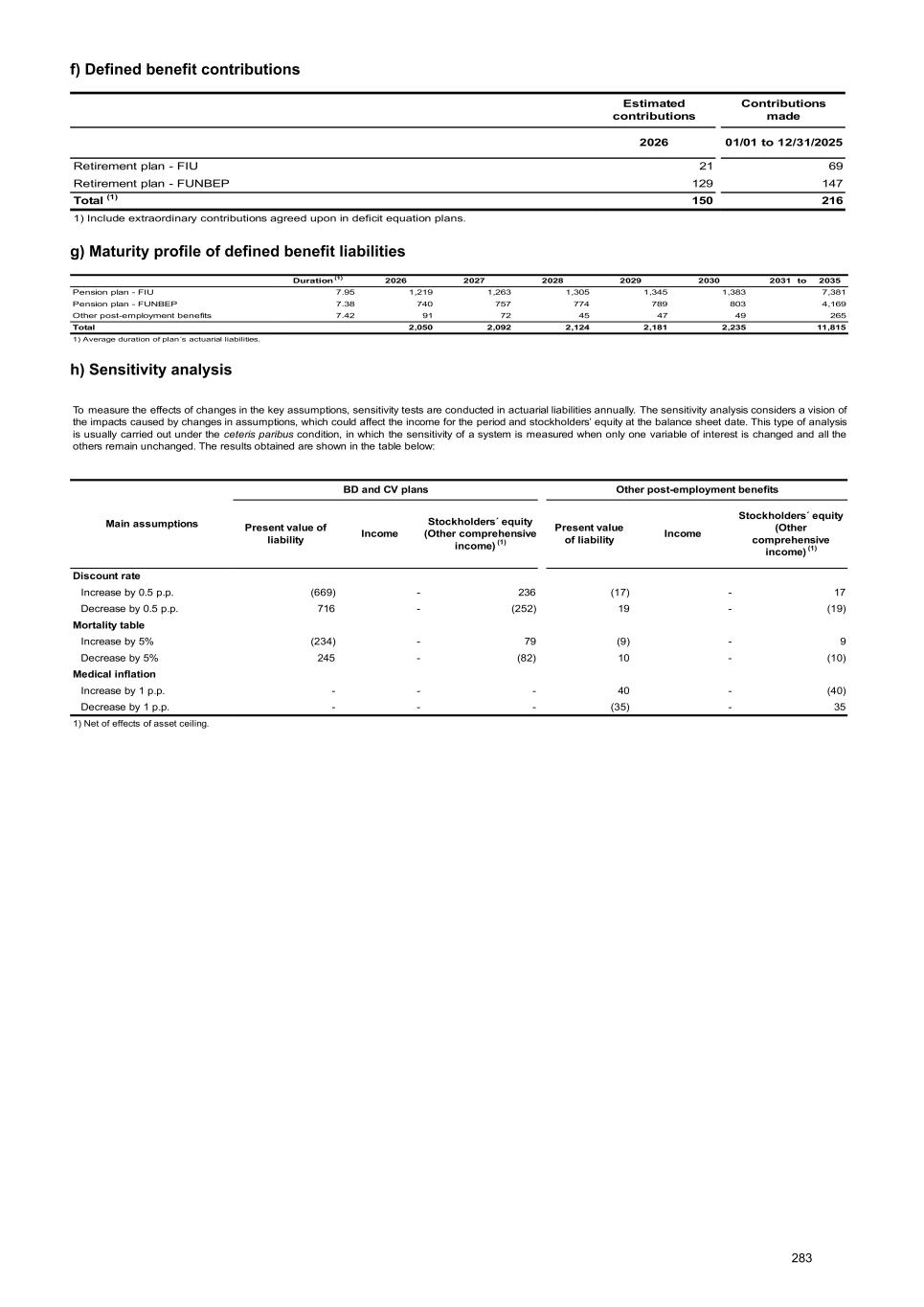 f) Defined benefit contributions Estimated contributions Contributions made 2026 01/01 to 12/31/2025 Retirement plan - FIU 21 69 Retirement plan - FUNBEP 129 147 Total (1) 150 216 1) Include extraordinary contributions agreed upon in deficit equation plans. g) Maturity profile of defined benefit liabilities Duration (1) 2026 2027 2028 2029 2030 2031 to 2035 Pension plan - FIU 7.95 1,219 1,263 1,305 1,345 1,383 7,381 Pension plan - FUNBEP 7.38 740 757 774 789 803 4,169 Other post-employment benefits 7.42 91 72 45 47 49 265 Total 2,050 2,092 2,124 2,181 2,235 11,815 1) Average duration of plan´s actuarial liabilities. h) Sensitivity analysis To measure the effects of changes in the key assumptions, sensitivity tests are conducted in actuarial liabilities annually. The sensitivity analysis considers a vision of the impacts caused by changes in assumptions, which could affect the income for the period and stockholders’ equity at the balance sheet date. This type of analysis is usually carried out under the ceteris paribus condition, in which the sensitivity of a system is measured when only one variable of interest is changed and all the others remain unchanged. The results obtained are shown in the table below: Main assumptions BD and CV plans Other post-employment benefits Present value of liability Income Stockholders´ equity (Other comprehensive income) (1) Present value of liability Income Stockholders´ equity (Other comprehensive income) (1) Discount rate Increase by 0.5 p.p. (669) - 236 (17) - 17 Decrease by 0.5 p.p. 716 - (252) 19 - (19) Mortality table Increase by 5% (234) - 79 (9) - 9 Decrease by 5% 245 - (82) 10 - (10) Medical inflation Increase by 1 p.p. - - - 40 - (40) Decrease by 1 p.p. - - - (35) - 35 1) Net of effects of asset ceiling. 283