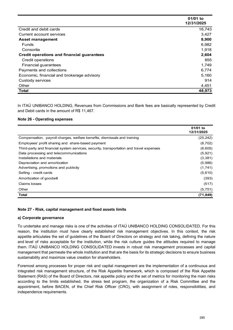 01/01 to 12/31/2025 Credit and debit cards 16,743 Current account services 3,427 Asset management 8,900 Funds 6,982 Consortia 1,918 Credit operations and financial guarantees 2,604 Credit operations 855 Financial guarantees 1,749 Payments and collections 6,774 Economic, financial and brokerage advisory 5,160 Custody services 914 Other 4,451 Total 48,973 In ITAÚ UNIBANCO HOLDING, Revenues from Commissions and Bank fees are basically represented by Credit and Debit cards in the amount of R$ 11,467. Note 26 - Operating expenses 01/01 to 12/31/2025 Compensation, payroll charges, welfare benefits, dismissals and training (25,242) Employees’ profit sharing and share-based payment (8,702) Third-party and financial system services, security, transportation and travel expenses (8,605) Data processing and telecommunications (5,921) Installations and materials (3,381) Depreciation and amortization (5,986) Advertising, promotions and publicity (1,741) Selling - credit cards (5,610) Amortization of goodwill (393) Claims losses (517) Other (5,751) Total (71,849) Note 27 - Risk, capital management and fixed assets limits a) Corporate governance To undertake and manage risks is one of the activities of ITAÚ UNIBANCO HOLDING CONSOLIDATED. For this reason, the institution must have clearly established risk management objectives. In this context, the risk appetite articulates the set of guidelines of the Board of Directors on strategy and risk taking, defining the nature and level of risks acceptable for the institution, while the risk culture guides the attitudes required to manage them. ITAÚ UNIBANCO HOLDING CONSOLIDATED invests in robust risk management processes and capital management that permeate the whole institution and that are the basis for its strategic decisions to ensure business sustainability and maximize value creation for shareholders. Foremost among processes for proper risk and capital management are the implementation of a continuous and integrated risk management structure, of the Risk Appetite framework, which is composed of the Risk Appetite Statement (RAS) of the Board of Directors, risk appetite policy and the set of metrics for monitoring the main risks according to the limits established, the stress test program, the organization of a Risk Committee and the appointment, before BACEN, of the Chief Risk Officer (CRO), with assignment of roles, responsibilities, and independence requirements. 285