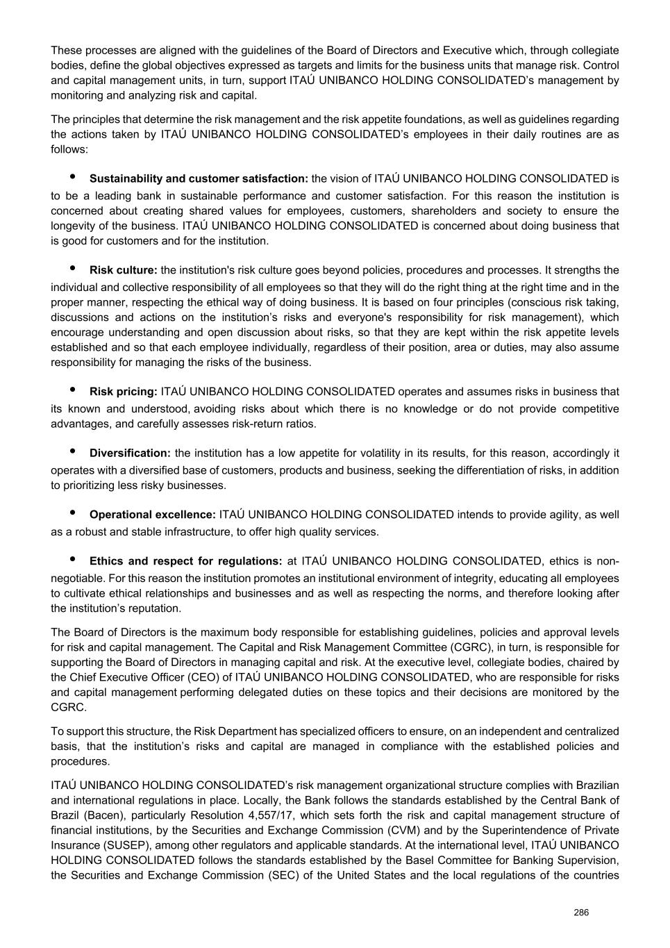 These processes are aligned with the guidelines of the Board of Directors and Executive which, through collegiate bodies, define the global objectives expressed as targets and limits for the business units that manage risk. Control and capital management units, in turn, support ITAÚ UNIBANCO HOLDING CONSOLIDATED’s management by monitoring and analyzing risk and capital. The principles that determine the risk management and the risk appetite foundations, as well as guidelines regarding the actions taken by ITAÚ UNIBANCO HOLDING CONSOLIDATED’s employees in their daily routines are as follows: • Sustainability and customer satisfaction: the vision of ITAÚ UNIBANCO HOLDING CONSOLIDATED is to be a leading bank in sustainable performance and customer satisfaction. For this reason the institution is concerned about creating shared values for employees, customers, shareholders and society to ensure the longevity of the business. ITAÚ UNIBANCO HOLDING CONSOLIDATED is concerned about doing business that is good for customers and for the institution. • Risk culture: the institution's risk culture goes beyond policies, procedures and processes. It strengths the individual and collective responsibility of all employees so that they will do the right thing at the right time and in the proper manner, respecting the ethical way of doing business. It is based on four principles (conscious risk taking, discussions and actions on the institution’s risks and everyone's responsibility for risk management), which encourage understanding and open discussion about risks, so that they are kept within the risk appetite levels established and so that each employee individually, regardless of their position, area or duties, may also assume responsibility for managing the risks of the business. • Risk pricing: ITAÚ UNIBANCO HOLDING CONSOLIDATED operates and assumes risks in business that its known and understood, avoiding risks about which there is no knowledge or do not provide competitive advantages, and carefully assesses risk-return ratios. • Diversification: the institution has a low appetite for volatility in its results, for this reason, accordingly it operates with a diversified base of customers, products and business, seeking the differentiation of risks, in addition to prioritizing less risky businesses. • Operational excellence: ITAÚ UNIBANCO HOLDING CONSOLIDATED intends to provide agility, as well as a robust and stable infrastructure, to offer high quality services. • Ethics and respect for regulations: at ITAÚ UNIBANCO HOLDING CONSOLIDATED, ethics is non- negotiable. For this reason the institution promotes an institutional environment of integrity, educating all employees to cultivate ethical relationships and businesses and as well as respecting the norms, and therefore looking after the institution’s reputation. The Board of Directors is the maximum body responsible for establishing guidelines, policies and approval levels for risk and capital management. The Capital and Risk Management Committee (CGRC), in turn, is responsible for supporting the Board of Directors in managing capital and risk. At the executive level, collegiate bodies, chaired by the Chief Executive Officer (CEO) of ITAÚ UNIBANCO HOLDING CONSOLIDATED, who are responsible for risks and capital management performing delegated duties on these topics and their decisions are monitored by the CGRC. To support this structure, the Risk Department has specialized officers to ensure, on an independent and centralized basis, that the institution’s risks and capital are managed in compliance with the established policies and procedures. ITAÚ UNIBANCO HOLDING CONSOLIDATED’s risk management organizational structure complies with Brazilian and international regulations in place. Locally, the Bank follows the standards established by the Central Bank of Brazil (Bacen), particularly Resolution 4,557/17, which sets forth the risk and capital management structure of financial institutions, by the Securities and Exchange Commission (CVM) and by the Superintendence of Private Insurance (SUSEP), among other regulators and applicable standards. At the international level, ITAÚ UNIBANCO HOLDING CONSOLIDATED follows the standards established by the Basel Committee for Banking Supervision, the Securities and Exchange Commission (SEC) of the United States and the local regulations of the countries 286